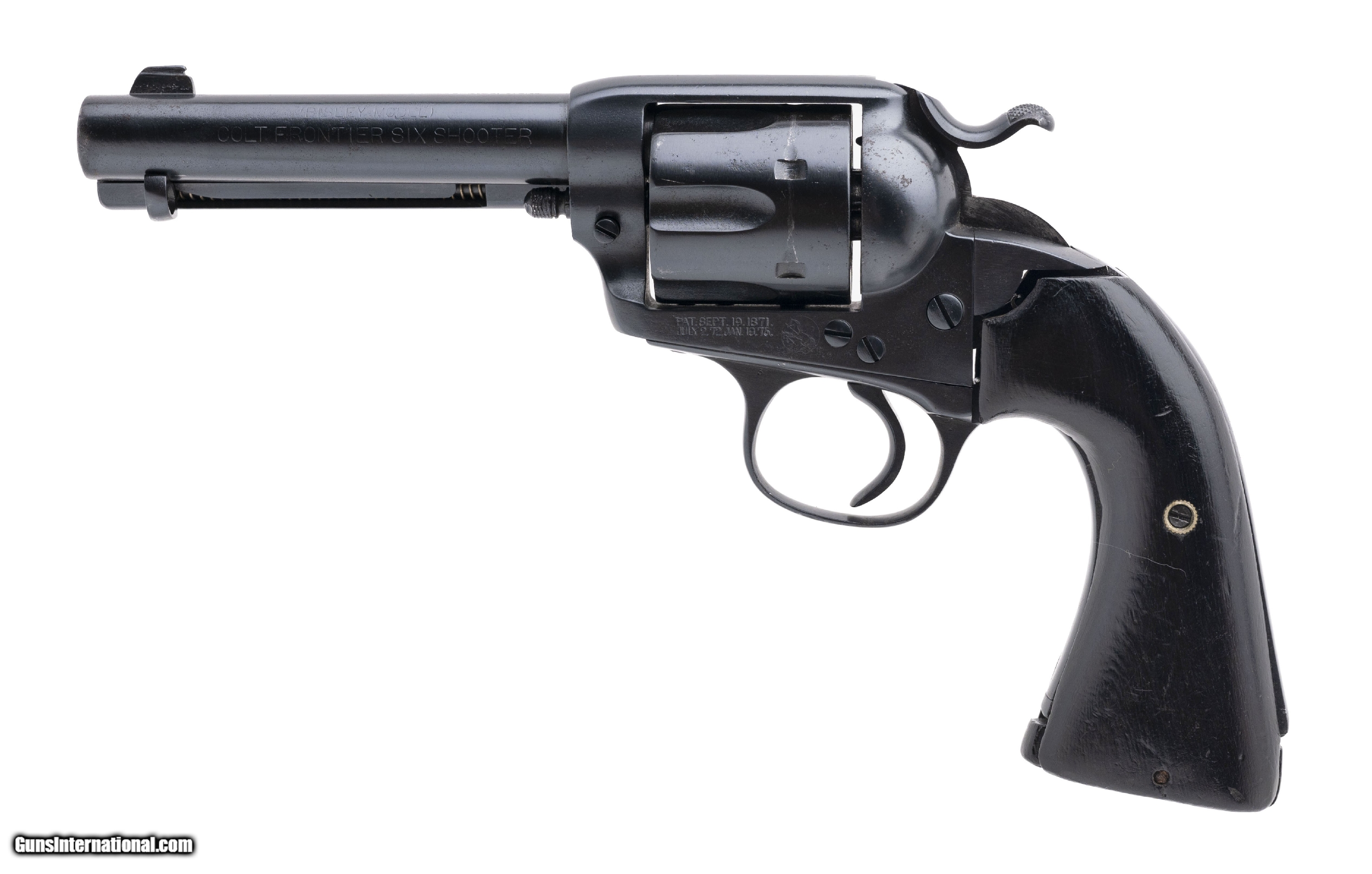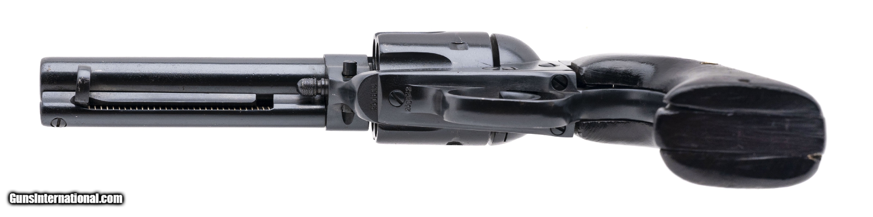 Description: "SN: 260522. Made in 1904, .44-40 with a 4.75"" barrel. Bore is good, lightly pitted with visible rifling. 1st Gen single action Bisley revolver. Has been reblued and looks good. Has custom wood grips. Overall very good condition. (CONSIGNMENT) SOLD |