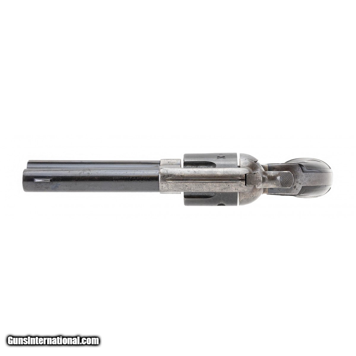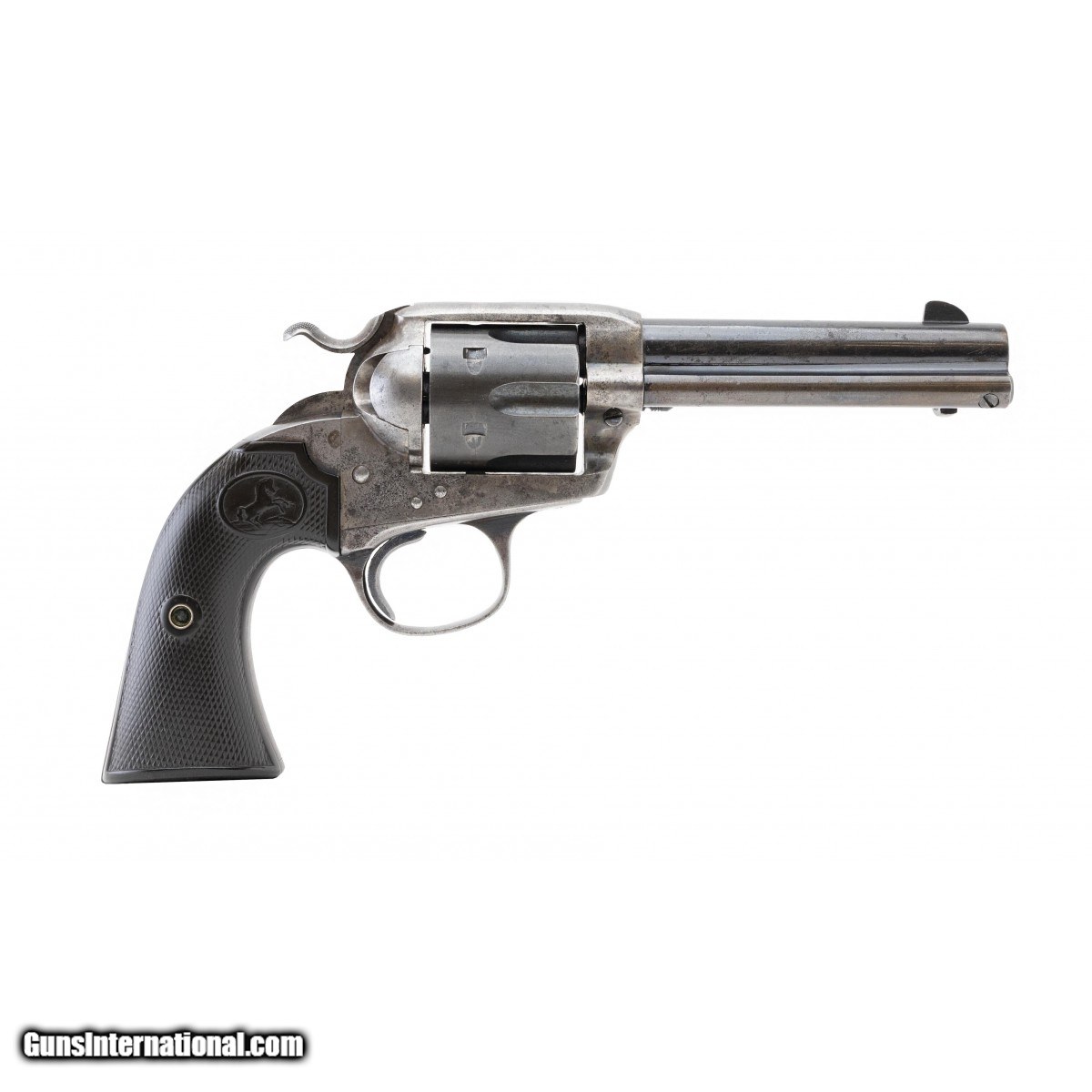 Description: " This 32 W.C.F. (32-20) Colt Bisley Model revolver is circa 1912, the year that the Bisley Model was discontinued. The 4.75"" barrel has a fine bore with frosting in the grooves. The barrel has approx. 80% blue with the remainder turning plum. There are a couple of small nicks below the Bisley Model marking on the barrel. The grip straps are a gray-brown. The case colored frame and hammer have traces of colors showing in protected areas with the remainder turned silver. The hard rubber rampant Colt grips are fine with with light wear but no cracks or chips. The action is tight and it functions correctly. This 109 year old Colt Bisley Model revolver is in very nice shape for its age. SOLD Curio/Relic: Yes |