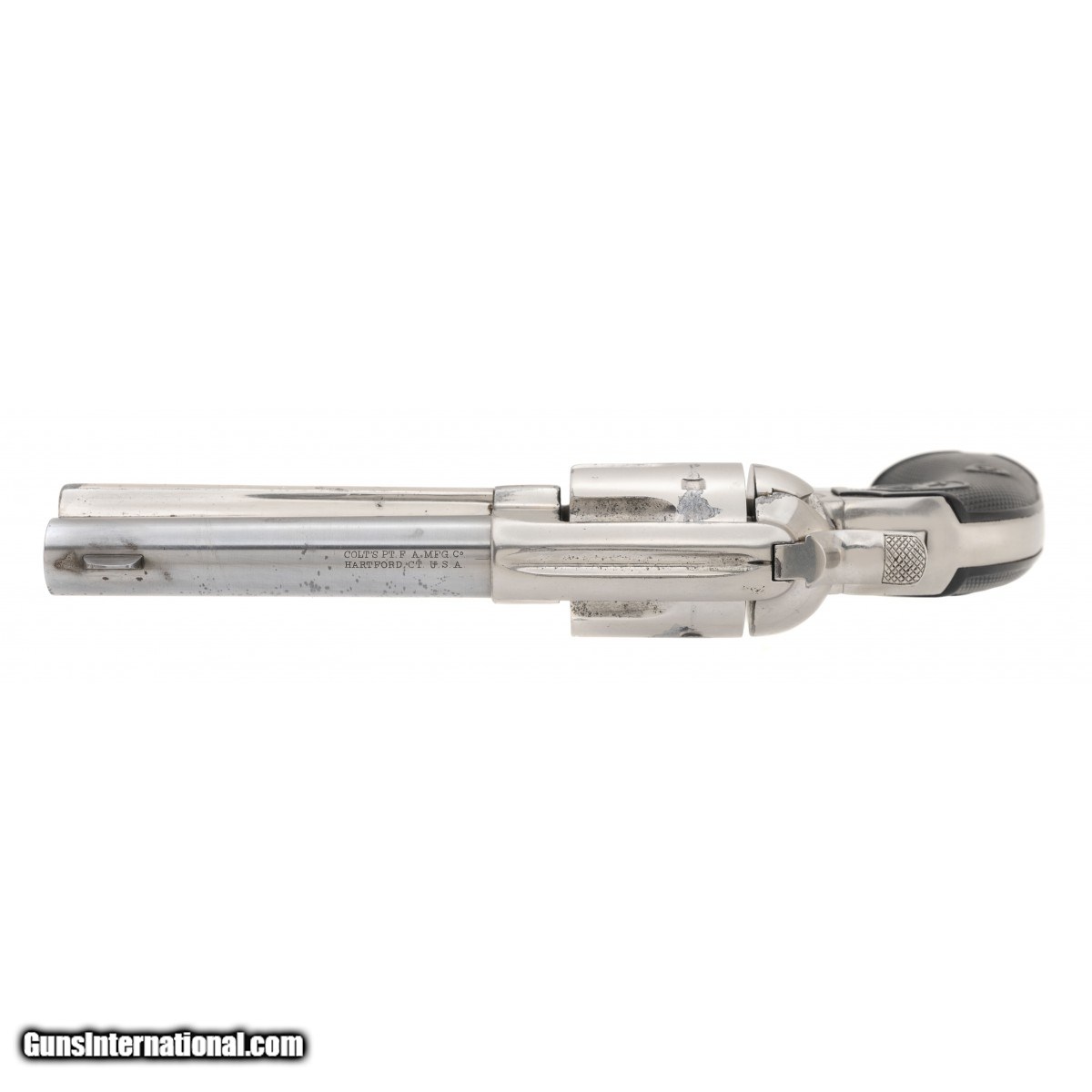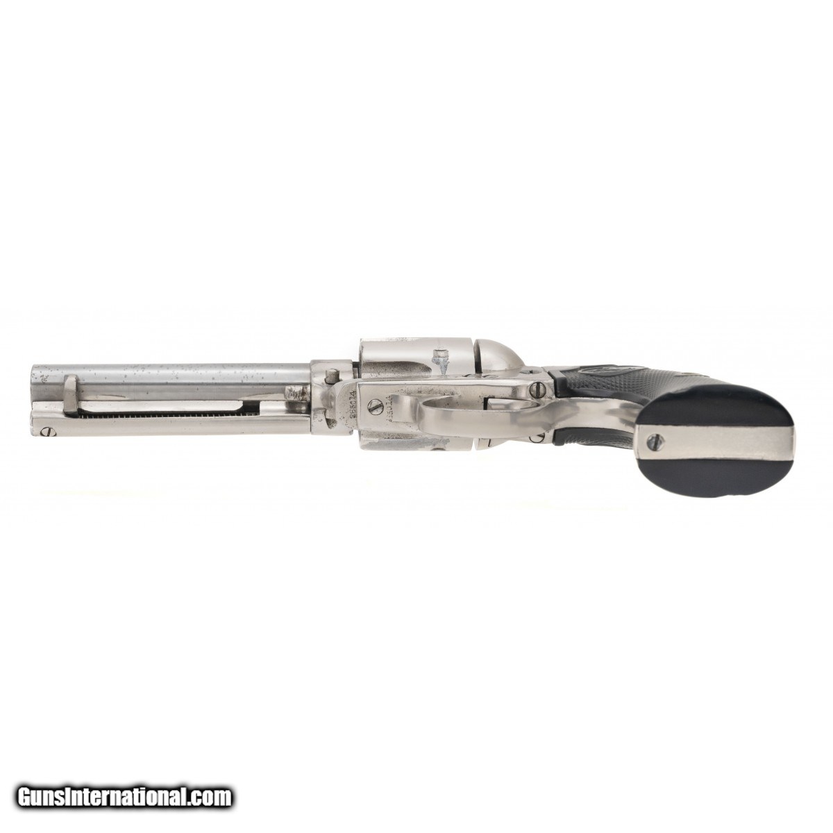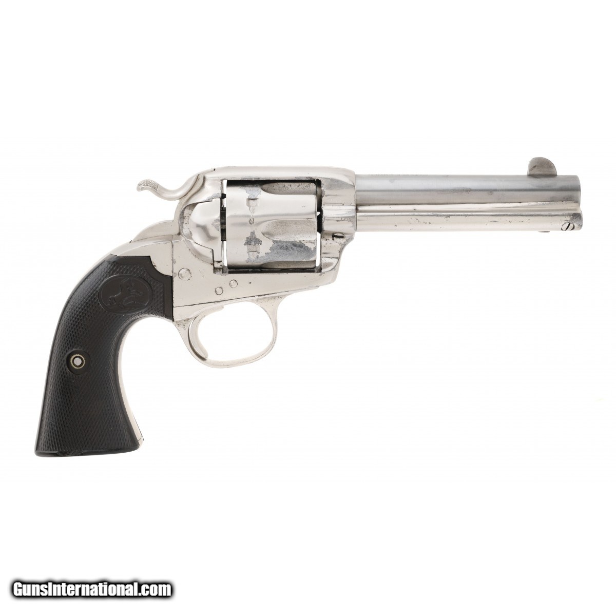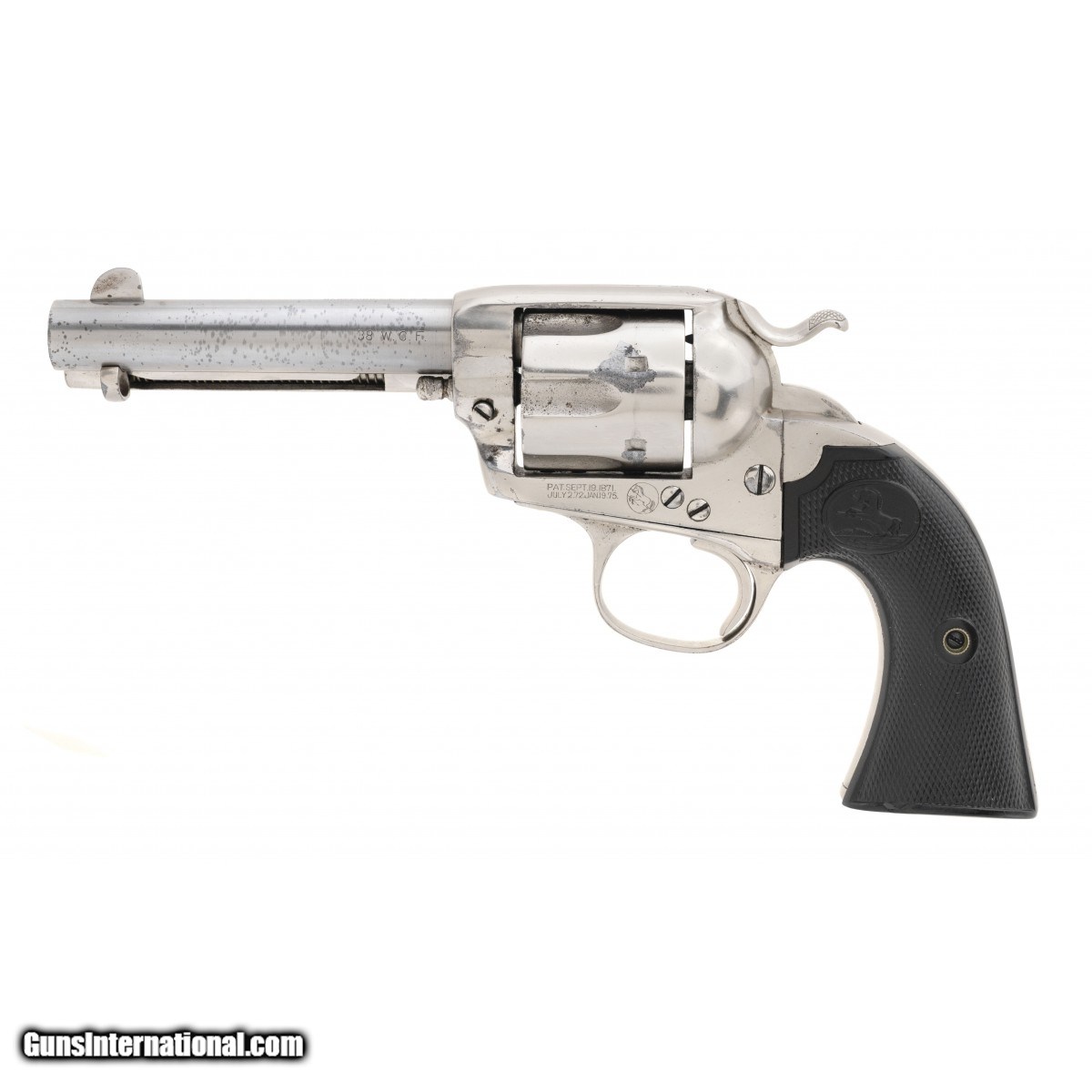Description: " SN: 285014. Made in 1906. .38 WCF (.38-40) with a 4 3/4"" barrel. 1st Gen single action revolver. Bore is very good with very light frosting. Action works perfectly. Has been expertly renickeled in the period of use and looks very good with wear on the cylinder and barrel. The grips are very good with a couple of small chips. SOLD Curio/Relic: Yes |