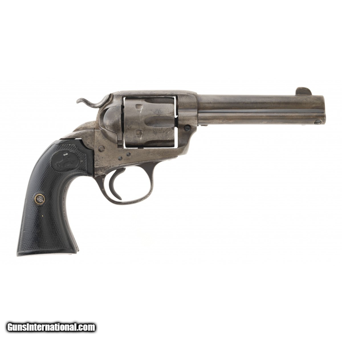 Description: "Serial number 269268. 44-40 caliber with a 4 ¾" barrel. Metal has a dark gray patina. Grips are replacements. SOLD |