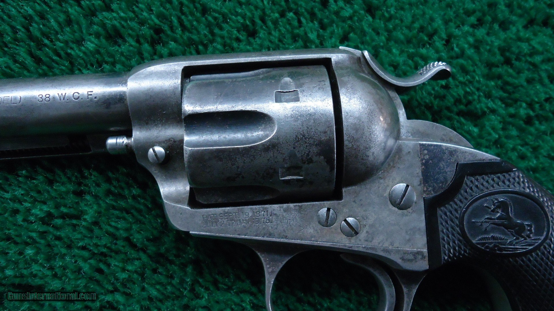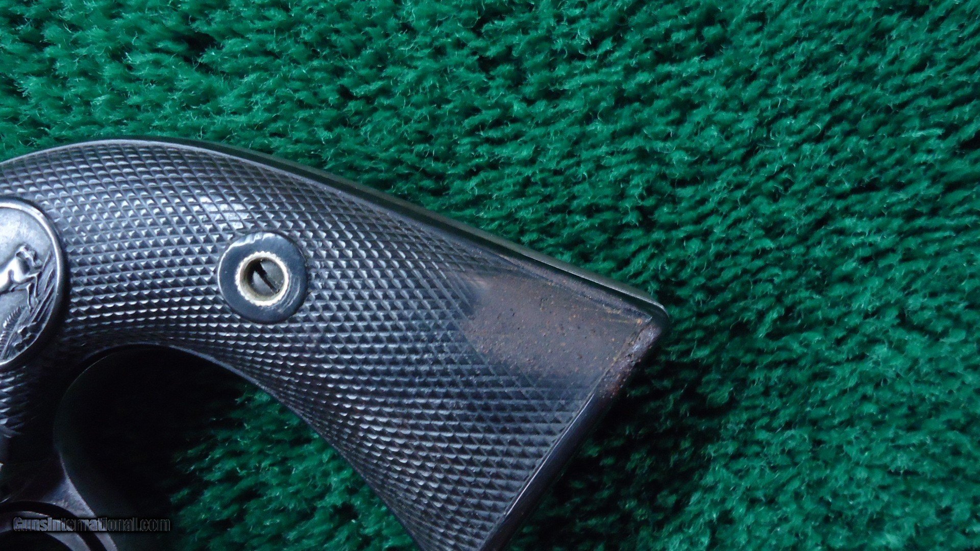 Description: 7-1/2 inch round barrel chambered in 38 WCF caliber with a bright shiny bore with scattered light pitting and strong rifling. Barrel has turned a mottled gray patina with good traces of original blue in the protected areas. Traces of blue on the cylinder remain. The left side of the barrel is stamped "(BISLEY MODEL) 38 WCF". Case colored frame and hammer are mostly a grey color. Left side of the frame shows the Rampant Colt logo. Matching numbers on the frame, trigger guard and rear grip strap. Hard rubber checkered grips show some wear but look good. Small brown spot on the left grip. Nice action. Nice old Bisley made in 1902. There were only 12,163 Colt Standard Frame Bisley Models were made in 38 WCF caliber. Leroy Merz Antique Firearms specializes in antique and vintage Winchesters and other fine American firearms. Since 1965 Mr. Merz has taken part in the world of firearms and has been a contributor to many well known reference books. We have hundreds of additional guns in every price range at our home online. Search for Merz Antiques in google. SOLD Curio/Relic: Yes Handgun Caliber: .38-40 Winchester (.38 WCF) |