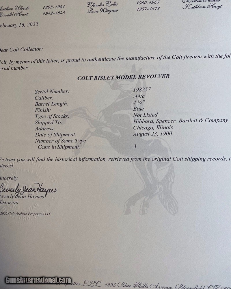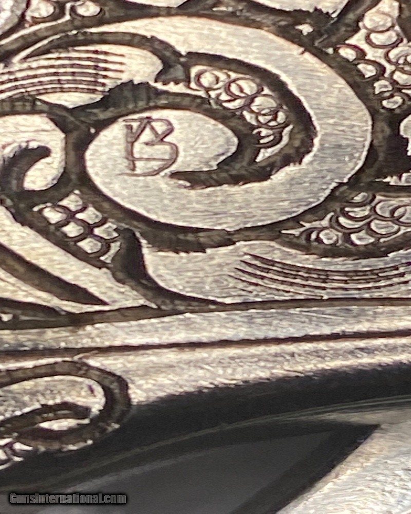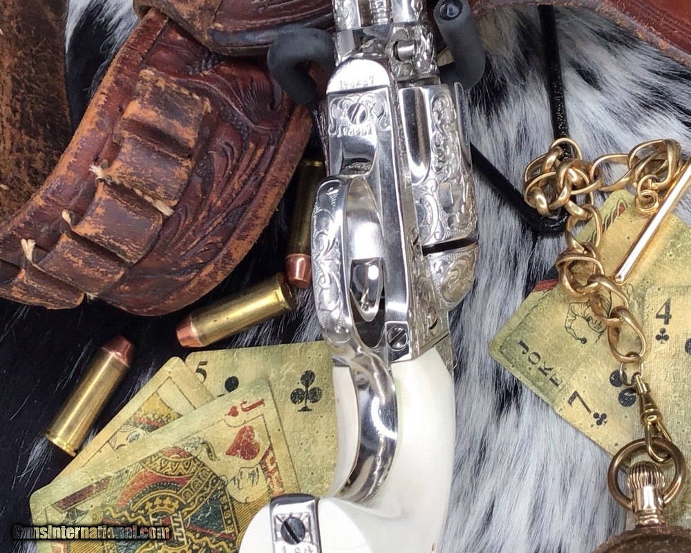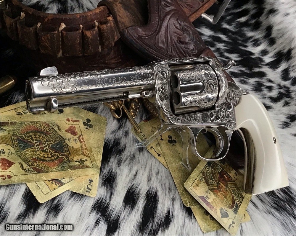 Description: 1900 vintage Colt Bisley Frontier Six Shooter single action revolver, serial number 198257. 4 - 3/4" round barrel chambered in .44-40 Winchester Center Fire with blade front sight, 2 line barrel address, and frame notch rear. Master engraved and signed by Weldon Bledsoe .100% coverage custom engraved with scroll on a punchdot background. Beautiful Pre ban Ivory grips. CONDITION: Very good to excellent with 99% nickel plated finish remaining with engraving sharp and crisp and minor handling marks throughout. Grips are strong with no major cracks and minor handling marks. Good mechanics with crisp four click action. Bore is good with well-defined rifling. One gorgeous first generation Bisley Frontier Six Shooter, hand engraved by a master Weldon Bledsoe, with brilliant Nickel finish. Colt Archives letter included. Add 3% if paying with credit card. God Bless America from a proud American, and a Viet Nam Vet , thankful for our freedoms.. paid for by the Blood ,Sweat and Tears of our brave men and women in uniform. Ten Below Firearms is a Veteran owned and operated business. We specialize in out of production models of high quality firearms. We love to ship! If you are out of state or can't make it to our store, just give us a call! Handguns normally ship for $30 and Long guns for $40 to $65 for extra length long guns. That's 2-3 day USPS Priority shipping, Delivery conformation and with tracking number. Optional Postal insurance is additional $1.70 per $100 and highly recommended. We are OPEN BY APPOINTMENT ONLY FOR IN PERSON VISITS SOLD Curio/Relic: Yes Handgun Caliber: .44-40 Winchester (.44 WCF) Manufacturer: Colt Model: Bisley Frontier Six Shooter Serial Number: 198257 Barrel Length: 4.75 inch Condition: Very good Metal Condition: Very good Wood Condition: Very good Bore Condition: Good Action: Single Action Finish: Nickel Sights: Fixed Manufacture Date: 1900 Engraving: Full coverage Item Location: Mn |