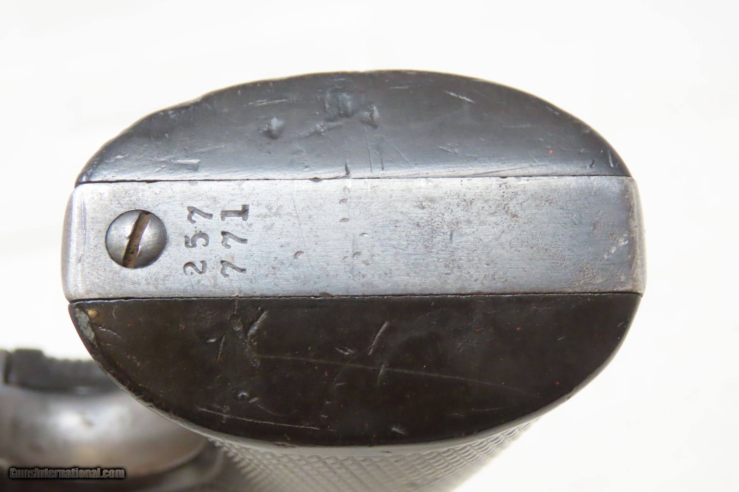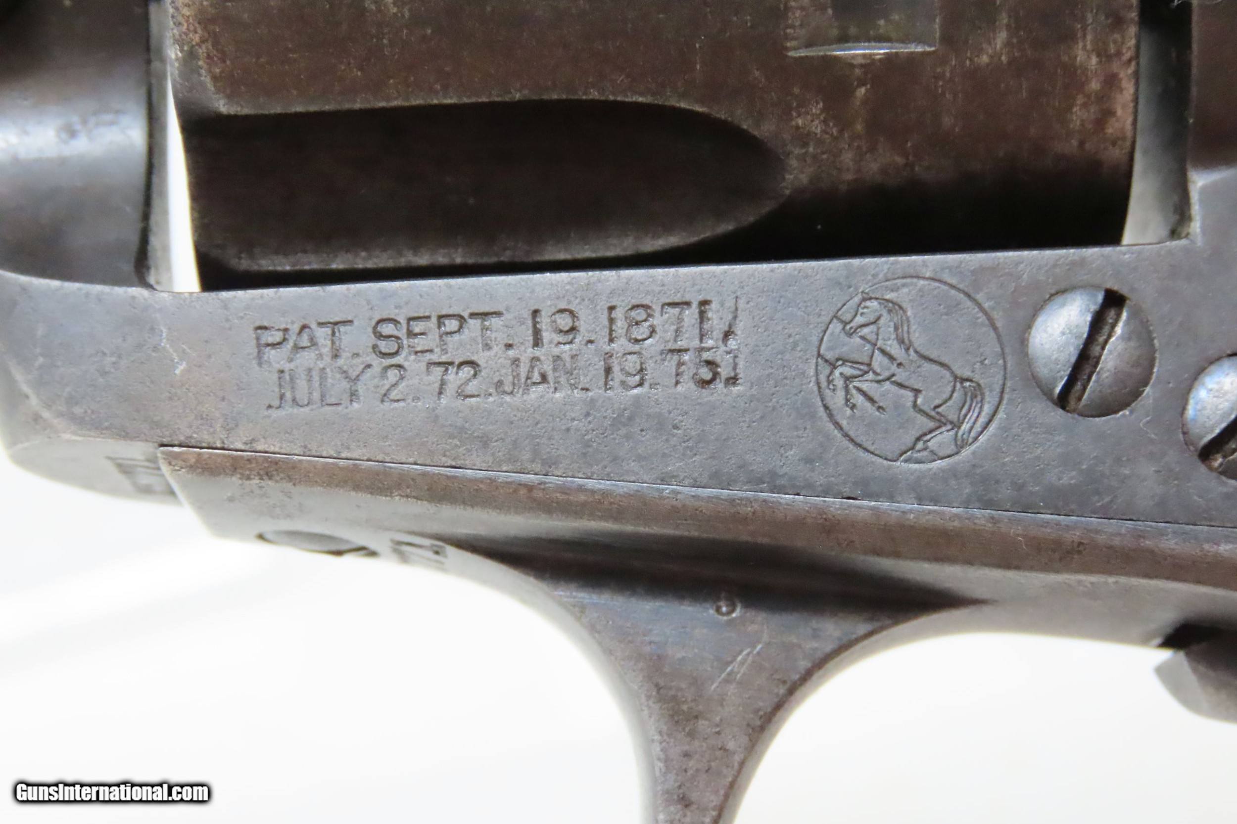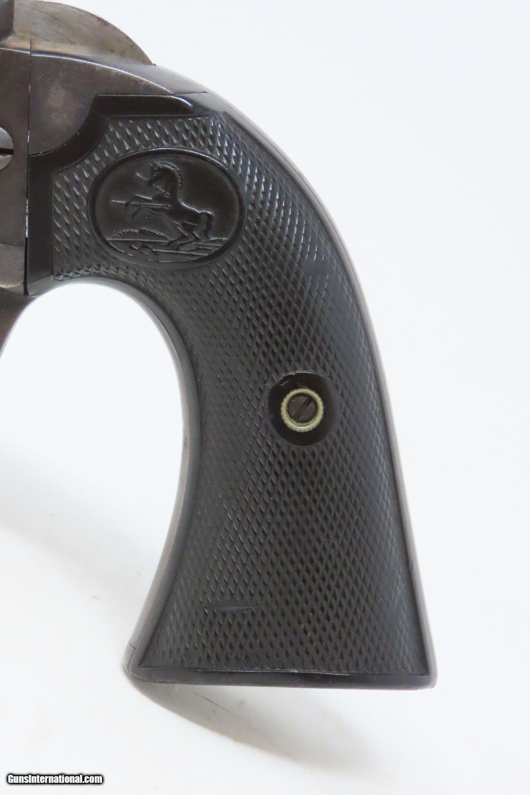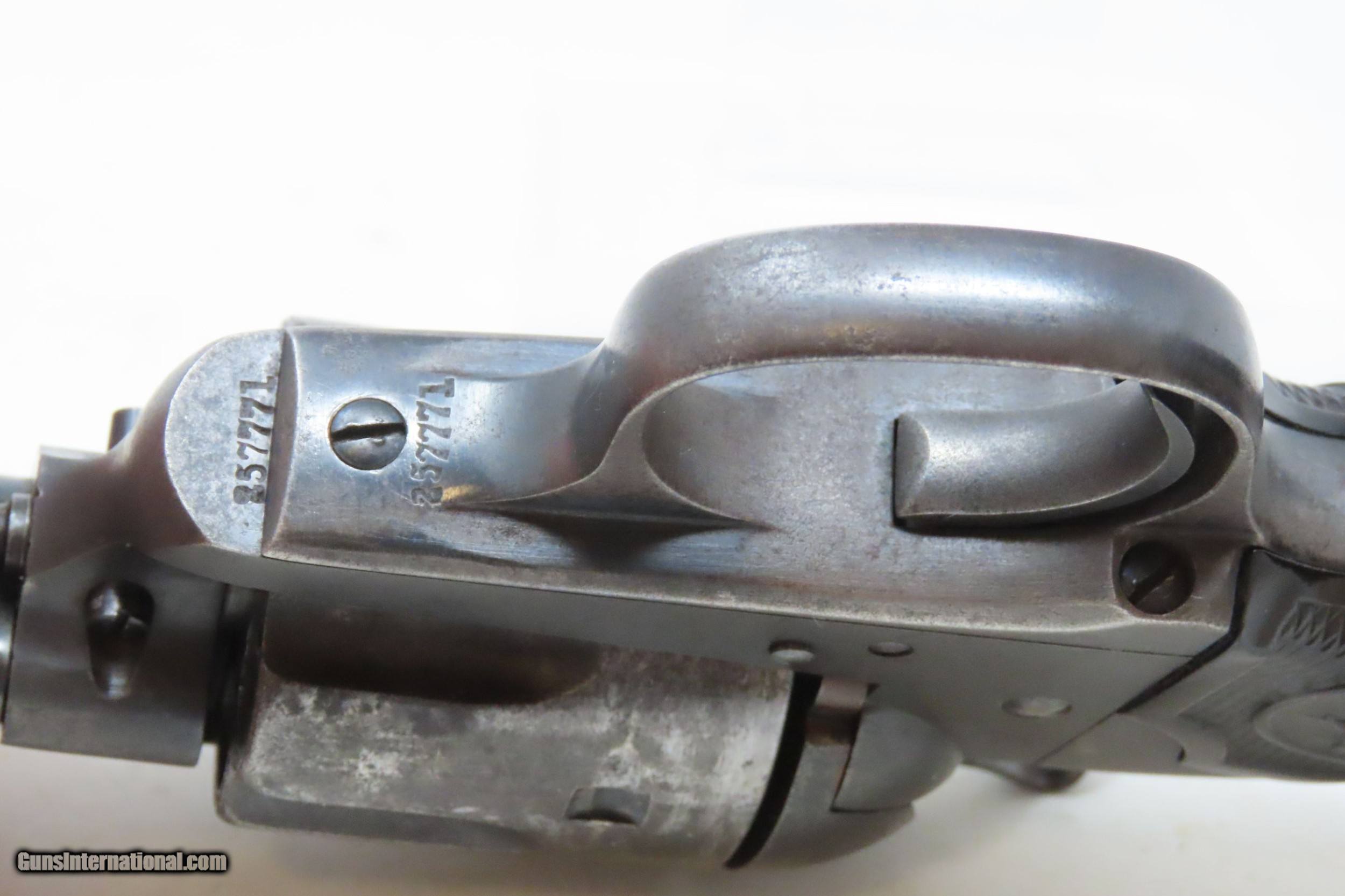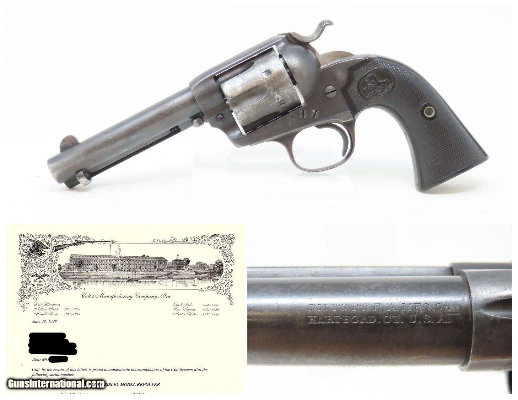 Description: 1904 LETTERED 1st Gen COLT BISLEY Single Action Army .38-40 WCF C&R Revolver KENTUCKY SHIPPED SAA in .38-40 WCF Made in 1904 Here we present a C&R Colt Bisley Model Single Action Army Revolver in .38 WCF, manufactured in Hartford, Connecticut in 1904. The factory letter lists this revolver with a 4-3/4” barrel in .38.40 caliber with a blue finish when shipped on August 23, 1904, to Belknap Hardware & Manufacturing Company in Louisville, Kentucky. Though Colt enjoyed the largest contracts of any handgun maker during the American Civil War, it had to rely on its array of percussion fired revolvers, namely the 1860 Army until the Smith & Wesson owned Rollin White Patent expired in 1869. This enabled them to begin making revolvers with completely bored through cylinder chambers in order to utilize modern metallic cartridge ammunition in the most effective manner. These revolvers made excellent companions to rifles at the time as they were chambered for the same ammunition, meaning that the user only had to keep one type to feed both guns. In 1869, Colt’s began development of a suitable cartridge revolver in earnest, first coming out with a number of conversions for their percussion lines, until 1872 when they debuted what was to become the Colt Model 1873 Single Action Army in the 1872 U.S. Trials. Needless to say, it won, and became the Army’s revolver of choice. It also became the sidearm of choice for many others like cowboys, guards, lawmen, crooks, shopkeepers and all manner of civilians. This is an example of the Bisley variant of the Colt Single Action Army revolver. The primary differences were a lower hammer spur and a more curvaceous grip frame. These were optimized toward target shooting but many general users and shooters who were not simply target shooters preferred them as well. The overall condition is very good. Original finish/patina. The action is excellent with 4 clicks and good lockup. The bore is in good condition with nice rifling. The trademarked grips are solid and show a bit of wear. Numbers match. This firearm is classified as a Curio & Relic. Barrel is 4-3/4 inches. Caliber: .38-40 Winchester Center Fire Overall condition as seen in photos. Very Fast. Very Safe. FREE SHIPPING. Will need to be sent to your local FFL or C&R licensee. This firearm is classified as a Curio & Relic. Guaranteed AUTHENTIC & Includes CERTIFICATE OF AUTHENTICITY. ancestryguns $3145 #226551 SOLD Curio/Relic: Yes |