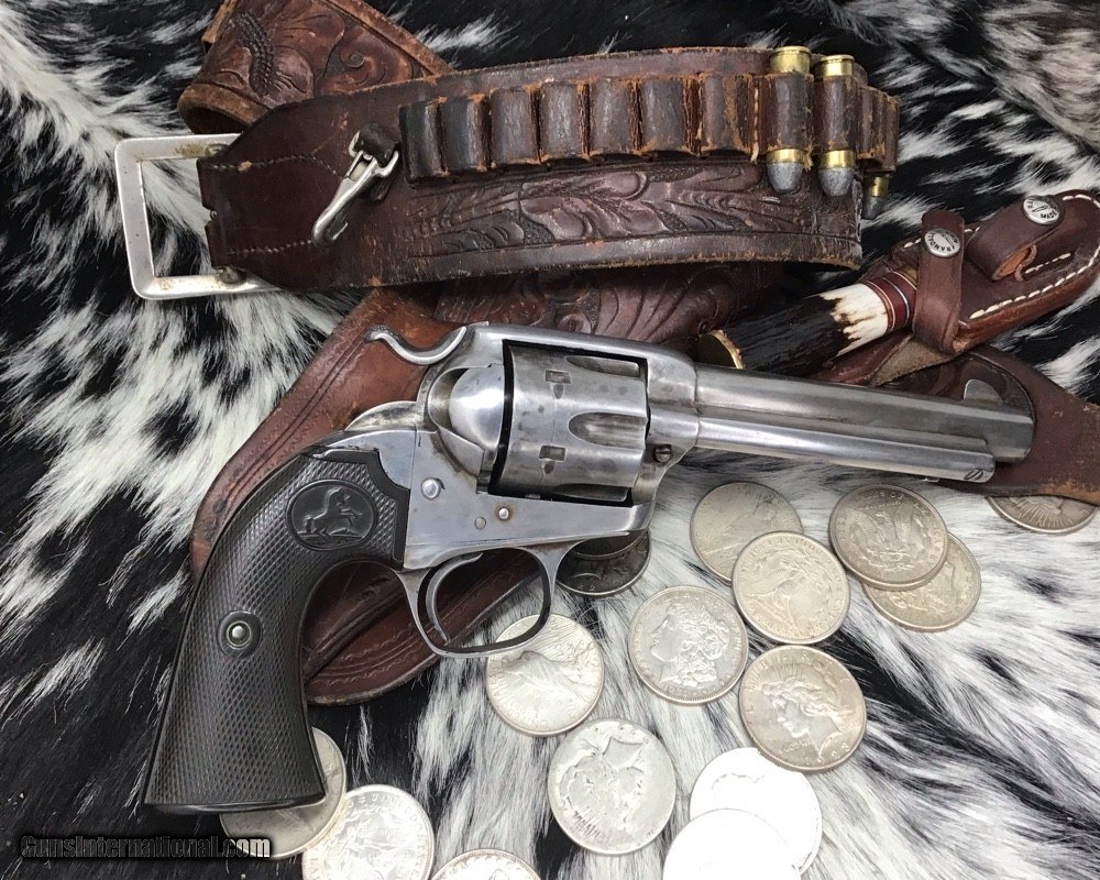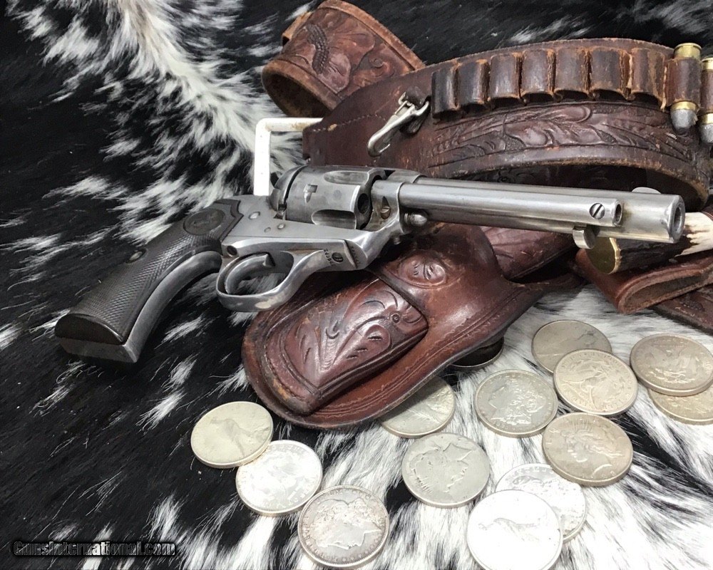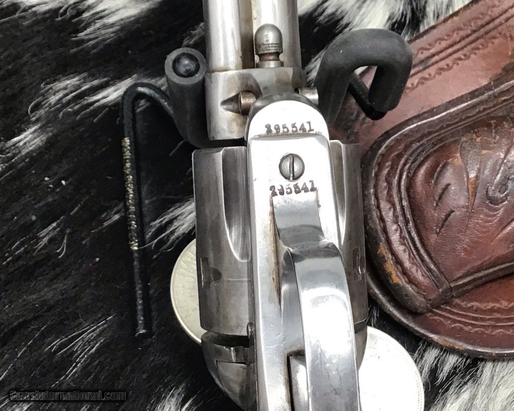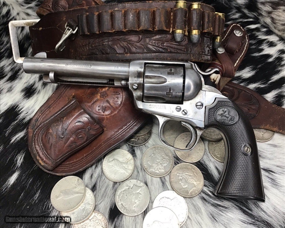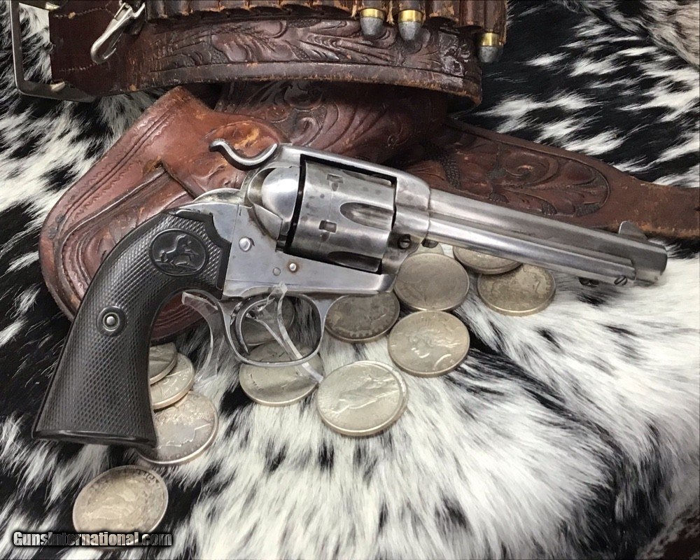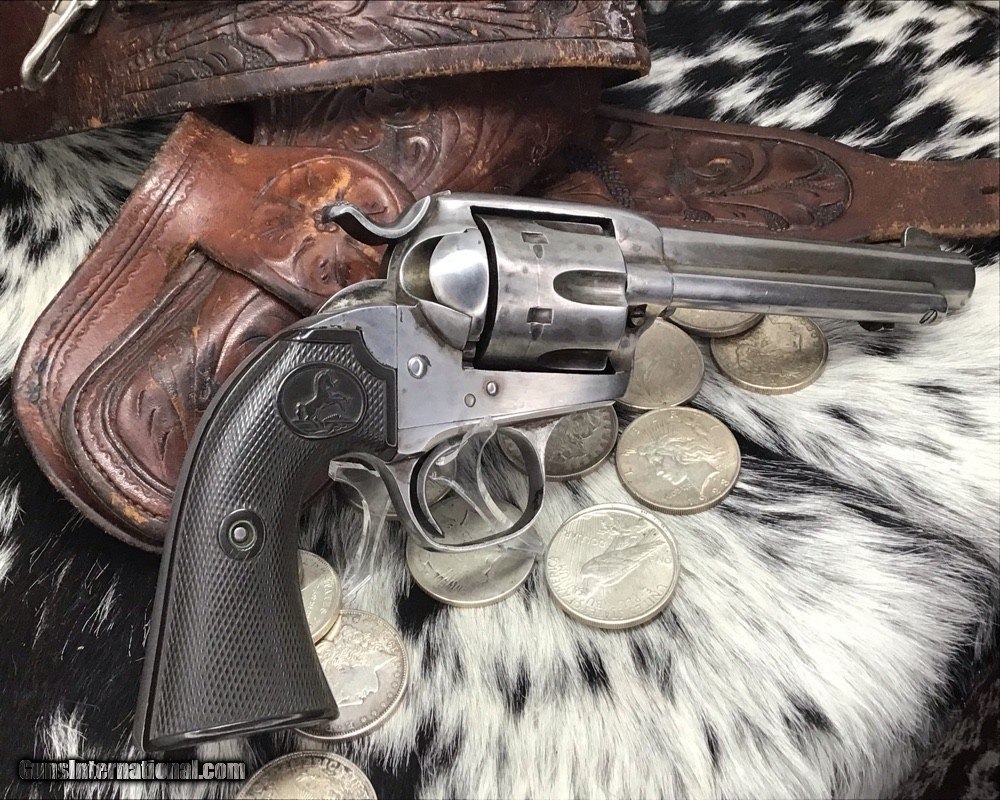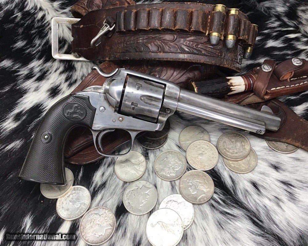 Description: 1907 Colt SAA Bisley Model wearing a 5.5 inch barrel and chambered in .38 Special. Finish worn to a pleasing silver patina with no rust or pitting visible on gun, blued finish peeking out from protected areas. Original Bisley grips in good condition with tiny chip on butt corner. Numbers matching on frame, trigger guard and butt of gun. Good bore with rifling. Tight four click action with solid lockup. A very unusual chambering in a Colt SAA. A good honest 115 year old Colt Bisley model in .38 SW for your shooting or collecting pleasure. Add 3% if paying with credit card God Bless America from a proud American, and a Viet Nam Vet , thankful for our freedoms.. paid for by the Blood ,Sweat and Tears of our brave men and women in uniform. Ten Below Firearms is a Veteran owned and operated business. We specialize in out of production models of high quality firearms. We love to ship! If you are out of state or can't make it to our store, just give us a call! Handguns normally ship for $30 and Long guns for $40 to $65 for extra length long guns. That's 2-3 day USPS Priority shipping, Delivery conformation and with tracking number. Optional Postal insurance is additional $1.70 per $100 and highly recommended. We are OPEN BY APPOINTMENT ONLY FOR IN PERSON VISITS SOLD Curio/Relic: Yes Handgun Caliber: .38 Special Manufacturer: Colt Model: SAA Bisley Model Serial Number: 295541 Barrel Length: 5.5 inch Condition: Very good Metal Condition: Very good Bore Condition: Very good Action: SA Triggers: Bisley Finish: Patina Sights: Fixed Manufacture Date: 1907 Item Location: Mn |