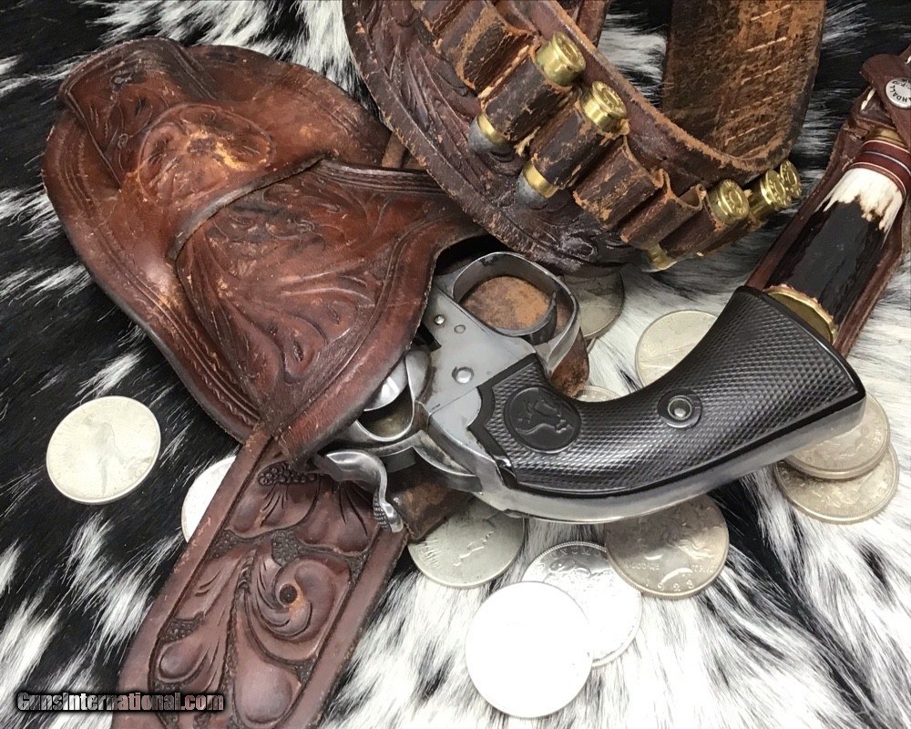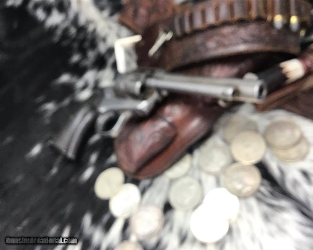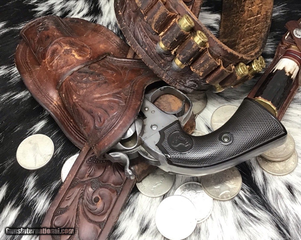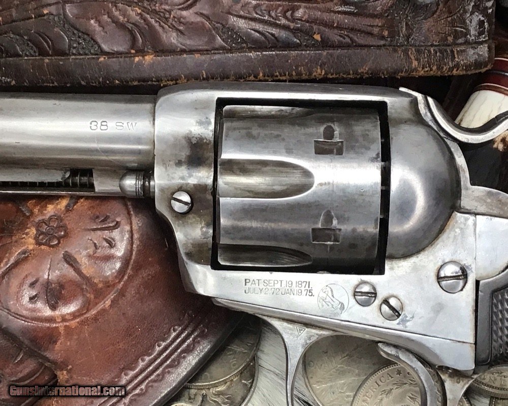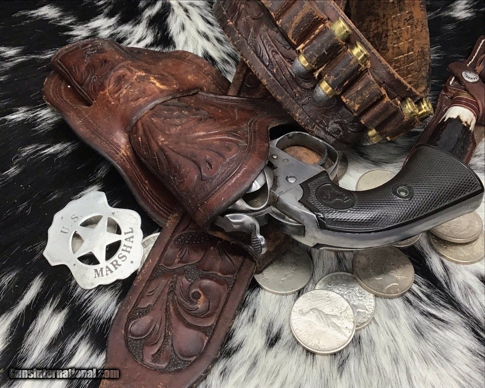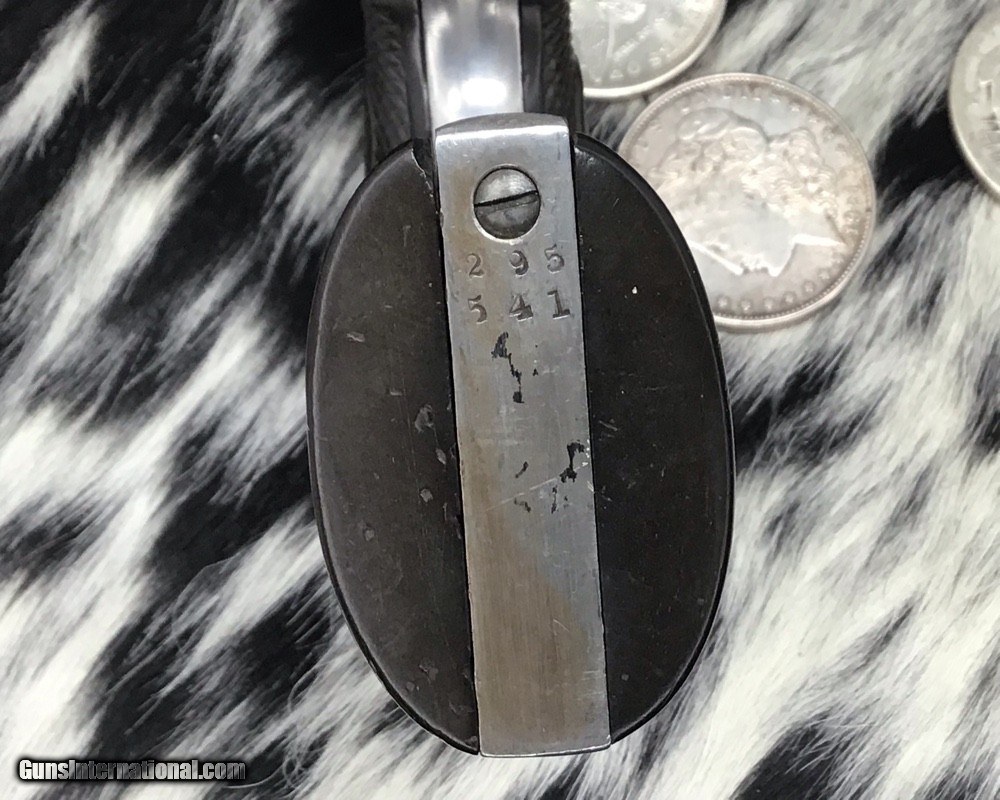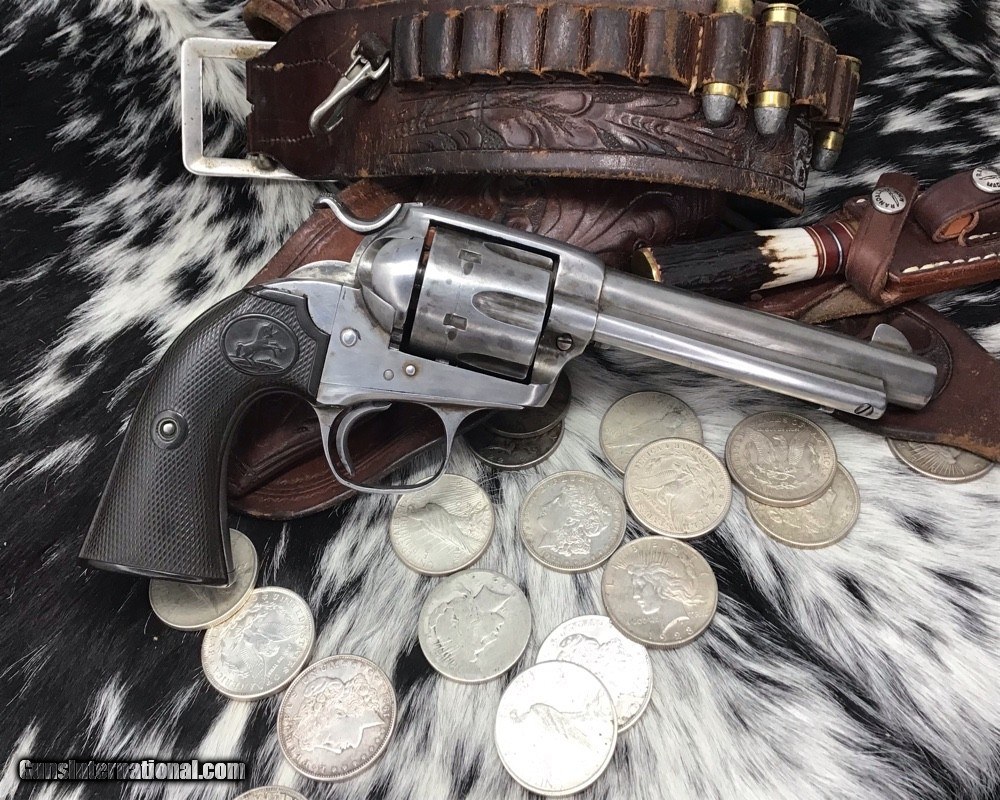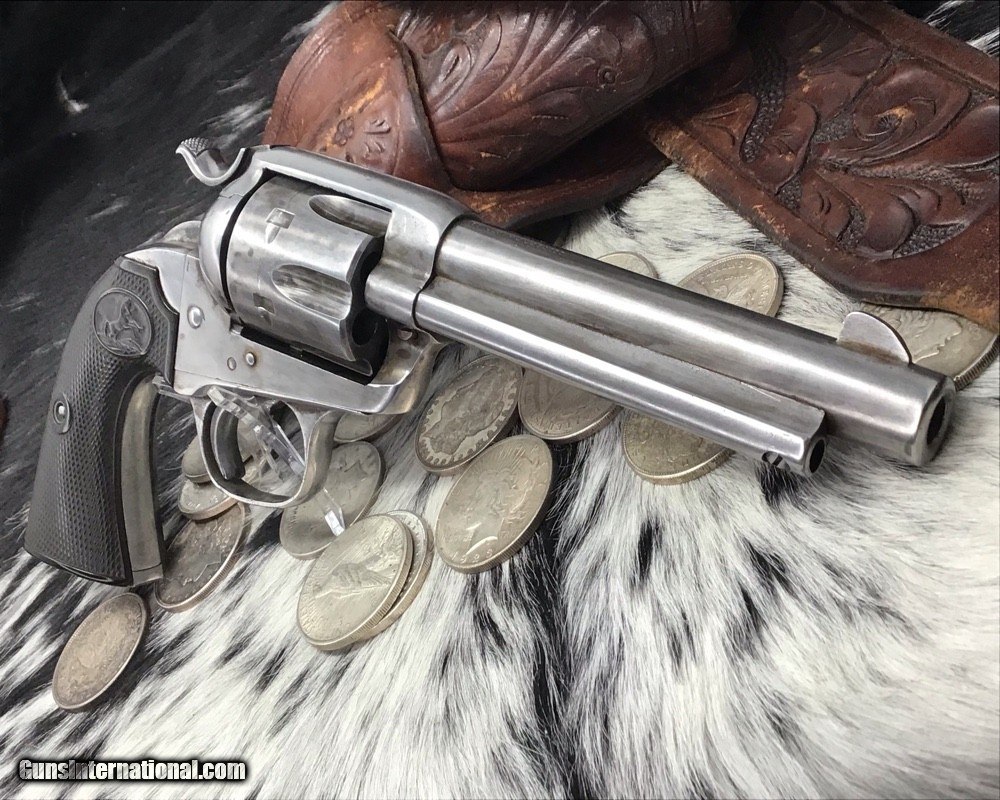 Description: 1907 Colt SAA Bisley Model wearing a 5.5 inch barrel and chambered in .38 Special. Finish worn to a pleasing silver patina with no rust or pitting visible on gun, blued finish peeking out from protected areas. Original Bisley grips in good condition with tiny chip on butt corner. Numbers matching on frame, trigger guard and butt of gun. Good bore with rifling. Tight four click action with solid lockup. A very unusual chambering in a Colt SAA. A good honest 115 year old Colt Bisley model in .38 SW for your shooting or collecting pleasure. Add 3% if paying with credit card God Bless America from a proud American, and a Viet Nam Vet , thankful for our freedoms.. paid for by the Blood ,Sweat and Tears of our brave men and women in uniform. Ten Below Firearms is a Veteran owned and operated business. We specialize in out of production models of high quality firearms. We love to ship! If you are out of state or can't make it to our store, just give us a call! Handguns normally ship for $30 and Long guns for $40 to $65 for extra length long guns. That's 2-3 day USPS Priority shipping, Delivery conformation and with tracking number. Optional Postal insurance is additional $1.70 per $100 and highly recommended. We are OPEN BY APPOINTMENT ONLY FOR IN PERSON VISITS SOLD Curio/Relic: Yes Handgun Caliber: .38 Special Manufacturer: Colt Model: SAA Bisley Model Serial Number: 295541 Barrel Length: 5.5 inch Condition: Very good Metal Condition: Very good Bore Condition: Very good Action: SA Triggers: Bisley Finish: Patina Sights: Fixed Manufacture Date: 1907 Item Location: Mn |