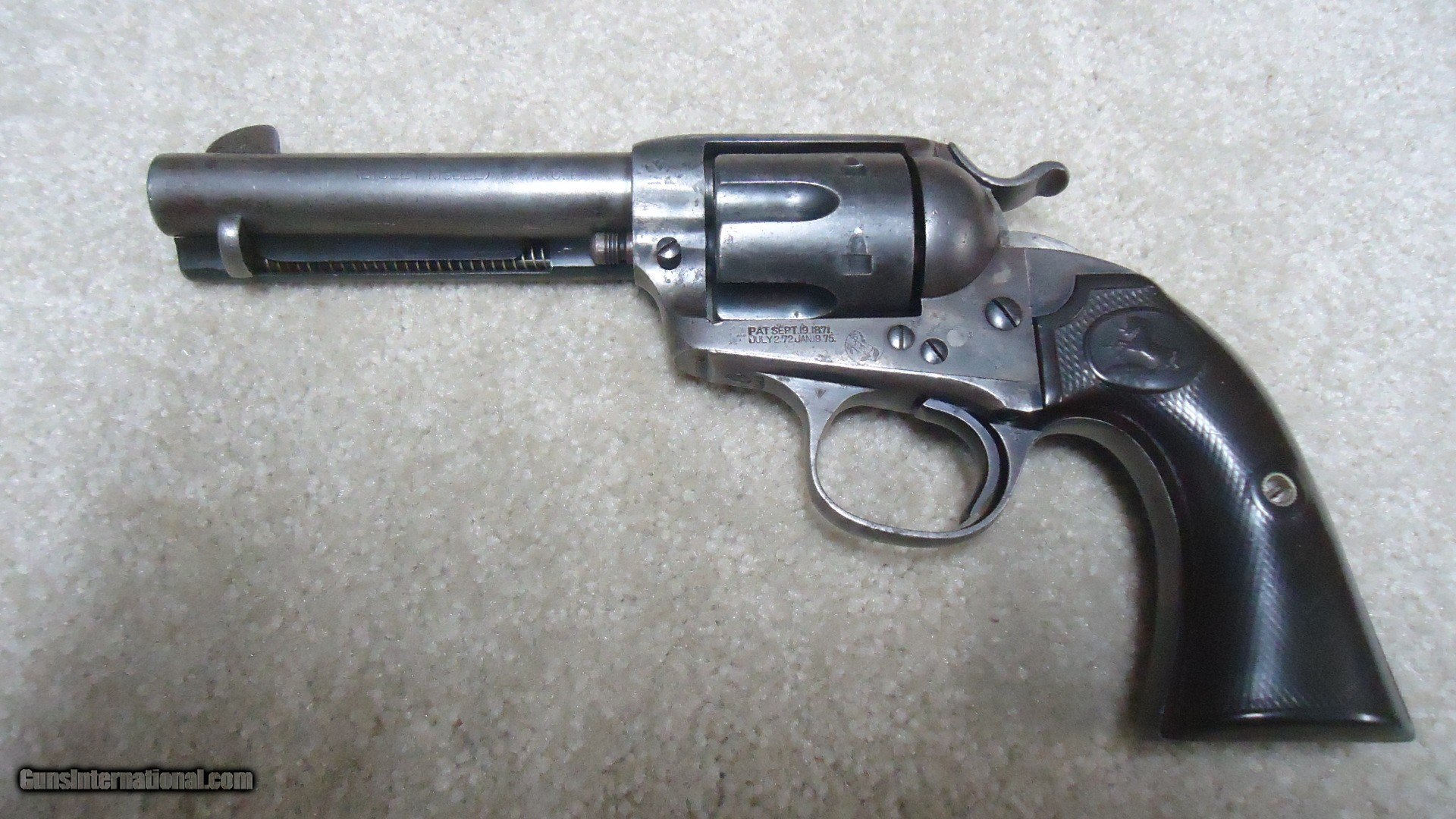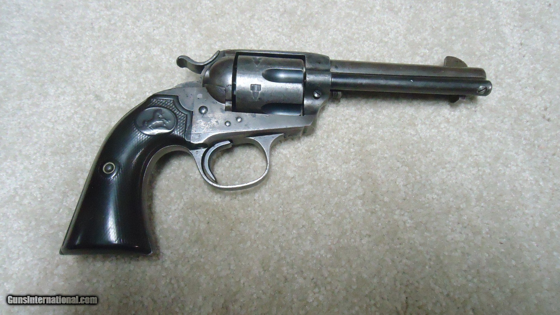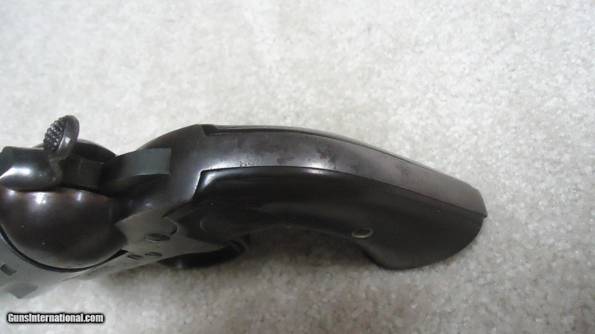 Description: BISLEY .38-40, 4 3/4" BARREL, #285XXX, MADE 1906. Nice honest example that hasn't been cleaned or scrubbed. This one shows good blue in the cylinder flutes, top/bottom of the ejector housing, thin blue on the cylinder and good blue in the usual protected areas with the balance an uncleaned gray/brown. Correct two line barrel address (used on 4 3/4" barrel Single Actions and Bisleys) , barrel is marked "BISLEY MODEL 38 W.C.F." on the left side. Front sight has not been filed or altered. Excellent screw heads, few small dings on the frame above the cylinder release button on the left side- minor, Grips show wear with more wear on the right side which is typical of holster carry with the revolver on the right hand side where the grips would be exposed and rubbed/worn more than the left side. Grips fit well and appear to be original. There are some illegible scratchings on the inside of the right grip and inside the left is scratched in script "Algodones Sonora Mex" which might make this Bisley a good one to factory letter. good mechanically and good cylinder lock-up with four clicks to the hammer. Generally about excellent bore with any spots of roughness or corrosion minor and might brush out. Matching numbers. An attractive, unmessed with Bisley that probably has some interesting history in it! SOLD Curio/Relic: Yes Handgun Caliber: .38-40 Winchester (.38 WCF) Manufacturer: COLT Model: BISLEY Serial Number: 285XXX Barrel Length: 4 3/4 Condition: VG Bore Condition: FINE+ |