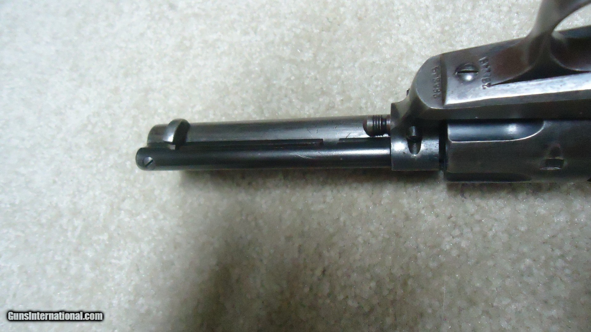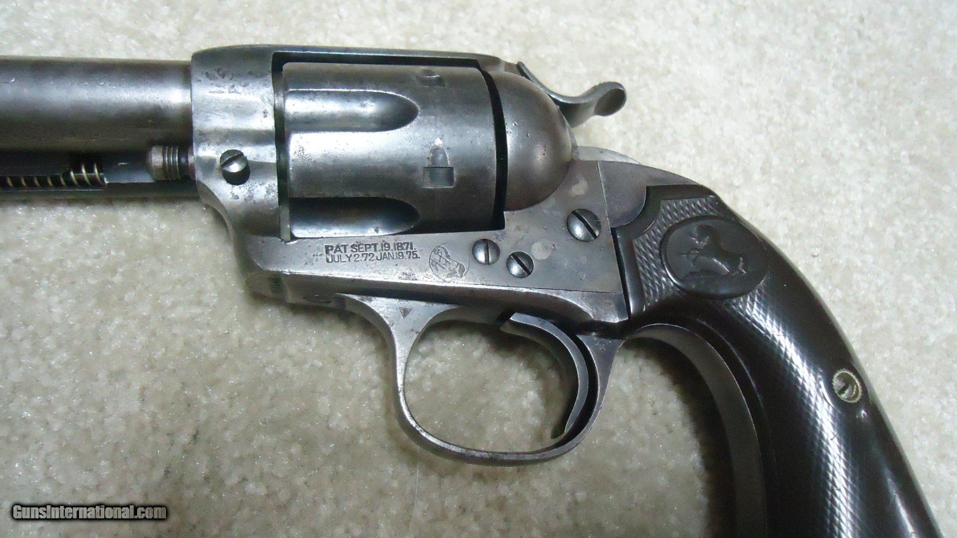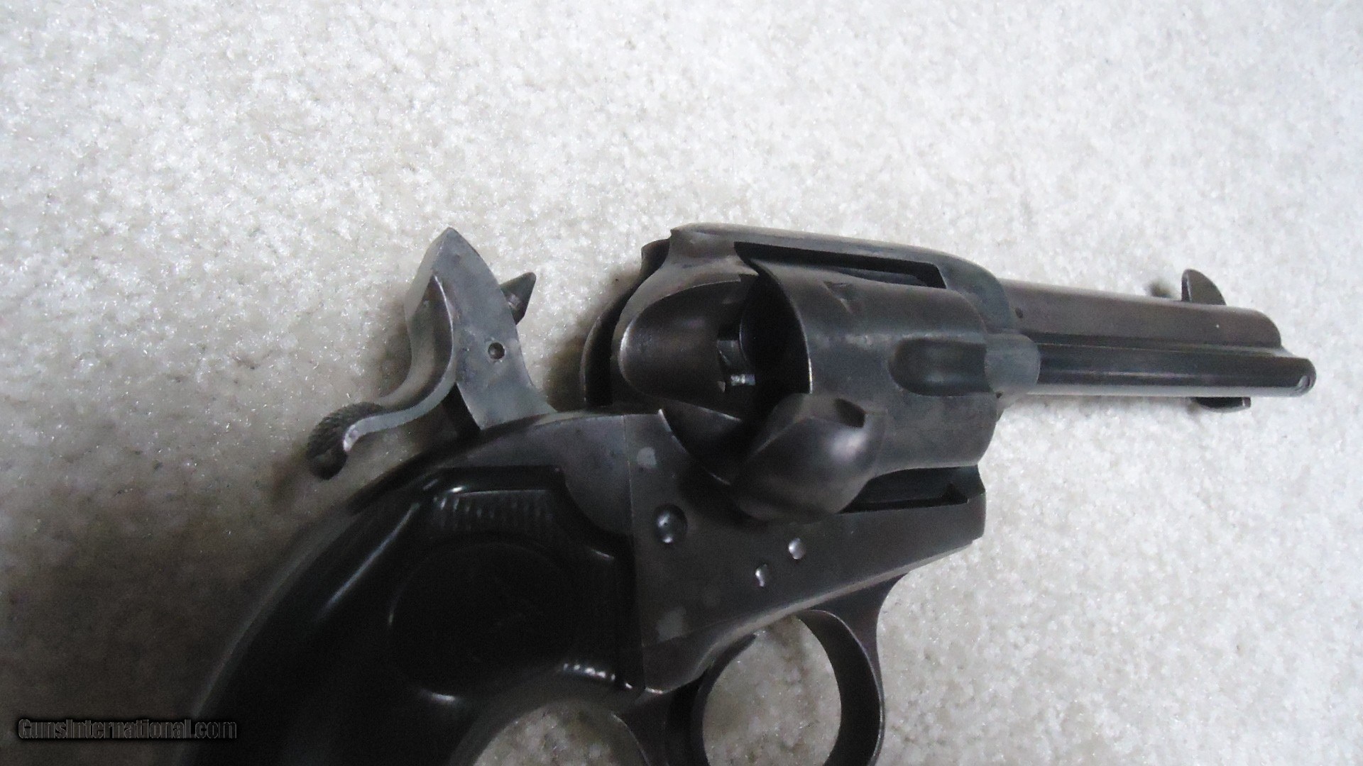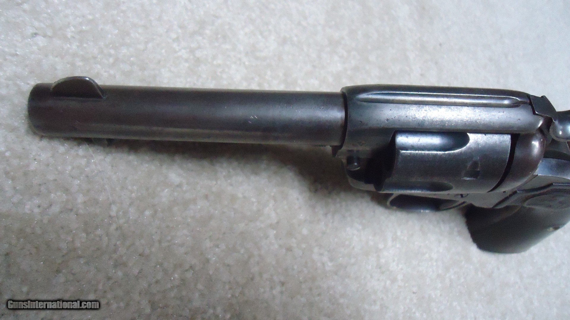 Description: BISLEY .38-40, 4 3/4" BARREL, #285XXX, MADE 1906. Nice honest example that hasn't been cleaned or scrubbed. This one shows good blue in the cylinder flutes, top/bottom of the ejector housing, thin blue on the cylinder and good blue in the usual protected areas with the balance an uncleaned gray/brown. Correct two line barrel address (used on 4 3/4" barrel Single Actions and Bisleys) , barrel is marked "BISLEY MODEL 38 W.C.F." on the left side. Front sight has not been filed or altered. Excellent screw heads, few small dings on the frame above the cylinder release button on the left side- minor, Grips show wear with more wear on the right side which is typical of holster carry with the revolver on the right hand side where the grips would be exposed and rubbed/worn more than the left side. Grips fit well and appear to be original. There are some illegible scratchings on the inside of the right grip and inside the left is scratched in script "Algodones Sonora Mex" which might make this Bisley a good one to factory letter. good mechanically and good cylinder lock-up with four clicks to the hammer. Generally about excellent bore with any spots of roughness or corrosion minor and might brush out. Matching numbers. An attractive, unmessed with Bisley that probably has some interesting history in it! SOLD Curio/Relic: Yes Handgun Caliber: .38-40 Winchester (.38 WCF) Manufacturer: COLT Model: BISLEY Serial Number: 285XXX Barrel Length: 4 3/4 Condition: VG Bore Condition: FINE+ |