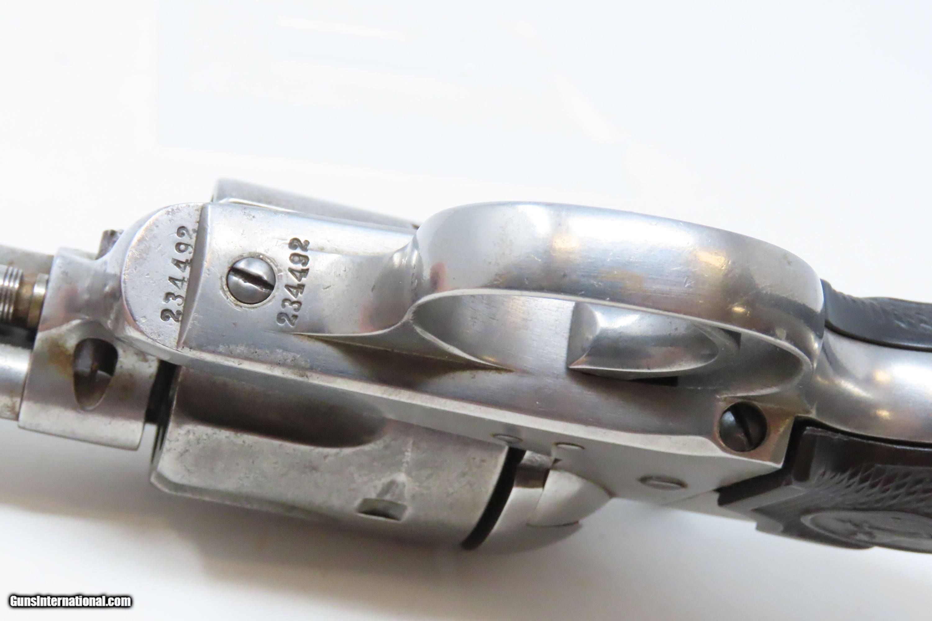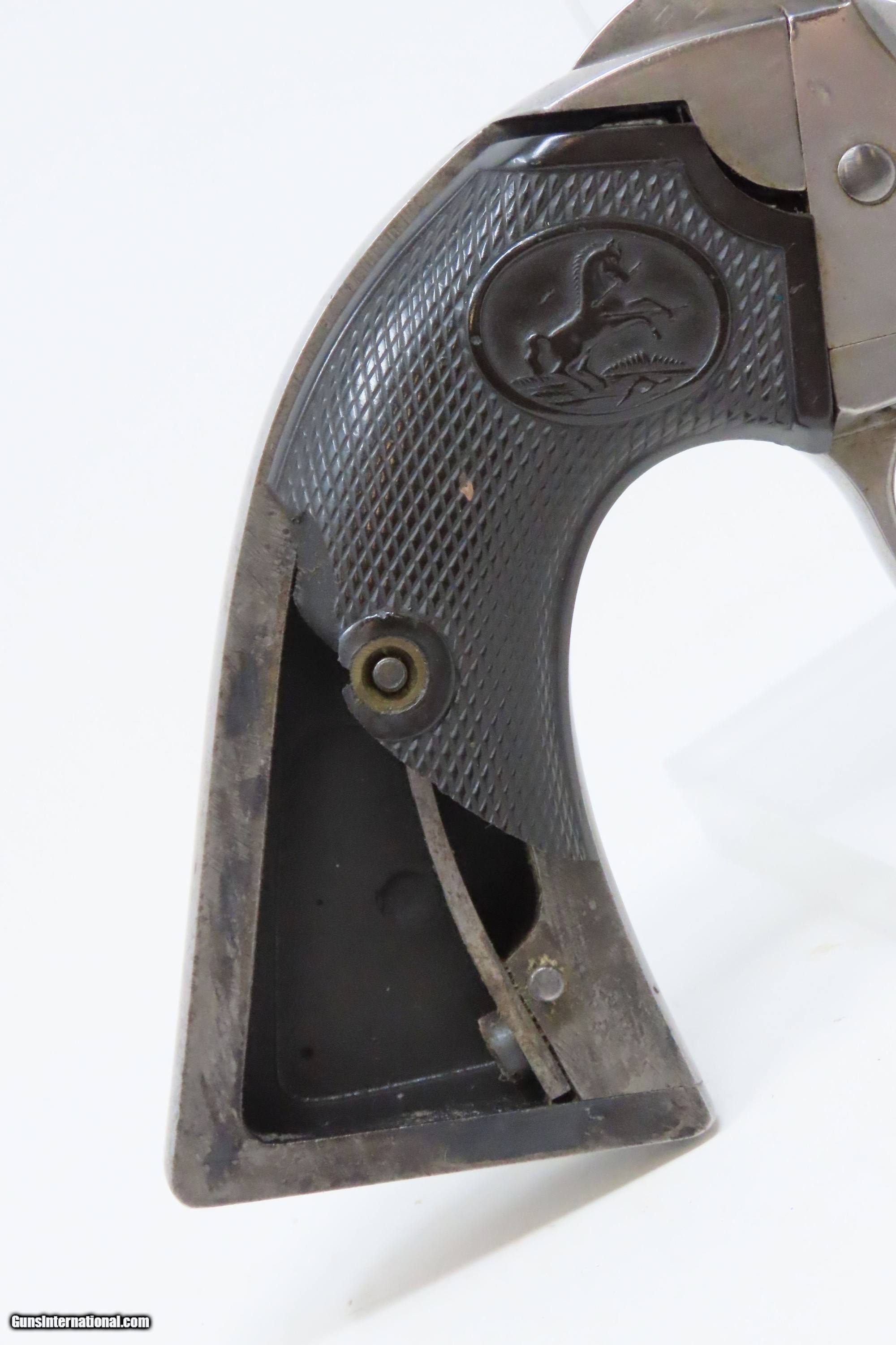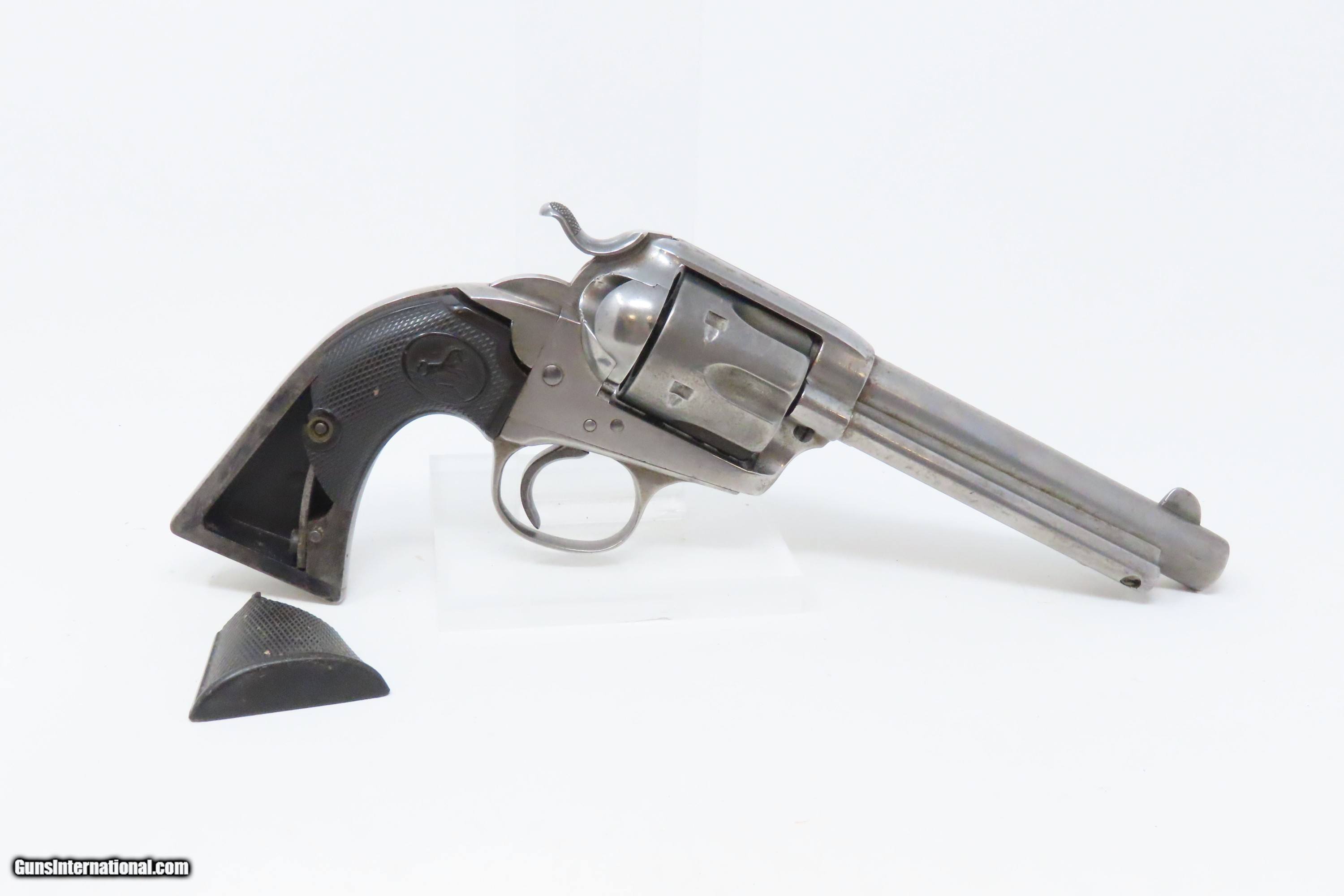 Description: c1902 COLT BISLEY Model SINGLE ACTION ARMY .41 Cal. Long Colt Revolver C&R SAA in SCARCE .41 Caliber Long Colt Made in 1902 Here we present a C&R Colt Bisley Model Single Action Army Revolver in .41 Long Colt, manufactured in Hartford, Connecticut in 1902. Out of 44,350 Bisley revolvers made, only 3,159 were chambered for .41 Colt cartridges. Though Colt enjoyed the largest contracts of any handgun maker during the American Civil War, it had to rely on its array of percussion fired revolvers, namely the 1860 Army until the Smith & Wesson owned Rollin White Patent expired in 1869. This enabled them to begin making revolvers with completely bored through cylinder chambers in order to utilize modern metallic cartridge ammunition in the most effective manner. In 1869, Colt’s began development of a suitable cartridge revolver in earnest, first coming out with a number of conversions for their percussion lines, until 1872 when they debuted what was to become the Colt Model 1873 Single Action Army in the 1872 U.S. Trials. Needless to say, it won, and became the Army’s revolver of choice. It also became the sidearm of choice for many others like cowboys, guards, lawmen, crooks, shopkeepers and all manner of civilians. This is an example of the Bisley variant of the Colt Single Action Army revolver. The primary differences were a lower hammer spur and a more curvaceous grip frame. These were optimized toward target shooting but many general users and shooters who were not simply target shooters preferred them as well. This one comes in .41 Colt chambering, which was a manstopper in its day. The overall condition is good. The action is excellent, holding firmly in all hammer notches. The bore is clean with strong rifling. The numbers match. The right grip has been broken as you see. 4 even notches are visible on the back corner of the grip frame. This firearm is classified as a Curio & Relic. Barrel is 5-1/2 inches. Caliber: .41 Long Colt Overall condition as seen in photos. Very Fast. Very Safe. FREE SHIPPING. Will need to be sent to your local FFL or C&R licensee. This firearm is classified as a Curio & Relic. Guaranteed AUTHENTIC & Includes CERTIFICATE OF AUTHENTICITY. ancestryguns $2300 #228325 SOLD Curio/Relic: Yes |