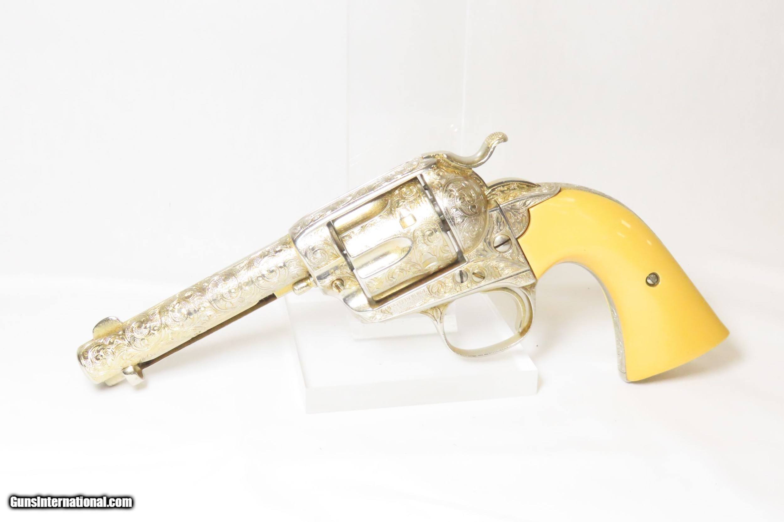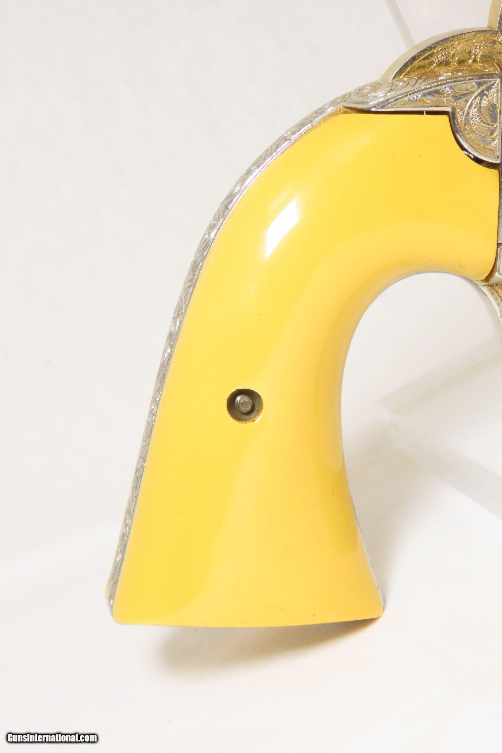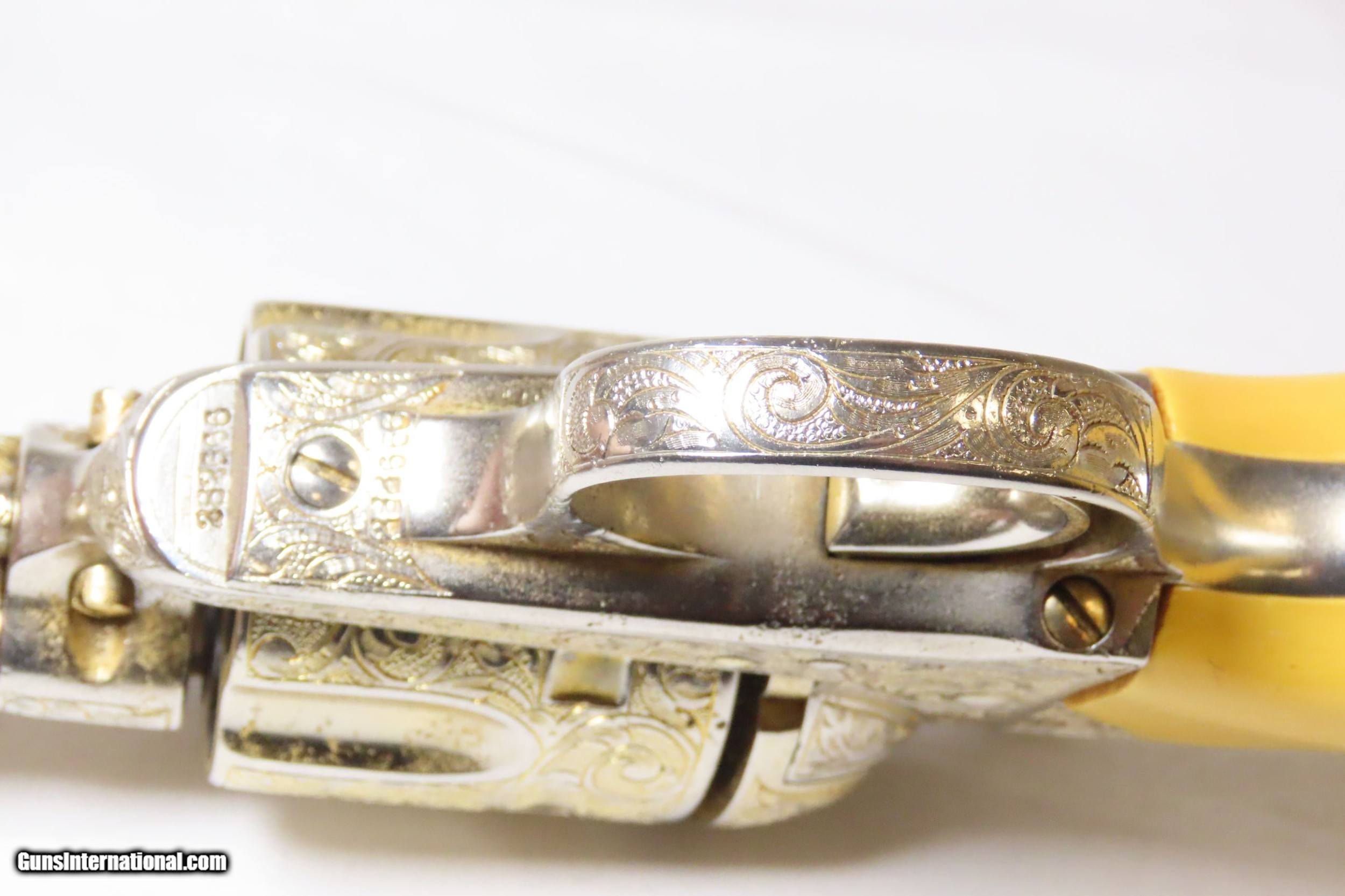 Description: c1906 mfrd. COLT BISLEY Model SINGLE ACTION ARMY .41 Colt Revolver SAA Gold Engraved with Gilt Finish Here we present an Engraved Colt Bisley Model Single Action Army Revolver in .41 Colt, manufactured in Hartford, Connecticut in 1906. Out of 44,350 Bisley revolvers made, only 3,159 were chambered for .41 Colt cartridges. This is an example of the Bisley variant of the Colt Single Action Army revolver. The primary differences were a lower hammer spur and a more curvaceous grip frame. These were optimized toward target shooting but many general users and shooters who were not simply target shooters preferred them as well. This one comes in the .41 Colt chambering, which was a manstopper in its day. The overall condition is fine. This one features very nice aftermarket scroll and punchdot engraving along with a gilt finish. The action is excellent with all 4 clicks and holding all notches. Cylinder indexes and locks up well. The bore is in great shape with strong rifling. The grips are ivory look-alike that are smooth and solid and yellowed. The numbers match. This firearm is classified as a Curio & Relic. Barrel is 4-3/4 inches. Caliber: .41 Colt Overall condition as seen in photos. Very Fast. Very Safe. FREE SHIPPING. Will need to be sent to your local FFL or C&R licensee. This firearm is classified as a Curio & Relic. Guaranteed AUTHENTIC & Includes CERTIFICATE OF AUTHENTICITY. ancestryguns $7235 #228294 SOLD Curio/Relic: Yes |
