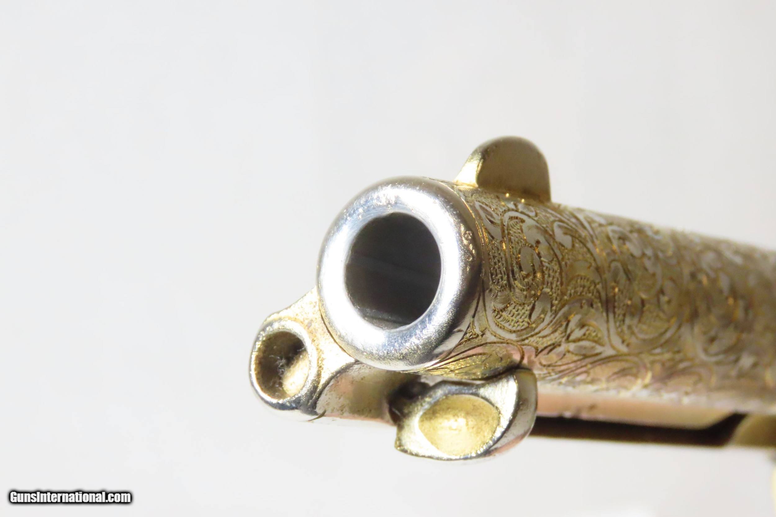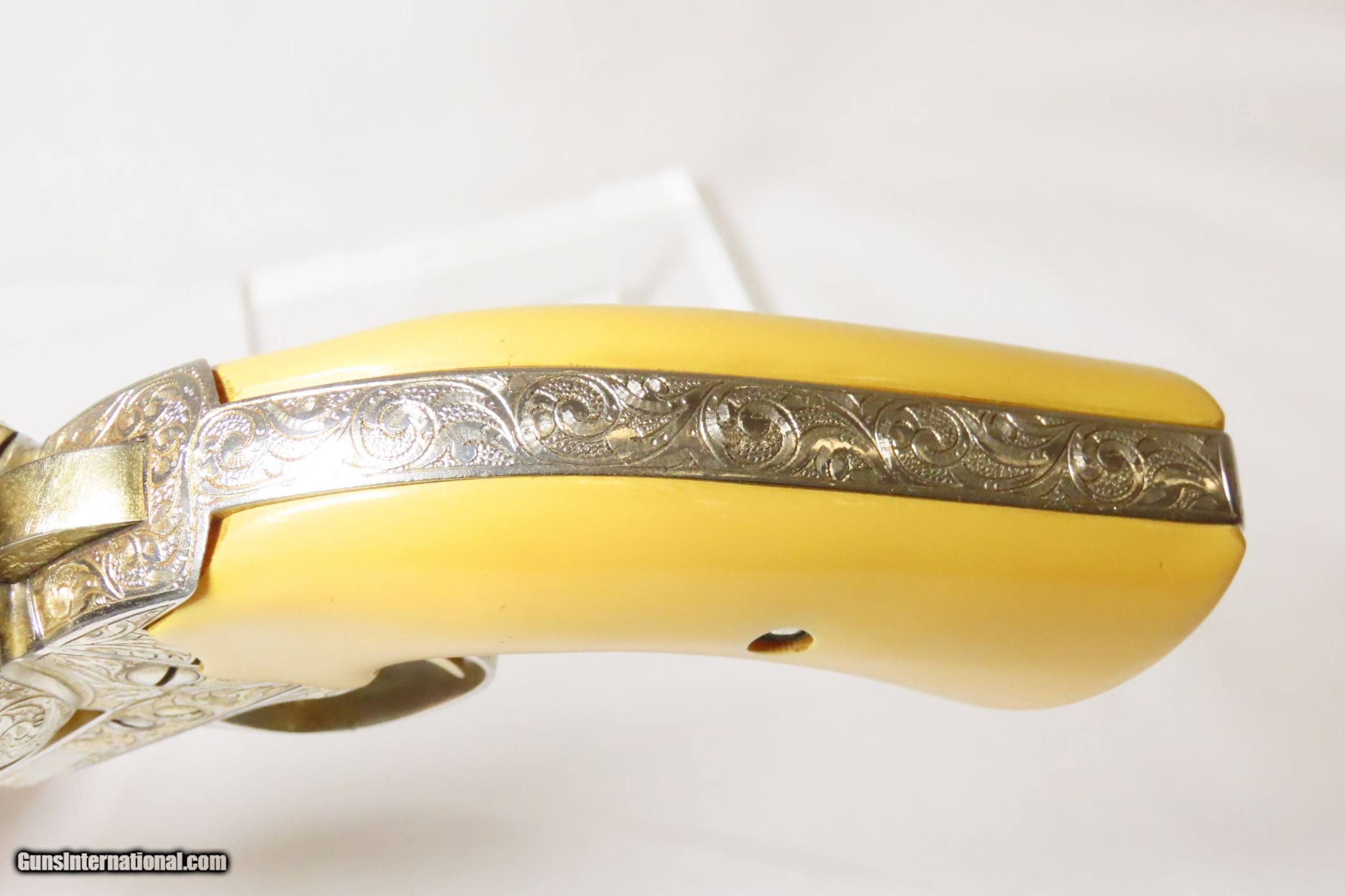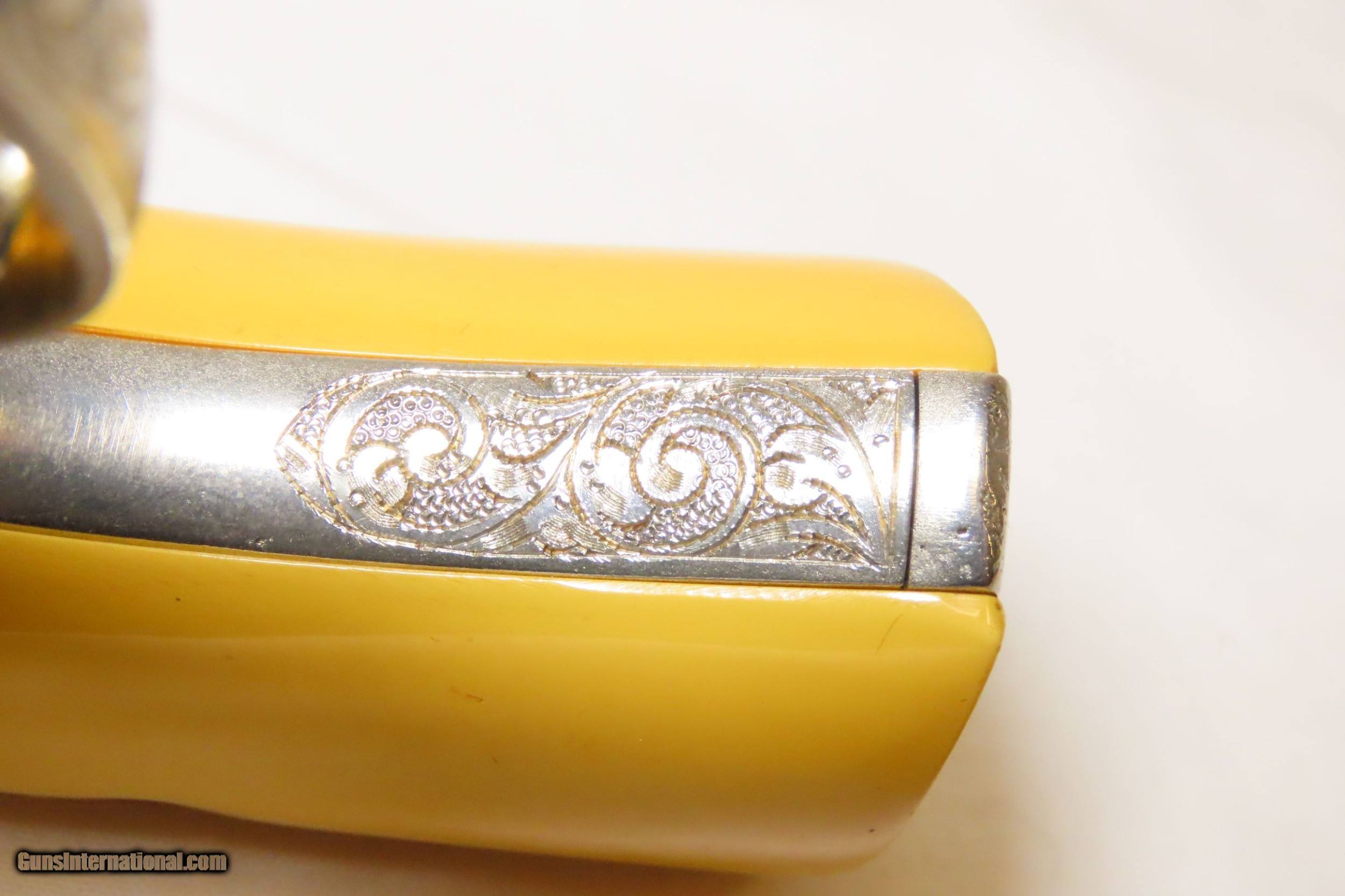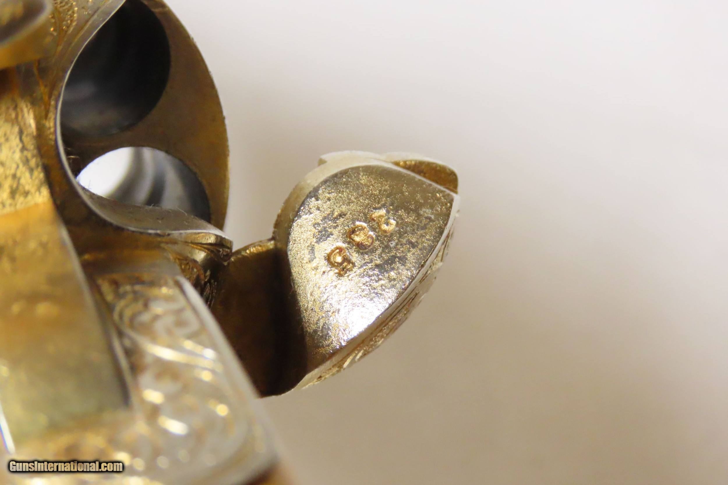 Description: c1906 mfrd. COLT BISLEY Model SINGLE ACTION ARMY .41 Colt Revolver SAA Gold Engraved with Gilt Finish Here we present an Engraved Colt Bisley Model Single Action Army Revolver in .41 Colt, manufactured in Hartford, Connecticut in 1906. Out of 44,350 Bisley revolvers made, only 3,159 were chambered for .41 Colt cartridges. This is an example of the Bisley variant of the Colt Single Action Army revolver. The primary differences were a lower hammer spur and a more curvaceous grip frame. These were optimized toward target shooting but many general users and shooters who were not simply target shooters preferred them as well. This one comes in the .41 Colt chambering, which was a manstopper in its day. The overall condition is fine. This one features very nice aftermarket scroll and punchdot engraving along with a gilt finish. The action is excellent with all 4 clicks and holding all notches. Cylinder indexes and locks up well. The bore is in great shape with strong rifling. The grips are ivory look-alike that are smooth and solid and yellowed. The numbers match. This firearm is classified as a Curio & Relic. Barrel is 4-3/4 inches. Caliber: .41 Colt Overall condition as seen in photos. Very Fast. Very Safe. FREE SHIPPING. Will need to be sent to your local FFL or C&R licensee. This firearm is classified as a Curio & Relic. Guaranteed AUTHENTIC & Includes CERTIFICATE OF AUTHENTICITY. ancestryguns $7235 #228294 SOLD Curio/Relic: Yes |
