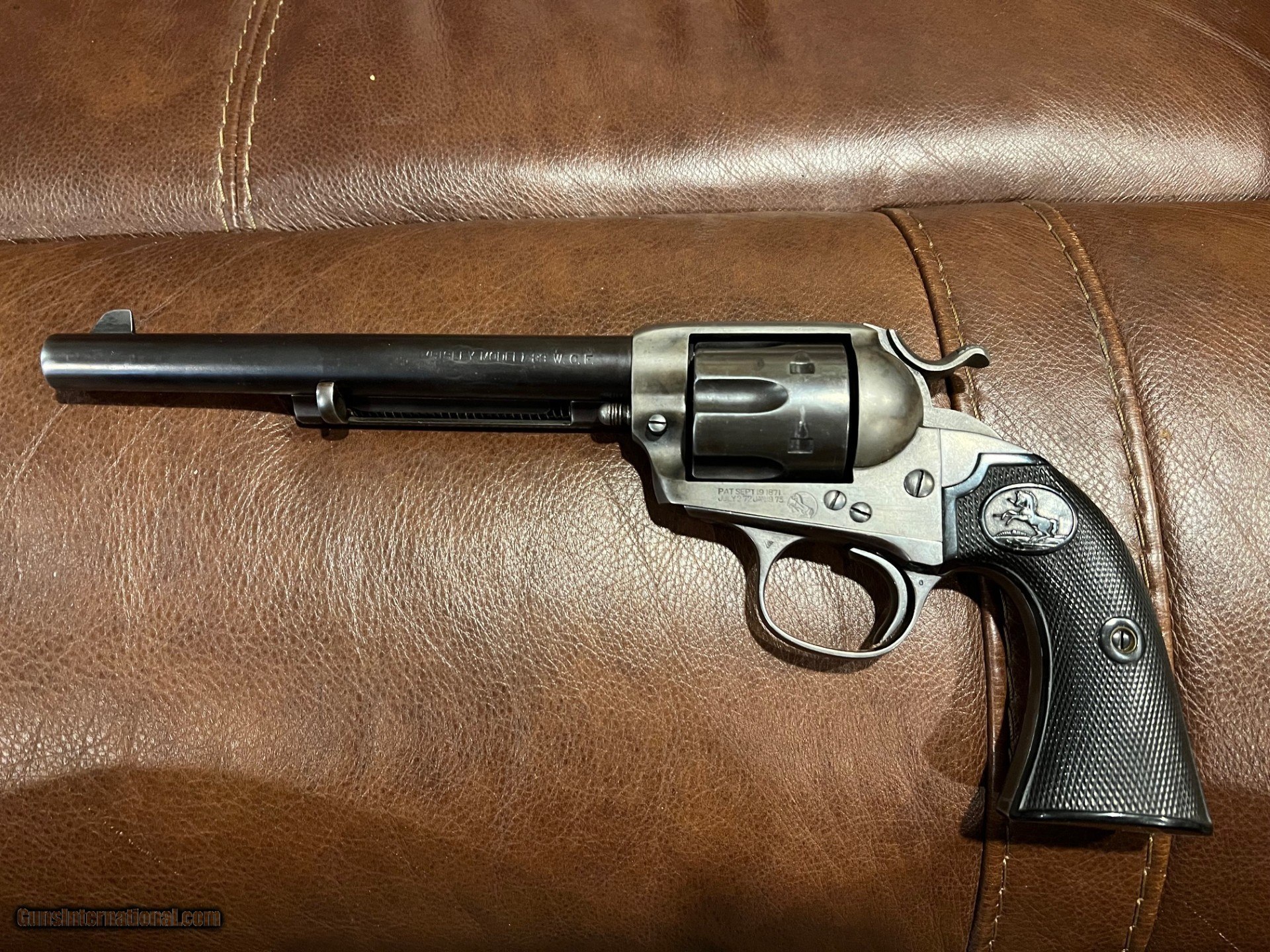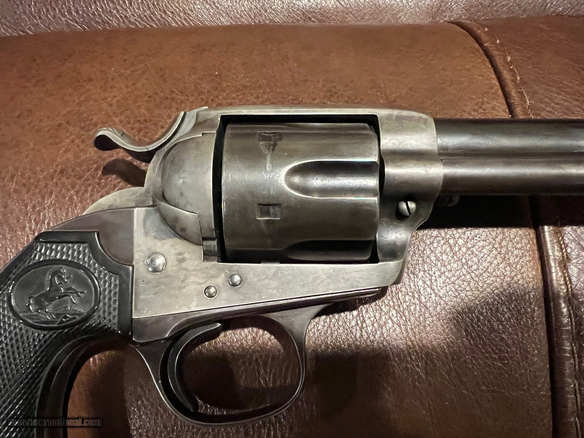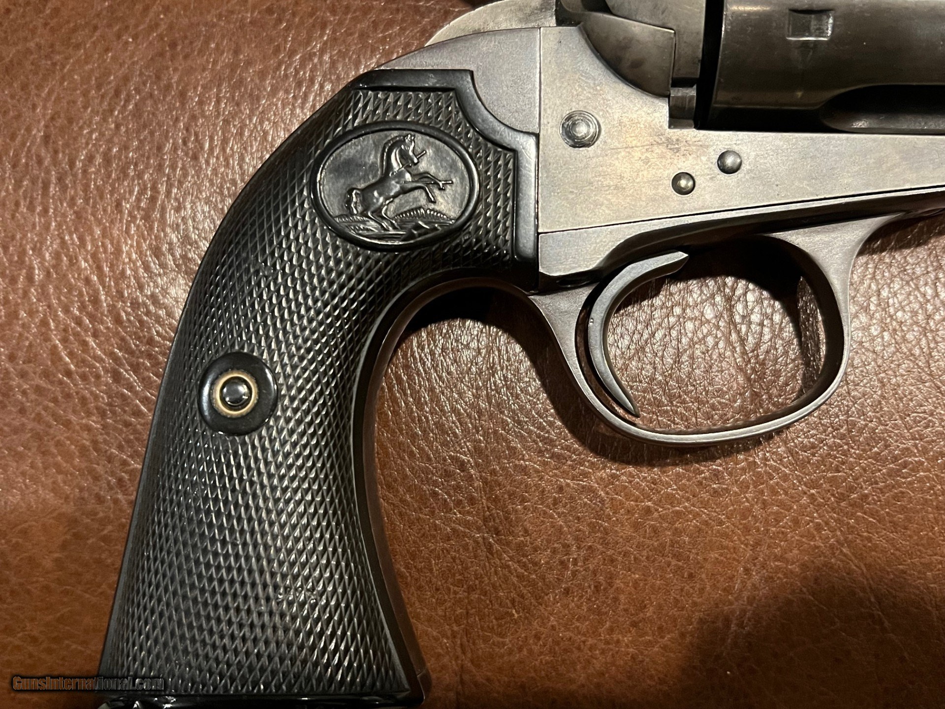 Description: This is a real nice original Colt Bisley in great condition. It is solid in it's single action cocking and lock up. It has all the correct features in the trigger/hammer notches and is timed correctly. You hardly ever see original grips in this condition. Not only still in one piece, but the checkering on the grip is sharp and they fit the gun perfectly. The pictures show how much original blue and color case remain. Few guns of this era still exhibit this much condition. This is a great revolver and is not common with the 7 1/2 inch barrel. The gun fuctions as it should and will satisfy the shooter as well as the collector...$3200.00 SOLD Curio/Relic: Yes |