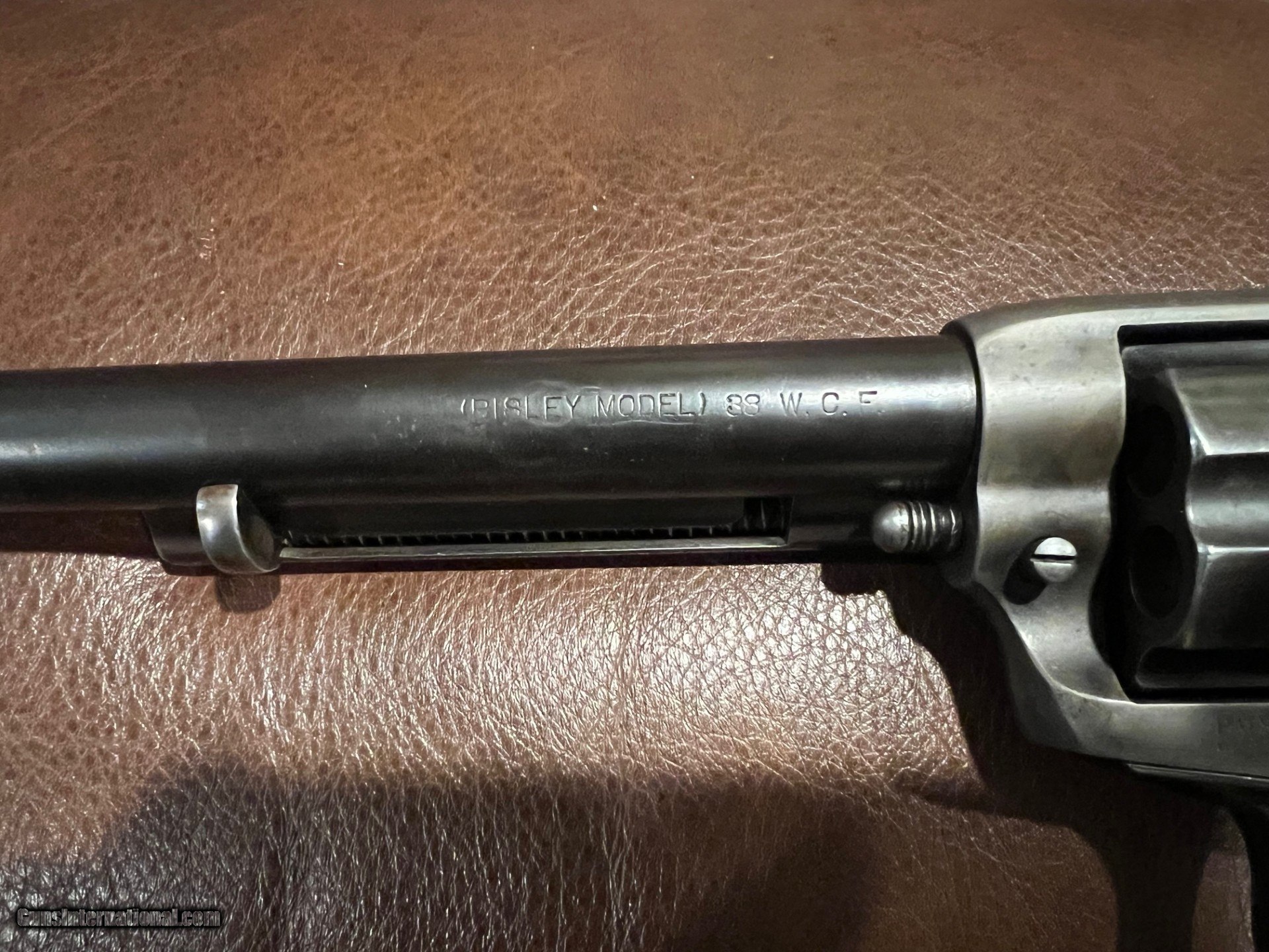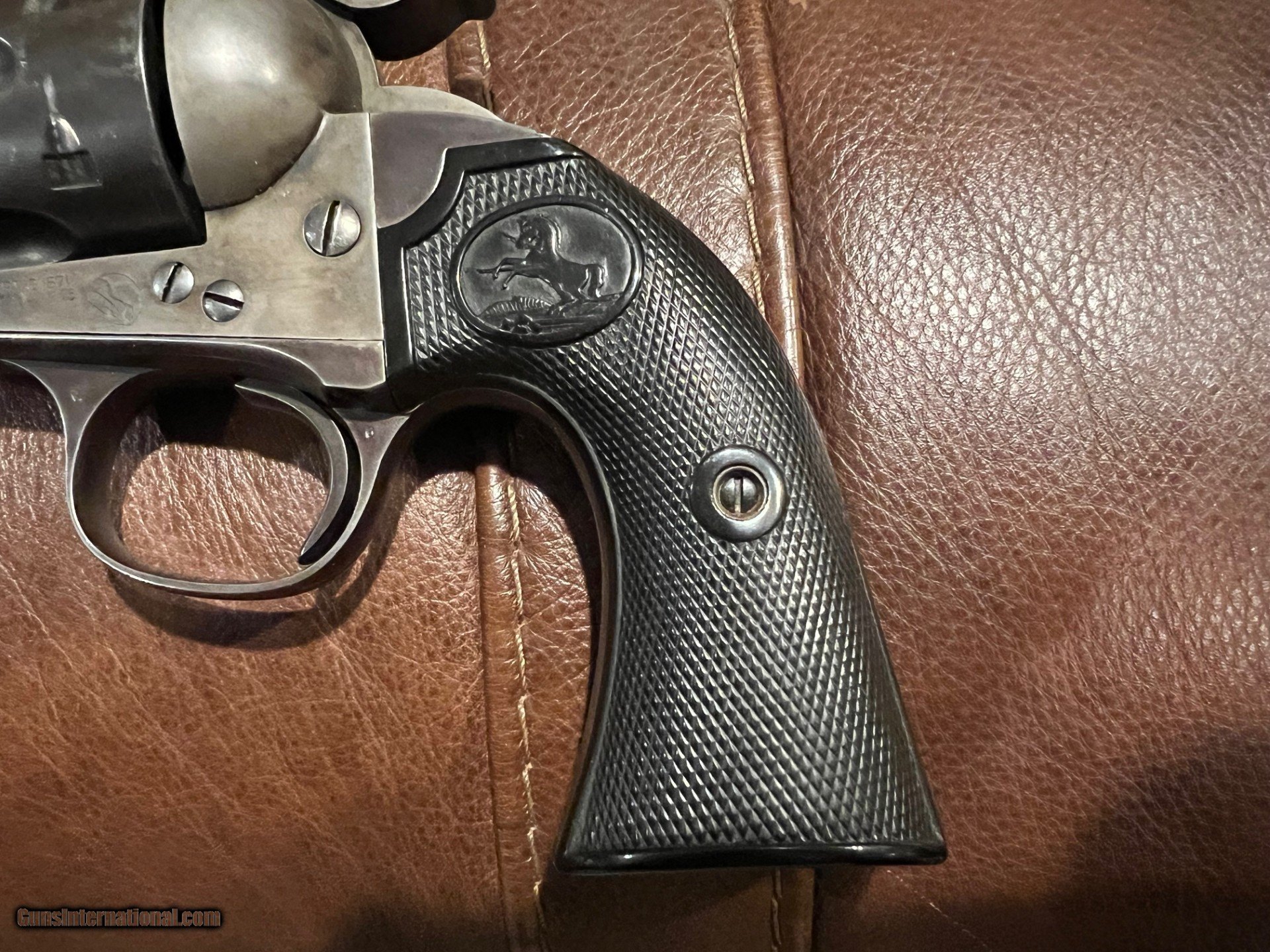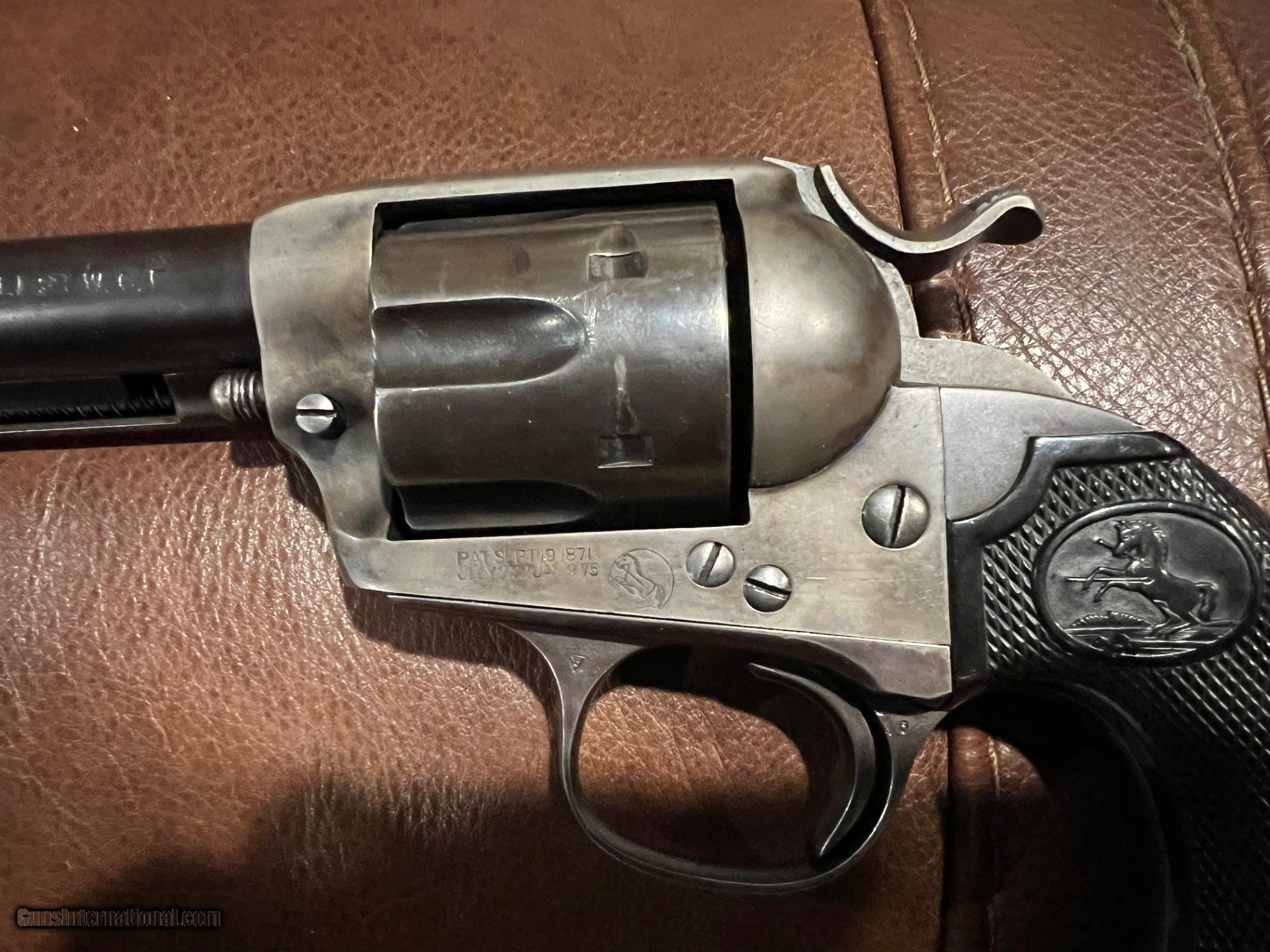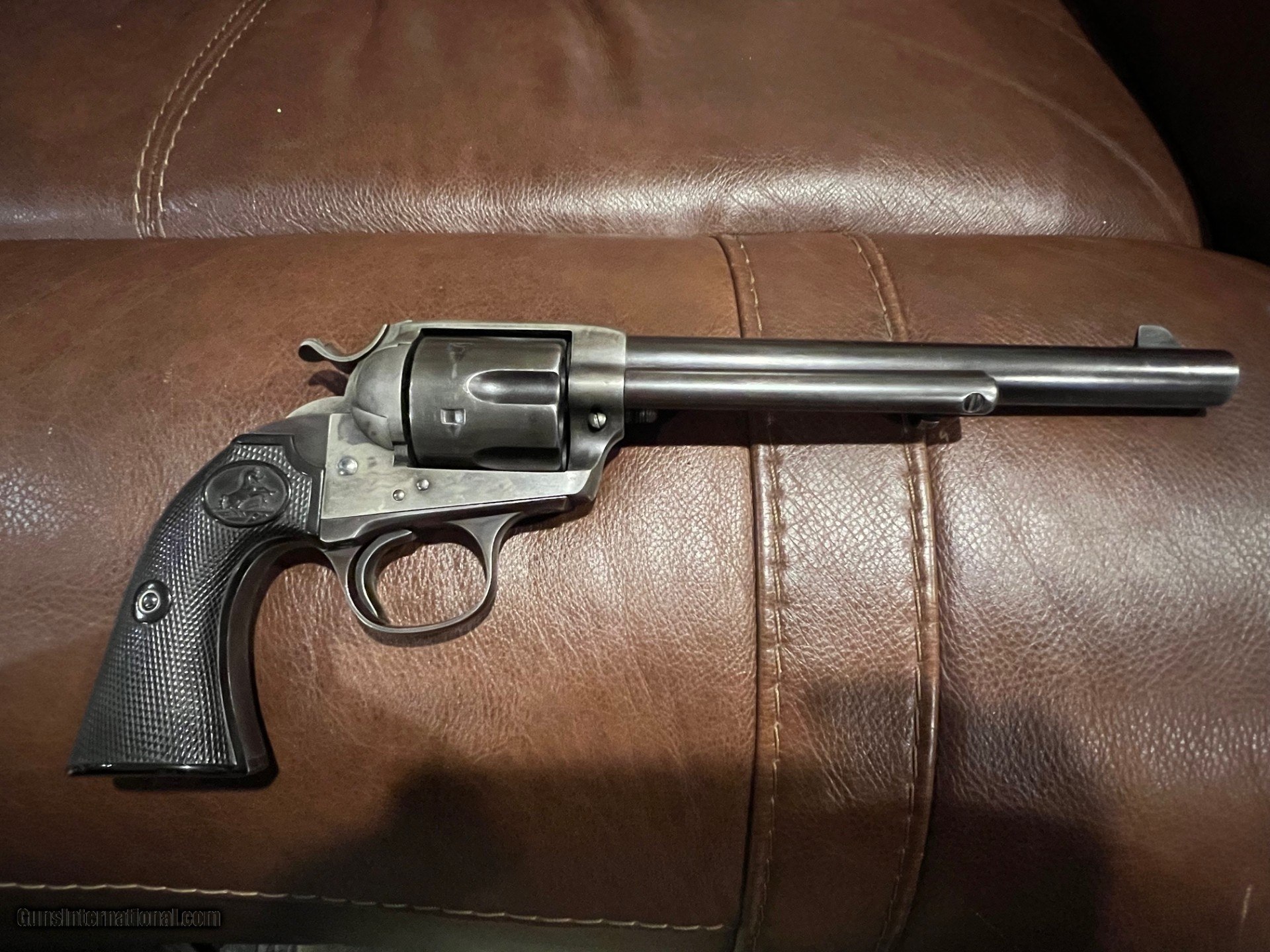 Description: This is a real nice original Colt Bisley in great condition. It is solid in it's single action cocking and lock up. It has all the correct features in the trigger/hammer notches and is timed correctly. You hardly ever see original grips in this condition. Not only still in one piece, but the checkering on the grip is sharp and they fit the gun perfectly. The pictures show how much original blue and color case remain. Few guns of this era still exhibit this much condition. This is a great revolver and is not common with the 7 1/2 inch barrel. The gun fuctions as it should and will satisfy the shooter as well as the collector...$3200.00 SOLD Curio/Relic: Yes |