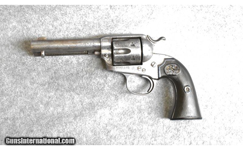 Description: Colt Bisley .38 W.C.F. .38 WCF SOLD Chambers: 6 shot revolver for single action. Metal Condition: Good, bluing worn off. Wood Condition: The grips are very good. Barrels: 5 inch with sights. Triggers: Single grooved trigger. Sights: Fixed blade front notch frame rear. Item Location: Kansas City, KS |