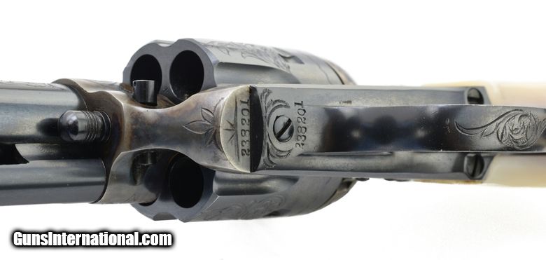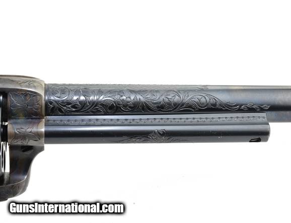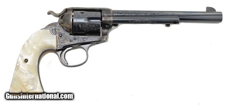 Beautiful factory engraved Colt Bisley .44 Russian caliber revolver. Made in 1902. Deluxe engraved gun by Colt master engraver William Glahn. 7½” barrel with blued barrel and case-hardened frame. Grips are factory pearl. This gun was originally shipped to J.F. Schmelzer &Sons Arms Company in Kansas City in 1902 and later sent back to the factory for engraving and caliber conversion. This gun is a .44 Russian and S&W Special caliber, one of only two guns known having a 7 ½ barrel. Gun is in near new condition. Accompanying this gun is a factory letter, as well as a letter by noted Colt author R.L. Wilson. Beautiful rare factory engraved Colt Bisley.
