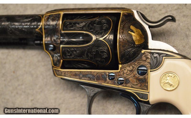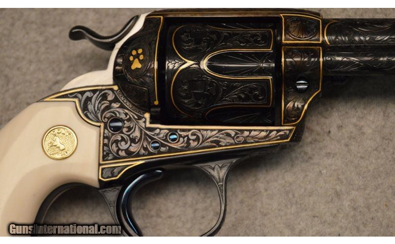 Description: Spectacular 1905 .45 Colt, Bisley Engraved by the late great Ken Hurst. Possibly the finest application of the artist work. The same work can be seen on the mate (SN: 241937), every surface expertly engraved with gold line accents, a gold wolf paw print, .45 Colt SOLD Metal Condition: Excellent as professionally embellished Barrels: 4 3/4" two line address Butt Pad: Colt Factory Ivory Grips Item Location: Fort Worth, TX |