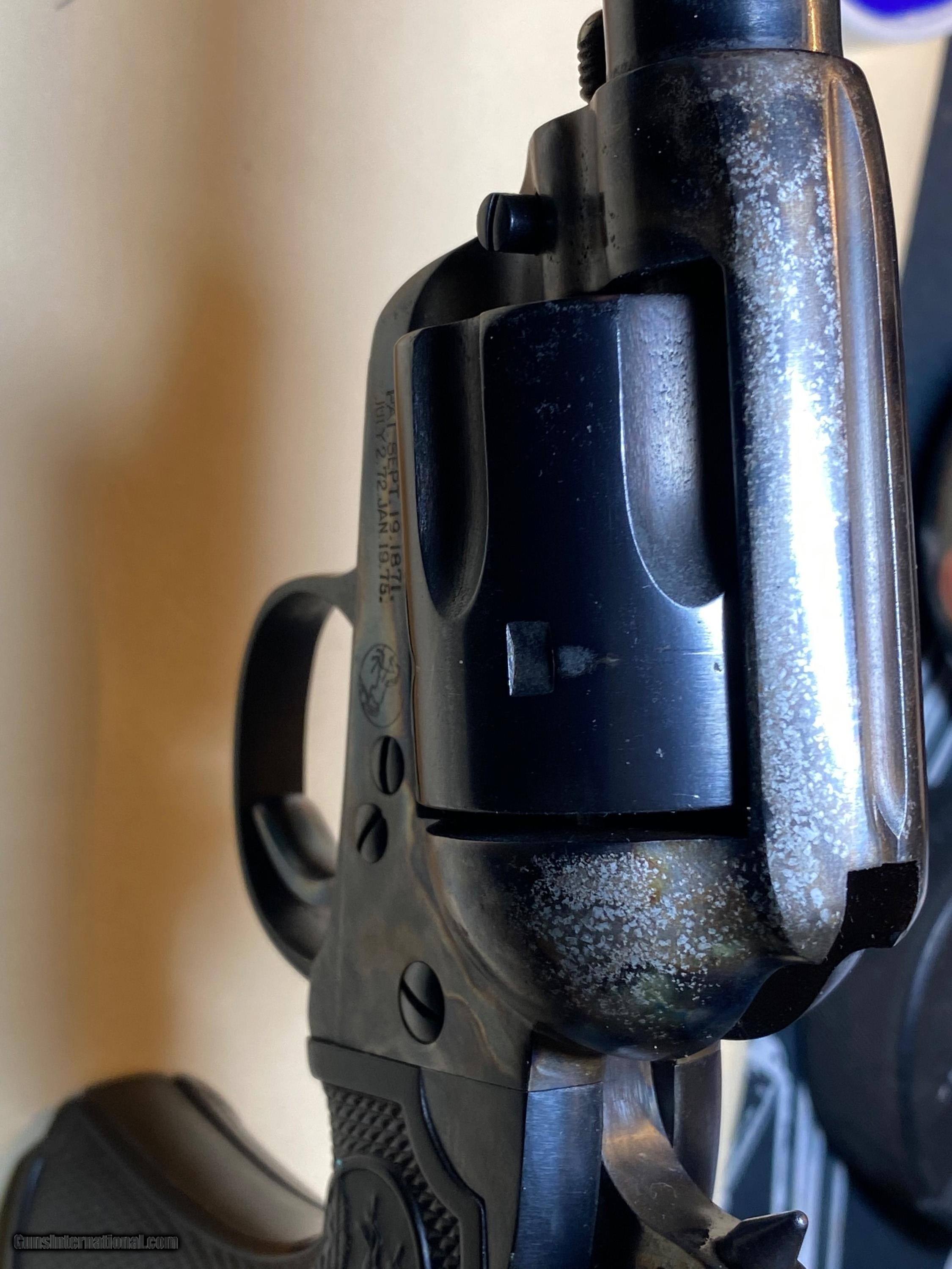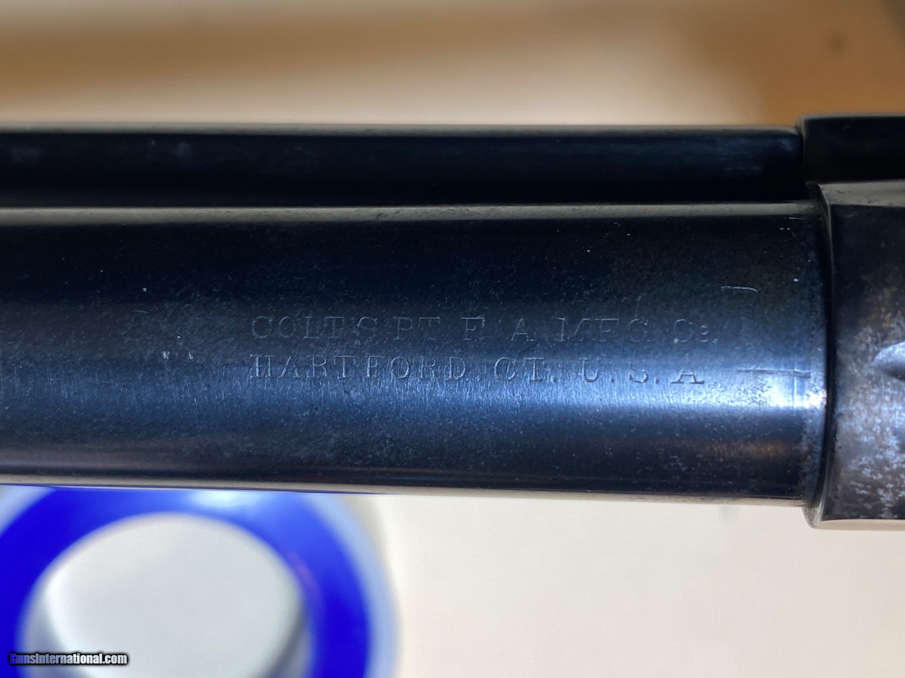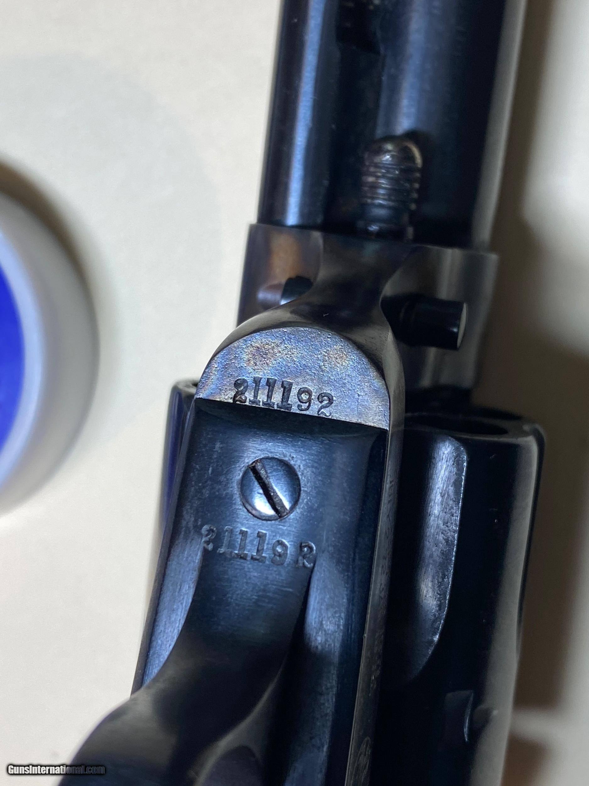 Description: #####SOLD####SOLD##### COLT BISLEY MODEL REVOLVER .41 Colt. SN 211 192. Mfg 1901 4-3/4" BARREL. COMES WITH COLT LETTER SHOWING THIS BISLEY WAS SHIPPED TO KRAKAUER,ZORK & MOYE CO IN ELPASO, TEXAS THIS BISLEY WAS BLUED AT THE FACTORY AND NOW HAS A BEAUTIFUL PROFESSIONAL RESTORATION. THE FRAME AND HAMMER WERE CASE HARDENED AND THE REST OF THE REVOLVER BLUED. PREP AND POLISH FOR RESTORATION WERE DONE RIGHT BEFORE BLUEING AND CASE HARDENING. THE TOP AND BACK LEFT SIDE OF THE FRAME IS TURNING TO A GRAY PATINA. THE BLUE ON THE REST OF THE REVOLVER IS 85%. THE ACTION IS VERY CRISP-STRONG AND ALL CLICKS ARE IN SYNC. THE CYLINDER LOCKS TIGHT ON ALL SIX CHAMBERS. ALL THREE SN's MATCH AND ARE CLEAR. THE BORE IS BRIGHT AND HAS ALOT OF SERVICE LIFE LEFT. THE LANDS ARE PROMINATE AND THE BORE SHOWS SOME LIGHT PITTING. THE VINTAGE RUBBER CHECKERED GRIPS SHOW LITTLE WEAR THE LEFT GRIP HAS A SMALL CHIP IN THE BASE THAT IS HARD TO DETECT. THIS FINE ALL ORIGINAL COLT BISLEY IS 121 YEARS OLD AND QUALIFIES C&R AND NEEDS TO BE SHIPPED TO YOUR FFL DEALER. SHIPPING IS INCLUDED IN THE PRICE. THE INCLUDED PICTURES SHOW THE GREAT CONDION OF THIS WELL MAINTAINED COLT BISLEY. SOLD Curio/Relic: Yes Handgun Caliber: .41 Long Colt (.41 Colt, .41 LC) Manufacturer: COLT Model: BISLEY Serial Number: 211 192 Barrel Length: 4-3/4” Bore: BRIGHT Chambers: VERY GOOD Condition: Very GOOD Metal Condition: VERY GOOD Bore Condition: VERY GOOD |