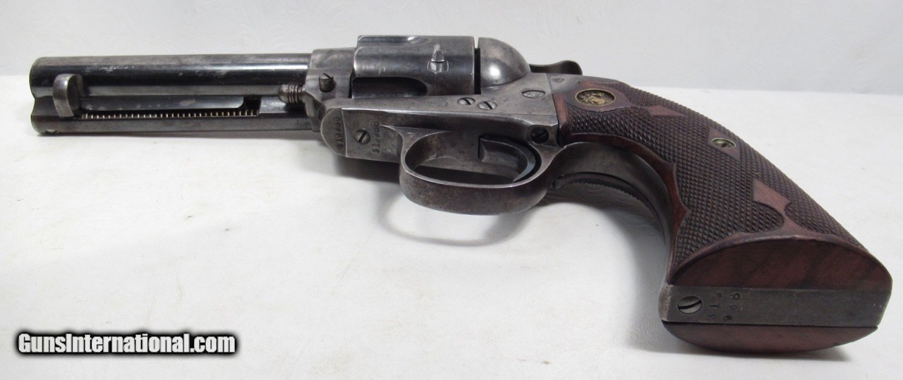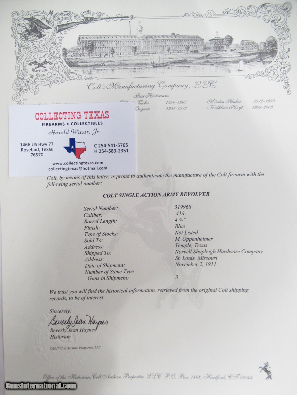 Description: Colt Bisley Model S.A.A. Revolver; Serial No. 319968; Per Two Included Factory Letters: .41 Caliber with 4 ¾” Barrel and Blue Finish; Shipped to Colt Distributor Norvell Shapleigh Hardware Company of St. Louis, Missouri on November 2, 1911 as Part of a 3 Gun Shipment and Sold to M. Oppenheimer of Temple, Texas; Lots of Original Metal Finish Remains; Killer Deep Dish Medallion Fleur-de-lis Grips; All Numbers Match; Perfect Original Screws and Full Front Sight; PERFECT ACTION and TIGHT LOCKUP; Perfect Bore; Rare 111 Year-Old Texas Bisley; See All Photos for Condition; No Texts; Call (254)541-5765 or Email Only; PERSONAL PROPERTY of Harold Wieser; Price: $4,975 + $45 S&H Via USPS PRIORITY MAIL; Payment Address: Harold Wieser - 1466 U.S. Hwy 77 - Rosebud, TX 76570; SEND PAYMENTS VIA USPS PRIORITY MAIL; BEWARE of SCAMS!!! – DO NOT SEND MONEY or CORRESPONDENTS ELECTRONICALLY UNLESS YOU HAVE SPOKEN to HAROLD WIESER FIRST! 254-541-5765 SOLD Manufacturer: Colt Model: Bisley Serial Number: 319968 |