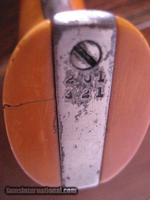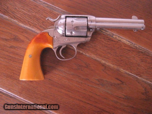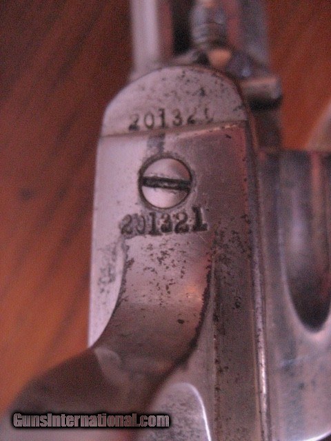 Description: Colt Bisley Model Revolver with Official Colt Archives Letter. .45 Colt caliber. Good bore grooves, some darkening. Nickel plating finish has pitting and wear about 50%. Replacement grips are in good conditon other than crack on right grip. Colt archives letter states shipped to Witte Hardware Company, St. Louis Missouri, October 31, 1900 Completely functional and shootable. Zelle, cashiers check, money order or personal check accepted. SOLD Curio/Relic: Yes Handgun Caliber: .45 Colt Manufacturer: Colt Model: Bisely Serial Number: 201321 Barrel Length: 4 3/4 Condition: Fair Metal Condition: For Bore Condition: Fair Action: revolver Manufacture Date: 1900 |