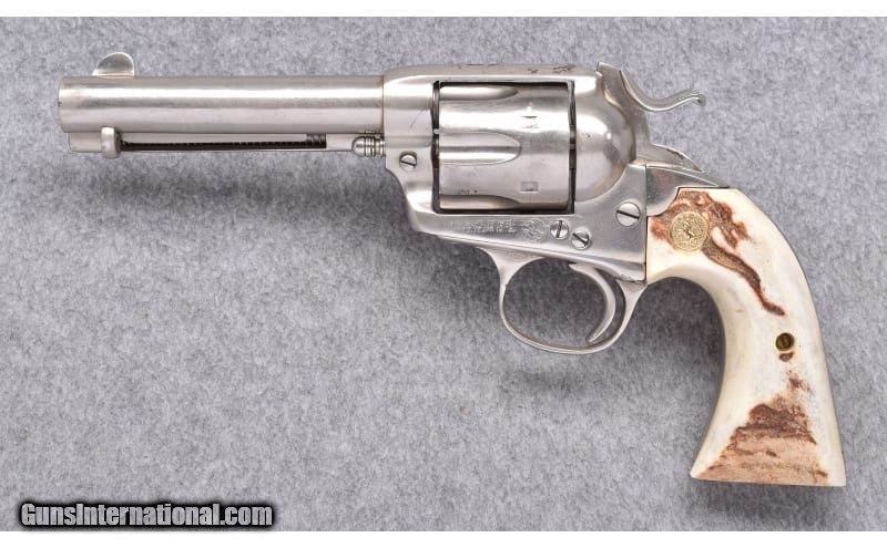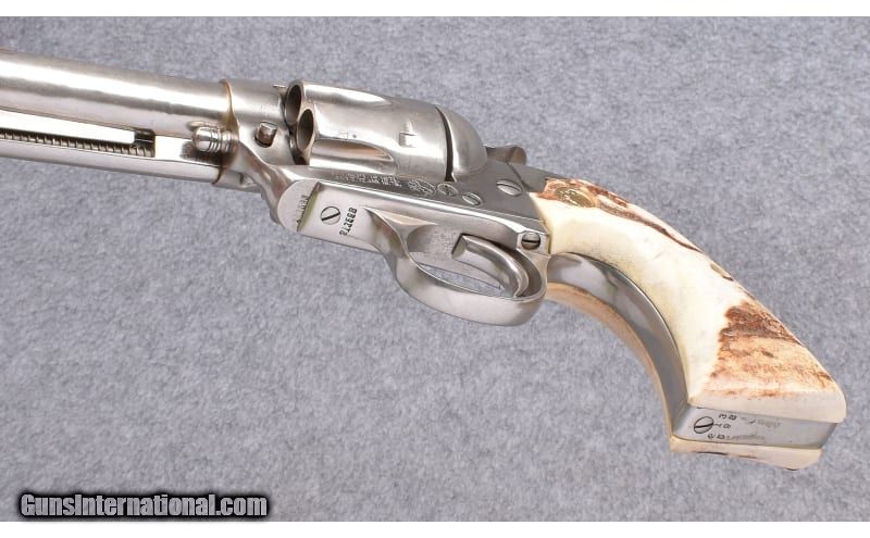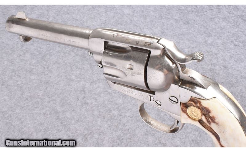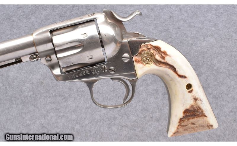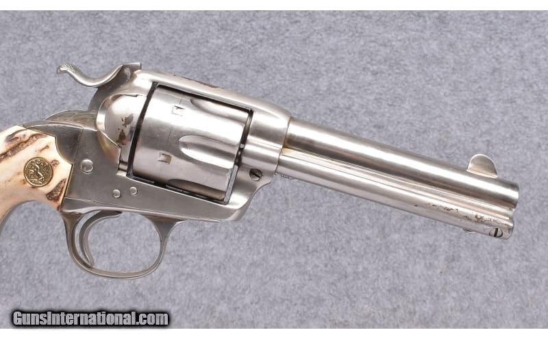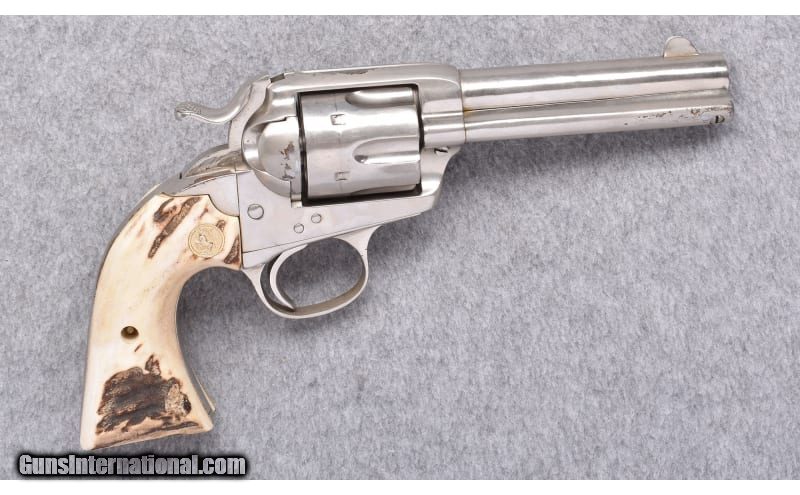 Description: 1901 vintage Bisley, heavily polished with re-nickeled finish appearing dull and flaking in places. Grips replaced with stag panels with Colt medallions. Matching numbers, action offers four distinct clicks with firm lock-up. Shootable bore. .45 Colt SOLD Metal Condition: Nickel Plated Bore Condition: Good Barrels: 4 3/4 Triggers: Single Action Weight: 38 oz Sights: "Notched Frame, Blade Front Item Location: Buda, TX |