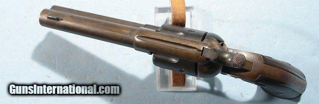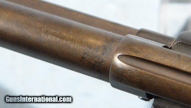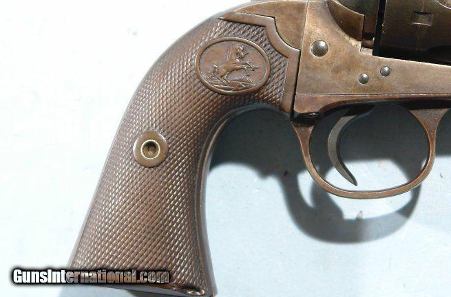 Description: COLT BISLEY SINGLE ACTION FRONTIER SIX SHOOTER .44-40 CAL. 4 ¾” REVOLVER CA. 1901 W/FACTORY LETTER. All matching serial numbers in the 206,xxx range. Factory records state it was shipped to Simmons Hardware, St. Louis, Mo. Feb. 20, 1901 as a .41 Colt cal. 5 ½”. Appears factory re-barrel in same time period with “COLT FRONTIER SIX SHOOTER” roll die barrel and cylinder with patina matching rest of gun. Very good plus overall with approximately 50% blue and case hardening mixed with dark patina. All original parts and screws. Excellent original hard rubber grips. Fine markings. Working order and very good bore and chambers. SOLD Curio/Relic: Yes |