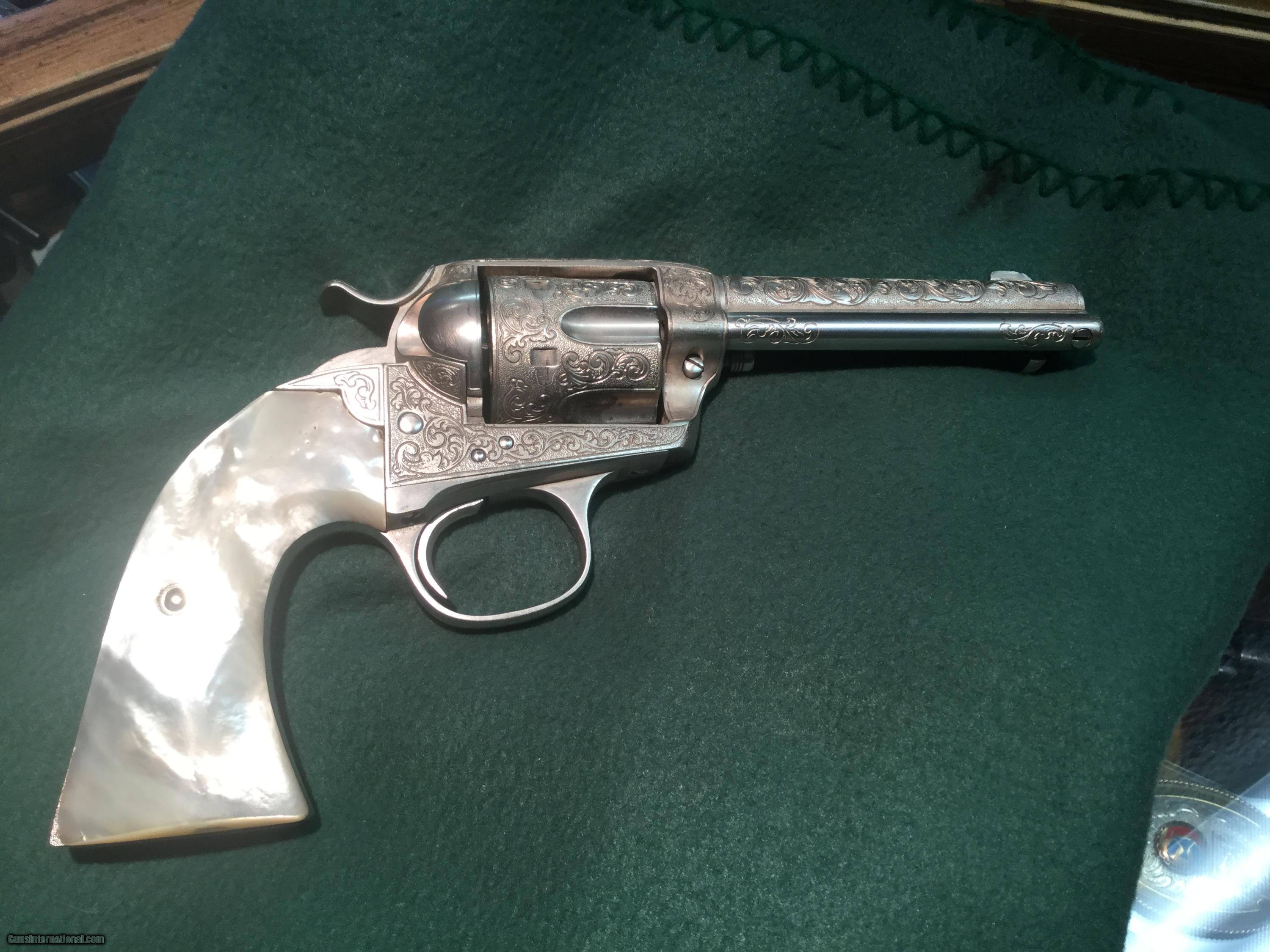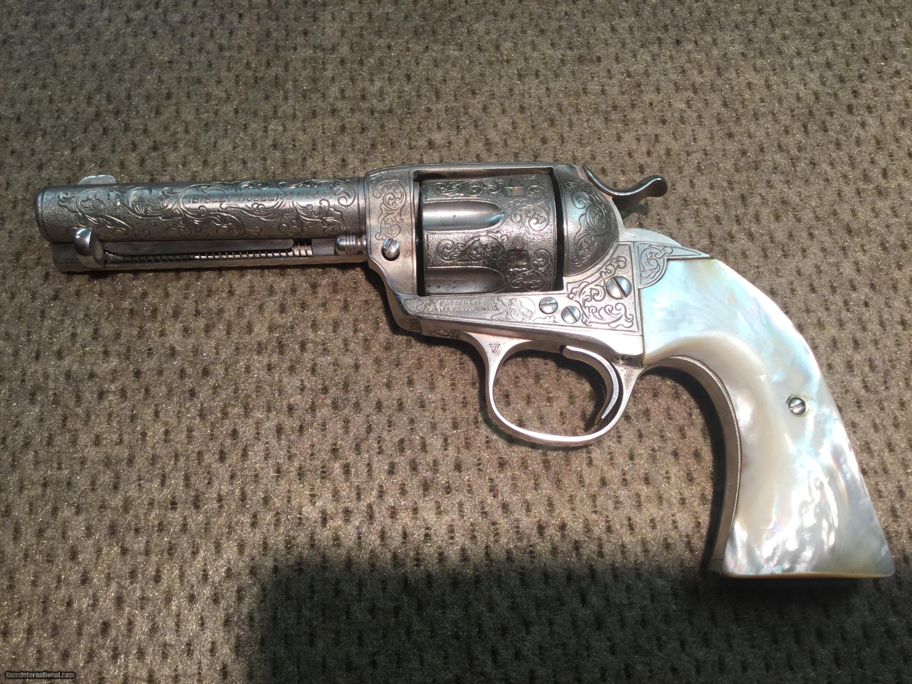 Description: This is a Colt Bisley SAA in 32-20 cal silver plated , Engraved, Factory pearl Grips. This colt was nade in 1911 very tight and locks up fine , A Very old and early Colt Bisley made in time when Titanic was sailing. Please see all pictures. call Richard New # 406-407-0698 SOLD Curio/Relic: Yes Manufacturer: Colt Model: Bisley Serial Number: 315576 Caliber Info: 32-20 Bore: goo Condition: very honest gun Metal Condition: good Bore Condition: good Barrel Type: 4. 3/4 Action: SAA Stock: Factory pearl Finish: silver /Nickel Manufacture Date: 1911 Engraving: full engraving |