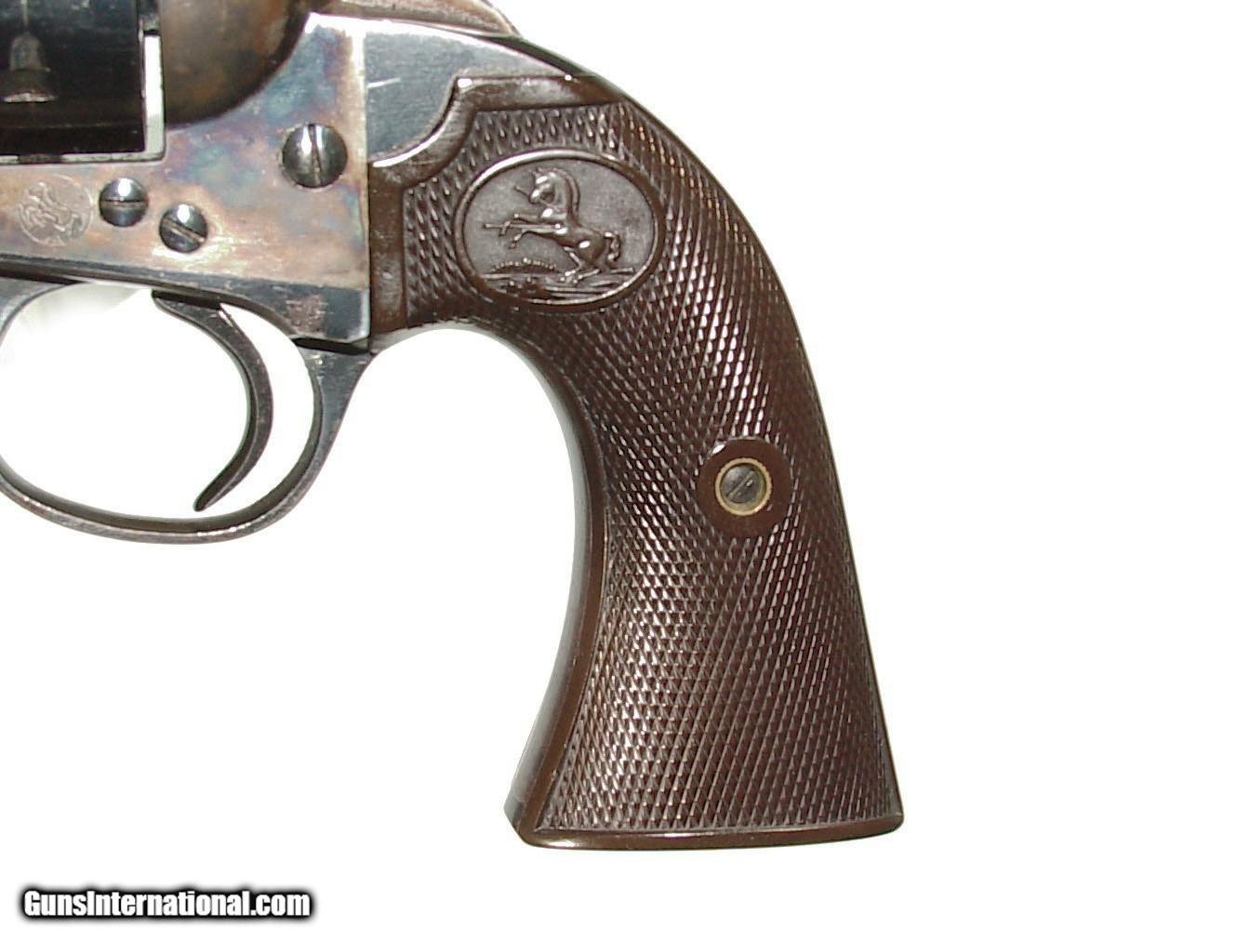 Description: .38 W.C.F. caliber, 7 1/2" barrel, blue and casehardened finish with black checkered hardrubber grips. The barrel and ejector housing retain 95-97% original blue with a small flaked spot on the left side near the muzzle most likely from a holster. The cylinder showing nearly all of the blue with the front and back strap much the same. The receiver has all of the original casehardened finish. Mint bore, mechanically excellent. Serial range 2446xx for 1903. Factory records show that this was shipped to Denver, Colorado. SOLD Curio/Relic: Yes |