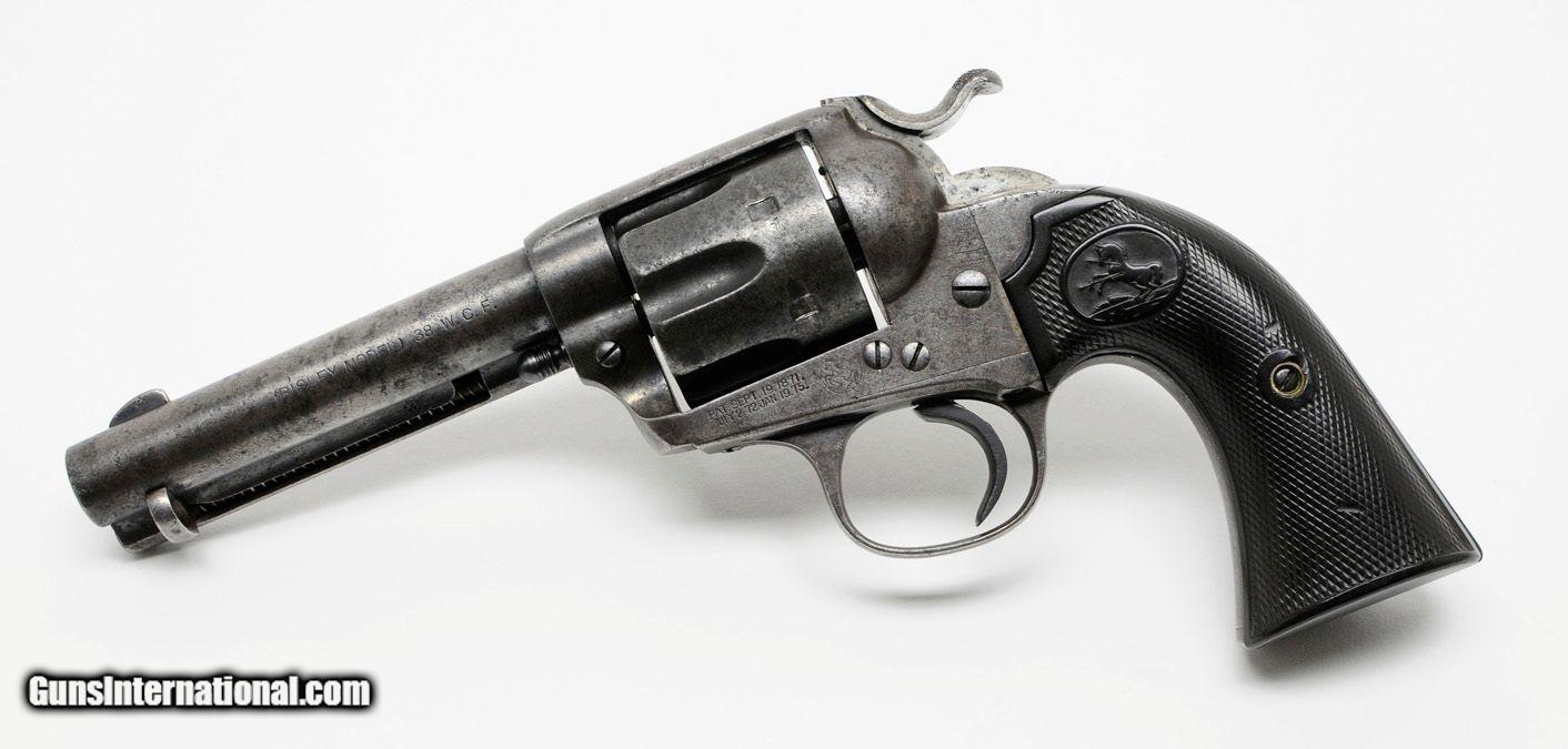 Description: Colt SAA Bisley Model 38 WCF. DOM 1904 'The Colt Bisley was introduced in 1894 as a target pistol. The name Bisley came from the famous firing range in Bisley, England.[17] The Colt Bisley can be distinguished by the longer grip, the wider hammer spur, and the wider trigger. Most Bisley Standard Model Revolvers which were shipped to a United States address were not used for target shooting but for self-defense because the grip and hammer were ideal for fast shooting.' wikipedia SPECIFICATIONS