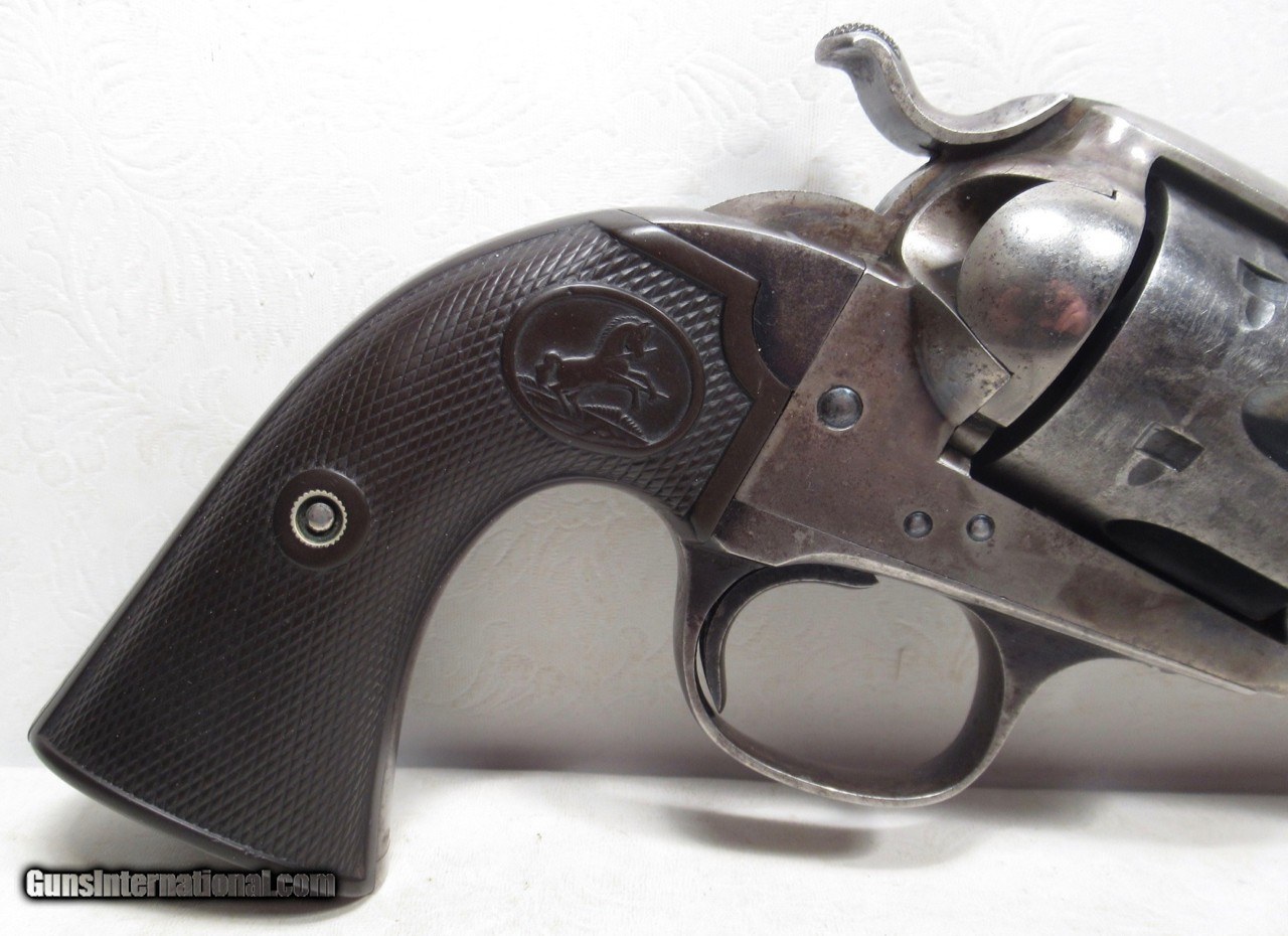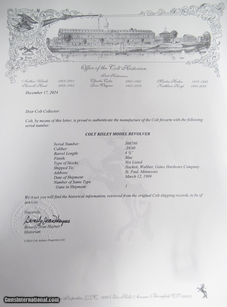 Description: Colt Bisley Model Revolver; Serial No. 306780; Per Included Factory Letter: .38/40 Caliber with 4 ¾” Barrel and Blue Finish; Shipped to Hackett, Walther, Gates Hardware Company of St. Paul, Minnesota on March 12, 1909 as One Gun Shipment; 100% Correct and Original; All Matching Numbers Including Grips and Gun Barrel; Good Amount of Original Finish; Nice Original Colt Hard Rubber Grips; Full Front Sight; Perfect Tight Action; Near Perfect Strong Bore; Perfect Original Screws; Hard to Find 116 Year-Old Original Unaltered Colt Revolver; See All Photos for Condition; No Texts; Call (254)541-5765 or Email Only; PERSONAL PROPERTY of Harold Wieser; NOTICE: We Do Not Do Any Consignments - All Items Listed are Owned by Us - NO SALES to New Jersey or New York City - Antiques Only to Massachusetts and California; NOTE: All Modern Firearms Must Go to FFL Dealer who will Accept From Individual with Texas Driver License; Price: $2,775 + $45 S&H Via USPS Priority Mail; Payment Address: Harold Wieser - 1466 U.S. Hwy 77 - Rosebud, TX 76570; SEND PAYMENTS VIA USPS PRIORITY MAIL; BEWARE of SCAMS!!! - DO NOT SEND MONEY or CORRESPONDENTS ELECTRONICALLY UNLESS YOU HAVE SPOKEN to HAROLD WIESER FIRST! (254)541-5765 SOLD Manufacturer: Colt Model: Bisley Serial Number: 306780 |