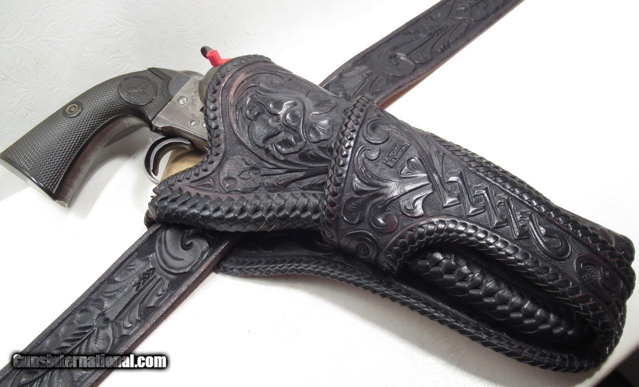Description: Colt Bisley Model Revolver; Serial No. 215651; Per Included Factory Letter: .45 Caliber with 5 ½” Barrel and Blue Finish; Shipped to Walter Tips of Austin, Texas on October 5, 1901 as Part of a 2 Gun Shipment; Good Amount of Original Factory Finish Present; Perfect Action and Bore; Great Colt Hard Rubber Grips; Nice 1 ¾” Wide and 39” L.O.A. Tooled Black Belt and Very Nice Jockstrap Holster; Belt Marked “S.D. Myres – El Paso, Tex.” and Holster Marked “S.D. Myres – El Paso”; 121 Year-Old Texas Shipped Colt Bisley Model Revolver; See All Photos for Condition; No Texts; Call (254)541-5765 or Email Only; PERSONAL PROPERTY of Harold Wieser; Price: $7,975 + $45 S&H Via USPS PRIORITY MAIL; Payment Address: Harold Wieser - 1466 U.S. Hwy 77 - Rosebud, TX 76570; SEND PAYMENTS VIA USPS PRIORITY MAIL; BEWARE of SCAMS!!! – DO NOT SEND MONEY or CORRESPONDENTS ELECTRONICALLY UNLESS YOU HAVE SPOKEN to HAROLD WIESER FIRST! 254-541-5765 SOLD Manufacturer: Colt Model: Bisley Serial Number: 215651 |