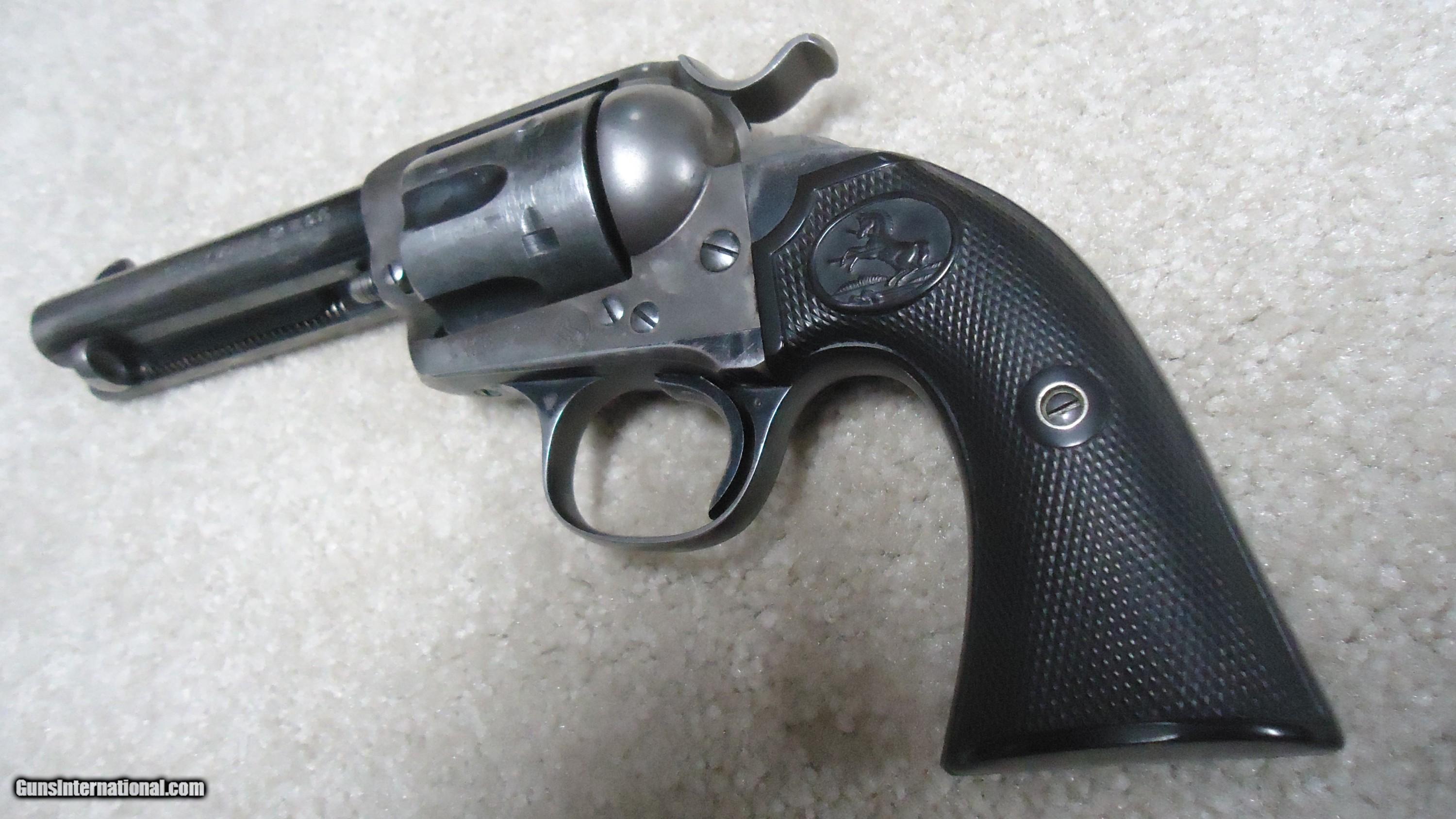 Description: VERY FINE CONDITION BISLEY, .32-20, 4 3/4" BARREL, #299XXX, MADE 1907. This is a really nice example that came out of here in Montana. Fine deep blue on the barrel with only the usual silvering/mixing on the left side from holster wear and some silvering on the outside of the ejector housing with deep blue on the upper and lower portion. Fine evenly thinning blue on the cylinder with deep blue in the flutes. Bright blue on the upper back strap around the hammer, around the trigger guard bow and on the butt with the grip straps mostly gray. The right side of the frame shows nice, even light case colots with more vivid color ahead of the cylinder. The Left side case colors have faded to a mottled gray with good color on the frame ahead of the cylinder. Exc. markings including the correct two line barrel address and Bisley Model marking on the left side as well as the patent dates/rampant colt on the left side of the frame. Exc. screws and cylinder pin. Matching numbers, nice fire blue on the trigger sides, exc. grips fit perfectly, front sight has not been altered and retains deep blue on the sides, tight mech. with four clicks to the hammer and a minty, bright bore! One of the better Bisleys I've offered in a while. Getting hard to find with this much blue and case color. A sharp 117 year old Colt! SOLD Curio/Relic: Yes Handgun Caliber: .32-20 Winchester (.32 WCF, .32-20 Marlin, .32 Colt Lightning ) Manufacturer: COLT Model: BISLEY Serial Number: 299XXX Barrel Length: 4 3/4 Condition: FINE+ Bore Condition: EXCELLENT |
