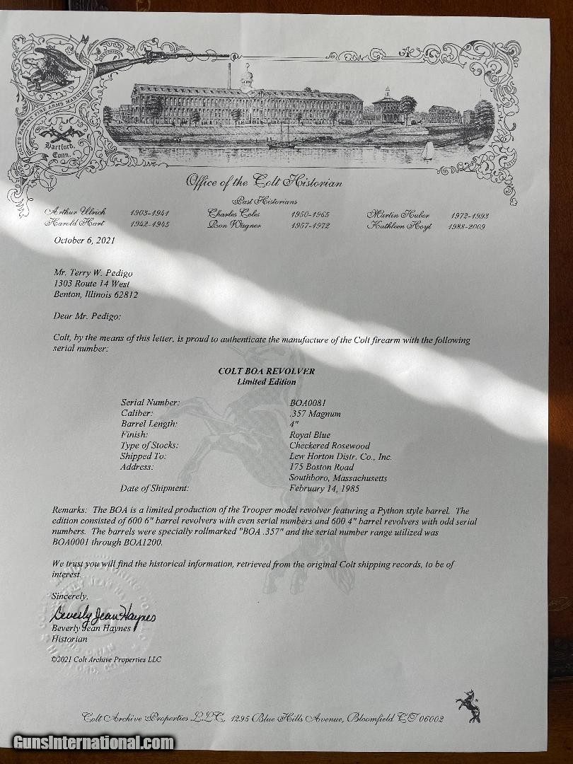 Description: (SOLD PENDING FUNDS) COLT BOAS CONSECUTIVE SET 2 DIGIT SERIAL NUMBERS. SERIAL NUMBER 81 AND 82. THESE COME FROM COLT WITH THE FACTORY WOODEN PRESENTATION CASE ALONG WITH THE FACTORY BOXES AND PAPER WORK. GUNS ARE UNFIRED NEW IN BOX. VERY RARE FIND. FACTORY COLT LETTERS PICTURES TELL ALL. ANY QUESTIONS CALL JOHN AT 816-634-2500 OR EMAIL AT purekcgmail. SOLD Handgun Caliber: .357 Magnum |