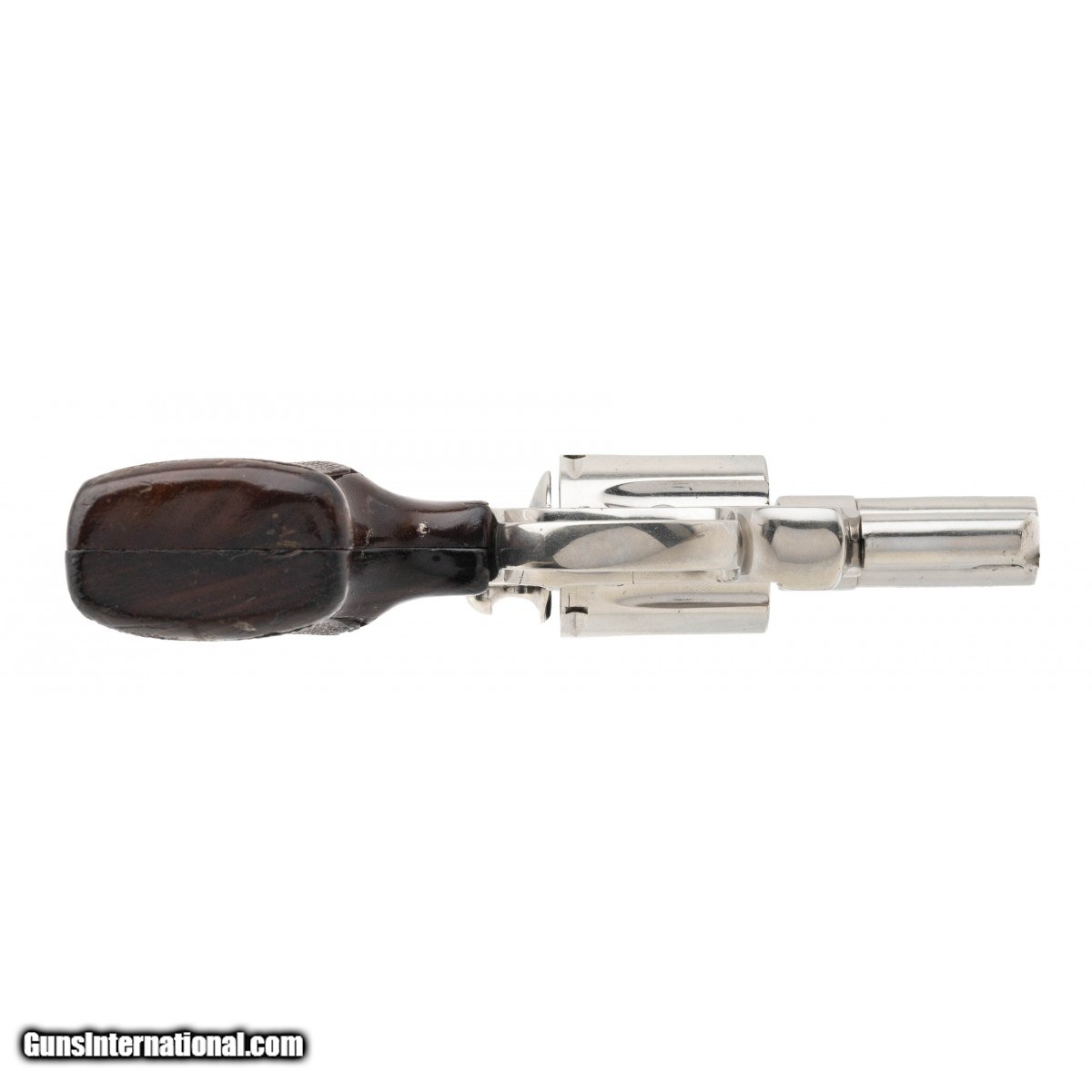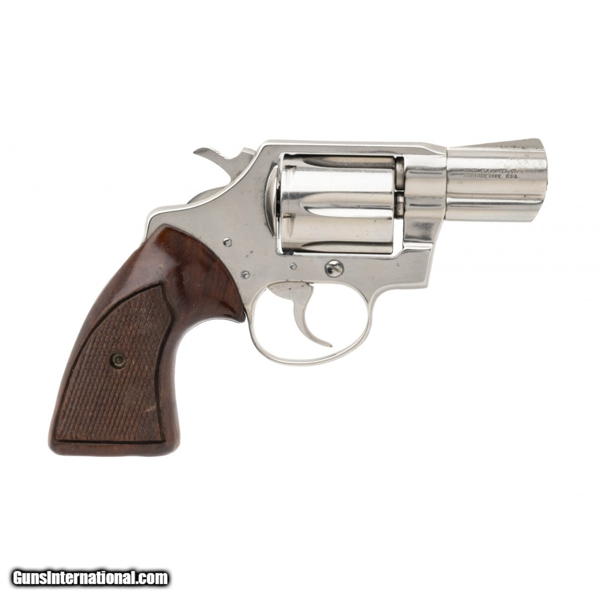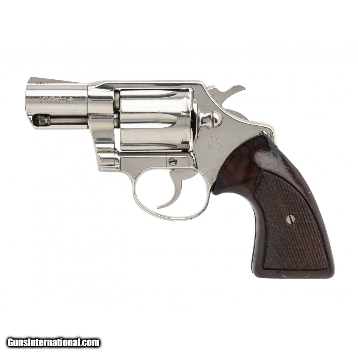 Description: "SN: H78014. Made in 1975. .38 Special with a 2"" snub nose barrel. Bore is in very good condition. Snub nose Colt double action revolver with a Nickel plated alloy frame. Metal is in good condition with wear noted on cylinder and right side of barrel. Wood grips are in good condition with handling wear. Overall condition is good condition. SOLD |