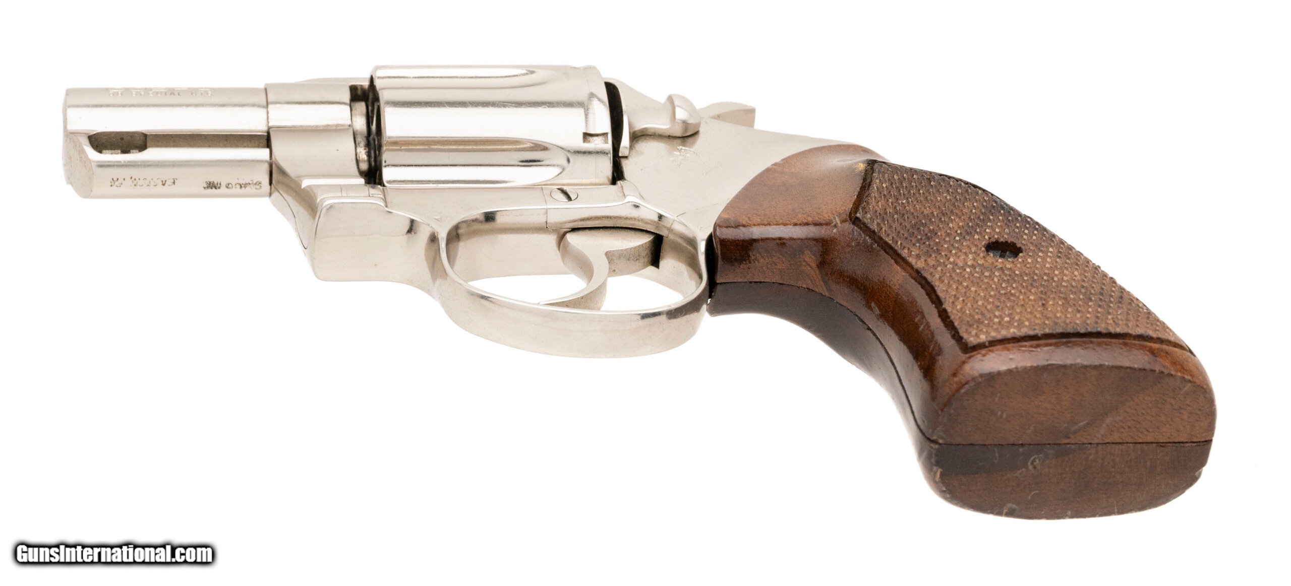 Description: "SN:H83599. Made in 1975. .38 Special with a 2"" barrel. Bore is in very good condition. Vintage 70's nickeled Snub nose revolver. Finish and grips are in very good condition with wear noted and import mark under barrel. Overall condition is very good. SOLD |