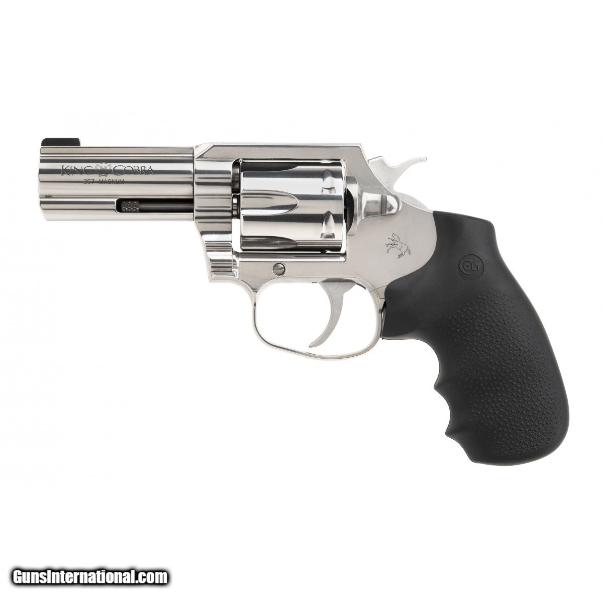 Description: " Colt's Manufacturing, King Cobra revolver, 357 magnum, 3"" lug barrel, steel frame, stainless finish, hogue grips, 6rd, brass bead front sight. NEW UPC:098289001283 SOLD |