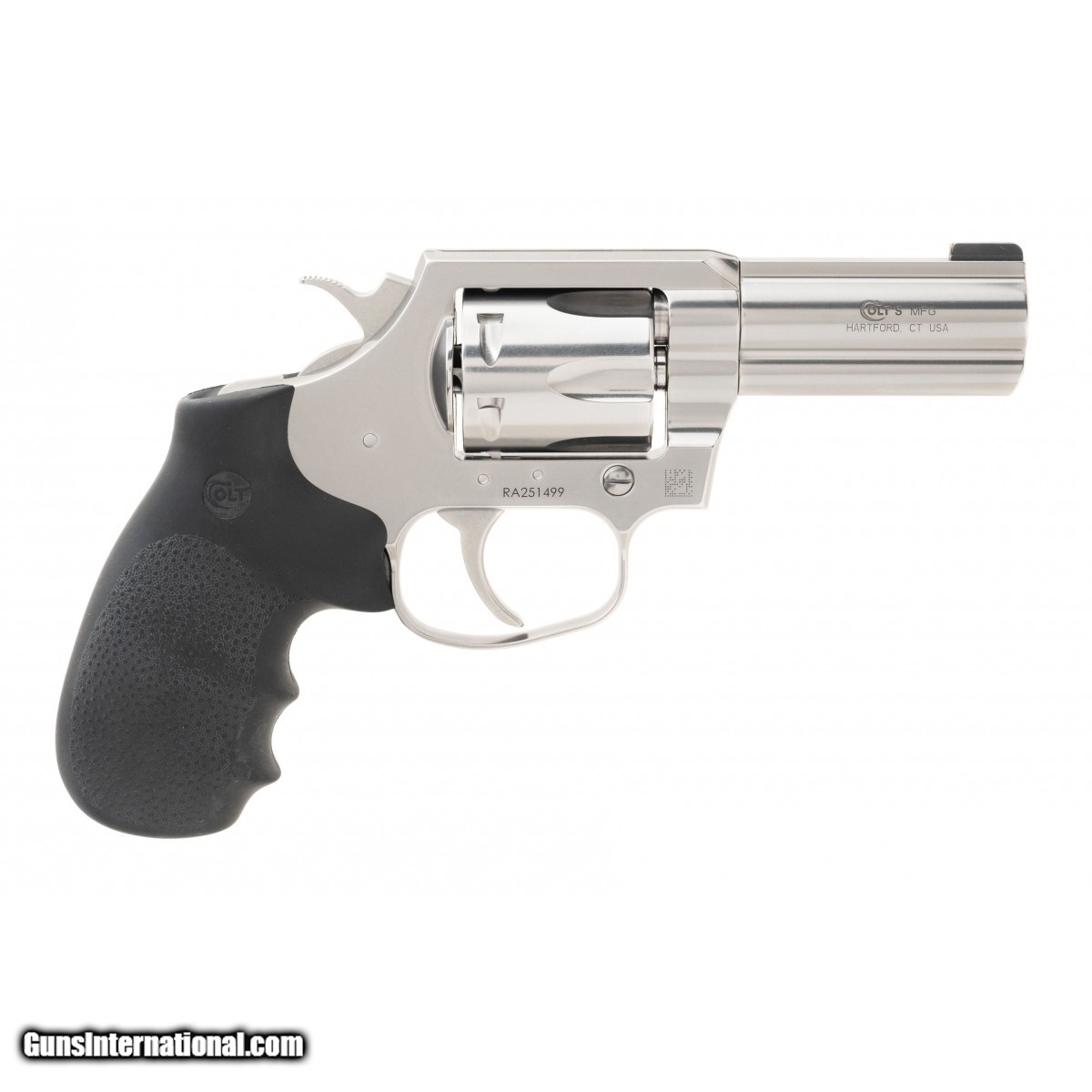 SN: RA251499. Modern production. .357 Magnum with a 3"" barrel, bore is excellent. Double action revolver with polished stainless finish, gold bead front sight and black rubber grips. Overall excellent condition. Comes with box and wood grips.