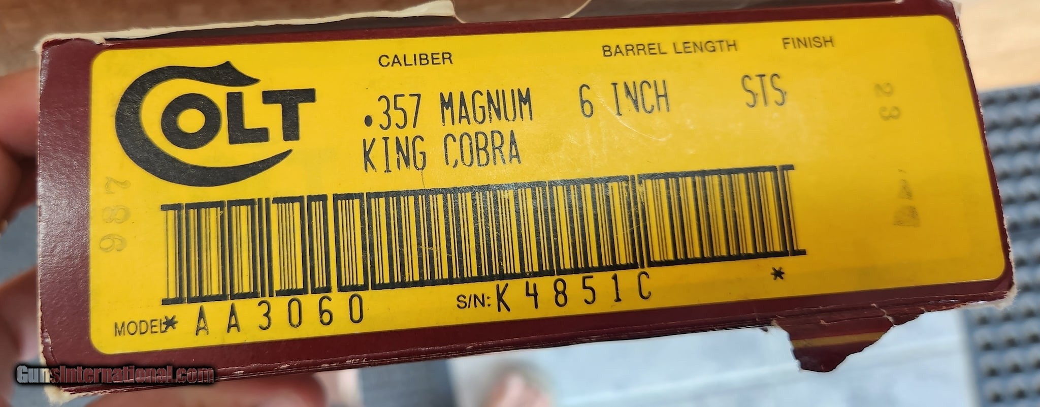 Description: Guns Listing ID: 867250 Great Condition With Box and Papers Made is 1988 SOLD Manufacturer: COLT Model: 1988 King Cobra Caliber Info: .357 MAG Condition: Used - Non-Certified Barrels: 6 BARREL Finish: STAINLESS |