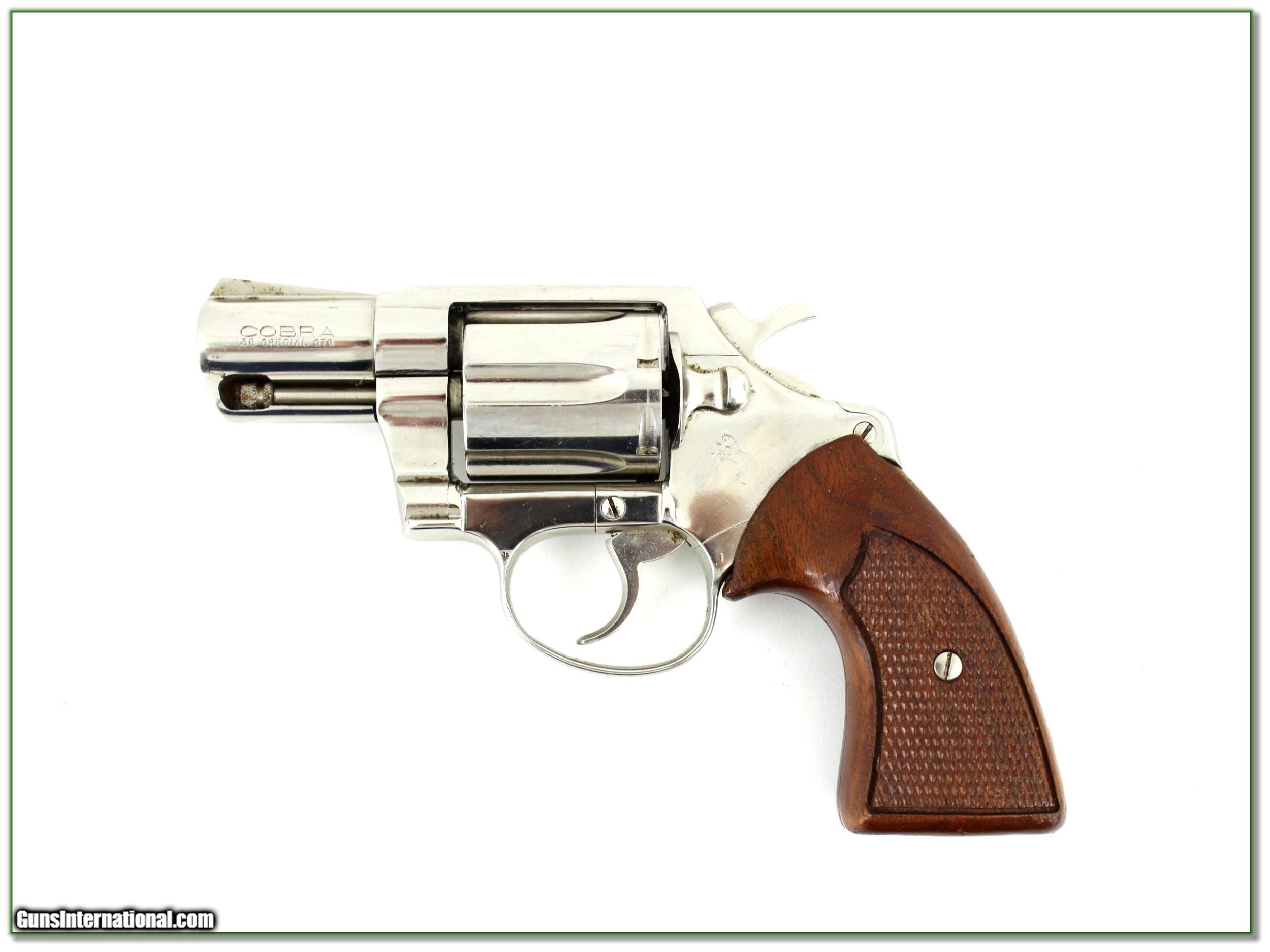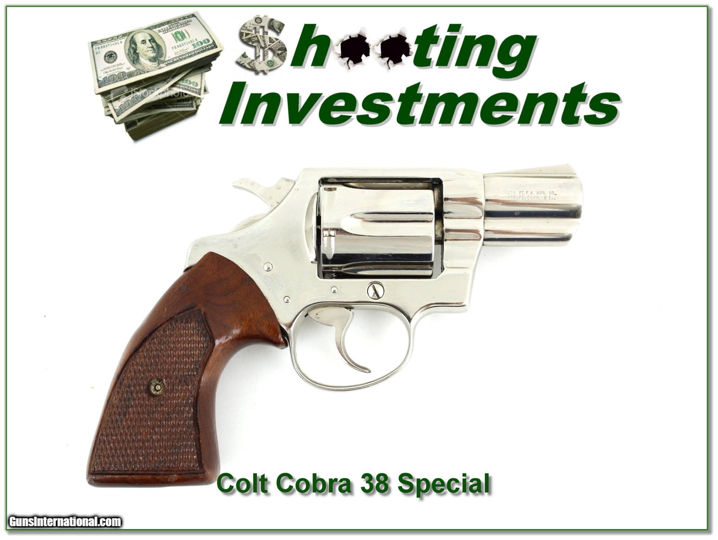 Description: This is an excellent used Colt Cobra 38 Special. It has a 2in barrel and a bright nickel finish. It locks tight and will make a classic lightweight carry gun. They just don’t make them like they used too! Shipping and insurance is $39. Please email me with any questions or larger pictures. (Consign your quality firearms with Shooting Investments for only 12%! Let me know if you have any you would like to sell!) 20-0235 Payment: Payment is by Money Order, Cashiers Check or Personal Check. I can now also accept Credit Cards (MasterCard, Visa, Discover & American Express) with a 3% convenience fee. PayPal can be used for some items but never for firearms. Shipping: The shipping charge will be listed in each description. It is $39 for most firearms. Some heavy guns or those insured for over $2000 will be higher. Shipments to Alaska and Hawaii are higher because air shipment is required. Most firearms are shipped on Tuesday and Thursday and usually in 5 days of receipt of payment. We package all shipments carefully and insure them. Optics are shipped Priority Mail and most other non-firearm shipments are shipped First Class. Returns: Our return policy is simple. If for any reason you are not pleased with your purchase, you may return your item for a full refund of purchase price. Ammunition cannot be returned. It is important to us that you are happy. Guns cannot be fired or dissembled before returning them and they must be returned in the same condition as received. Notification of a return must occur with-in 3 days of receipt at your dealer. Shipping, convenience and dealer fees are not refundable and are the responsibility of the buyer. Lay-a-way: If needed, we offer a 60 day lay-a-way option on most firearms. It is 1/3 now, 1/3 in 30 days and 1/3 in 60 days. Lay-a-way firearm sales are final and if not completed the first payment cannot be returned. Consigning your firearms with Shooting Investments: We will help you get top dollar for your firearms. While most local guns shops charge 20% or more, our fee is only 12% with a minimum of $75. At your local gun shop it might take months to sell. Selling on-line provides instant access to thousands of interested buyers. You won’t find any other on-line dealer willing to sell your firearms for only 12% or listing every gun on 3 separate s. Selling through an House typically costs the seller 15% and the buyer an addition 15% (so 30%) and you have to wait several months to sell and longer to receive funds. If properly priced, we will sell your firearms in a few weeks. Send us an email or give us a call and we’ll explain how easy it is for you to get top dollar. Trading: Trading for use is really just buying your gun to re-sell. If you have a gun you want to trade, please email a picture and we will let you know what we can give or it. You will always get more if we sell it for you on consignment. Help for California Buyers: We are happy to ship to California. It is the buyer’s responsibility to make sure any item you buy is legal in your state. We are also happy to help with your purchase of a firearm from someone other than us. If you see a gun you would like to buy but the seller can’t or won’t ship to California they can ship to use and we’ll then ship it to your California dealer. The cost for this service is only $30 + shipping. Let us know if we can help! SOLD |