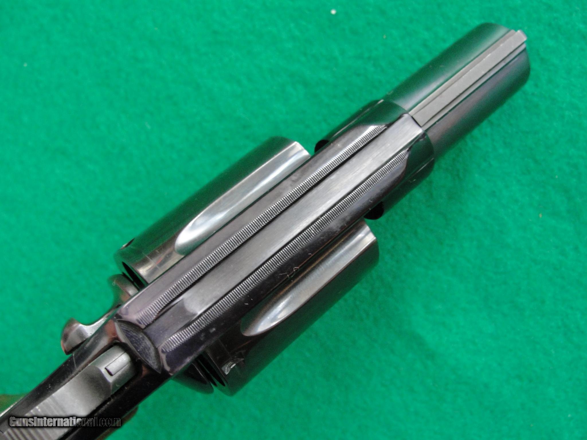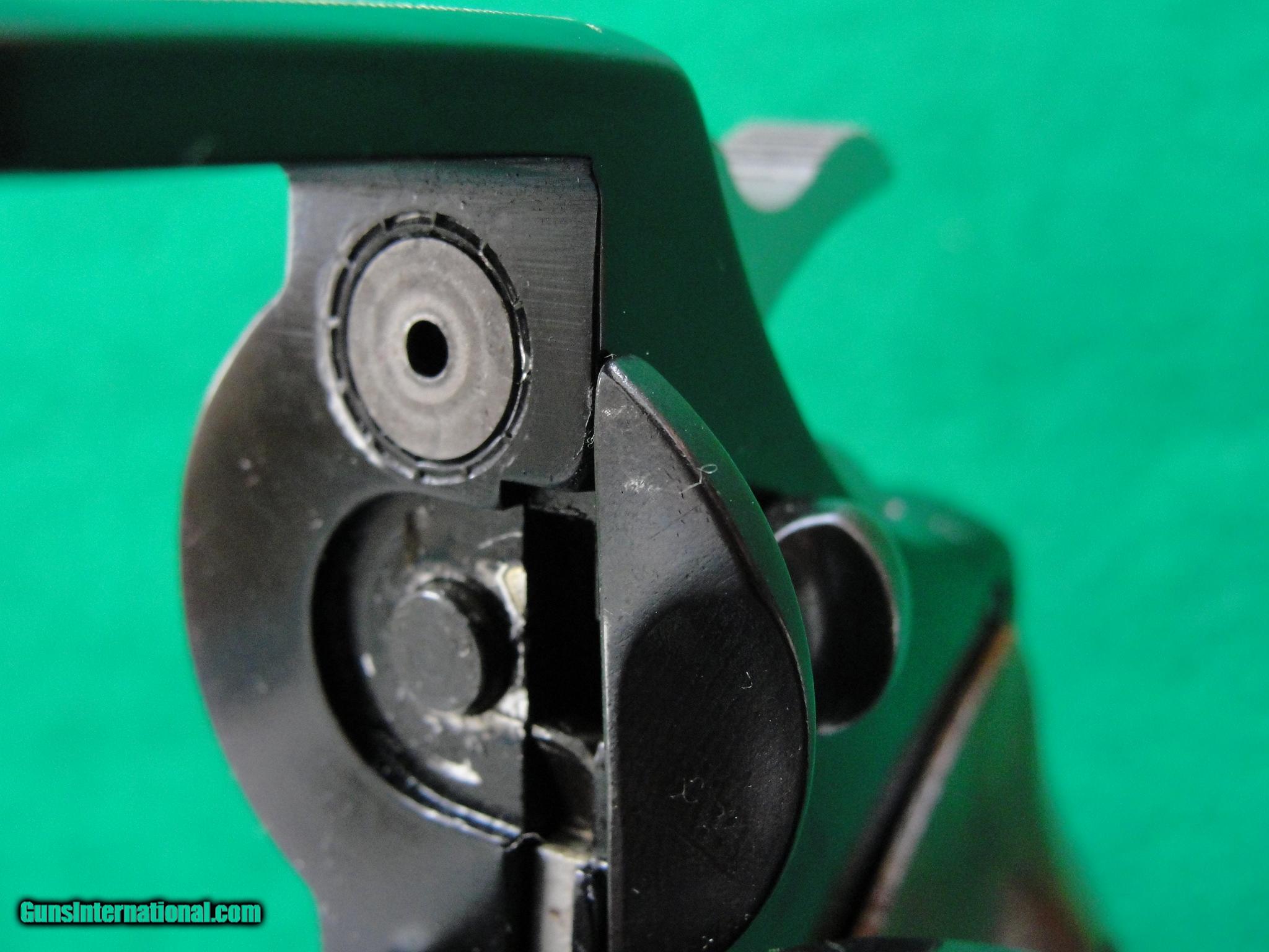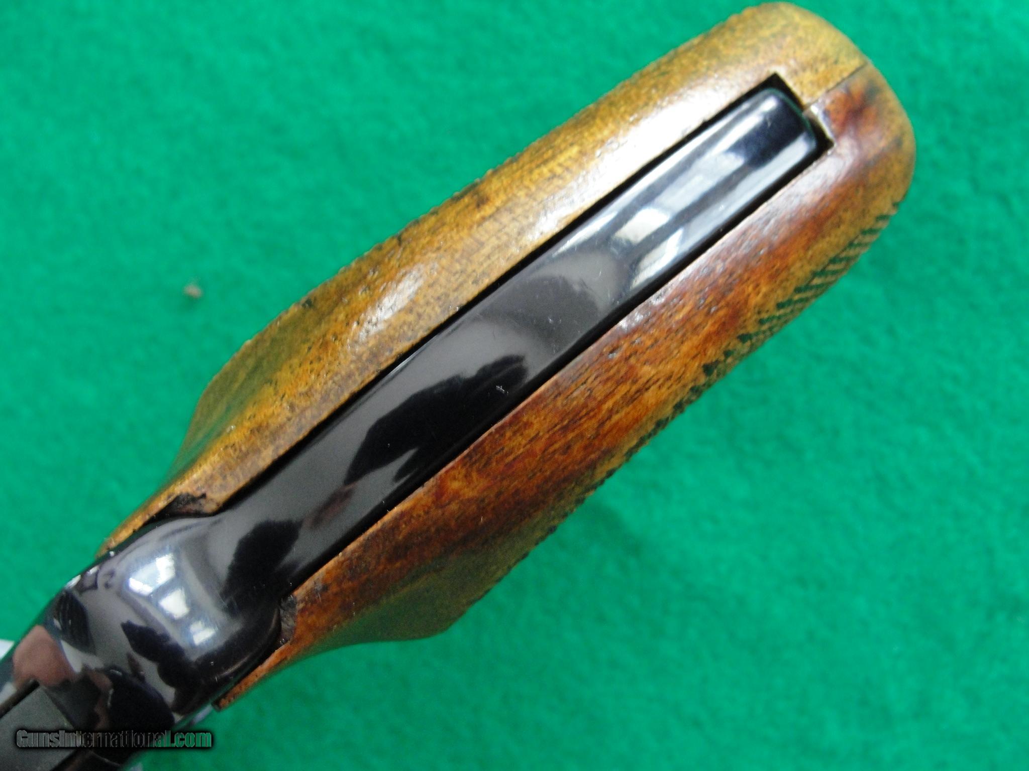 Description: Nice presentable example! Hasn't been shot much, by looking at the breech face condition, and muzzle/forcing cone. Alloy frame retains excellent black finish, with only a few small handling marks, and some thinning on the trigger guard and RH side above the trigger. Nice slick action, tight lock-up, EXCELLENT bore and chambers. Blueing on the steel barrel and cylinder is beautiful, with just a faint turn line on the cylinder. Fine wood factory grips, great checkering and crack-free. Also comes with a set of Pachmayr "Presentation" finger groove grips, which make this light revolver less painful to shoot! #600xxB made in 1970. CA sale OK as PPT in the SF East Bay Area. SOLD |