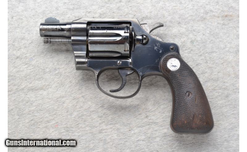 Description: This Colt Model Cobra is a 6 shot blued double action revolver in .38 Special Cal. It has a 2 inch barrel and checkered walnut grips. Has a blade front sight and an integral notch rear sight. SOLD Caliber Info: .38 Special Chambers: 6 shot blued fluted cylinder. Metal Condition: Has rust, pitting and handling marks. Wood Condition: Has handling marks and wear. Bore Condition: Good. Barrels: 2 inch blued with front sight. Triggers: Single Action / Double Action. Grooved. Stock: Diamond checkered walnut grip with silver Colt horse medallions. Weight: 22 oz. Sights: Blade front. Integral notch rear. Item Location: Richfield, WI |