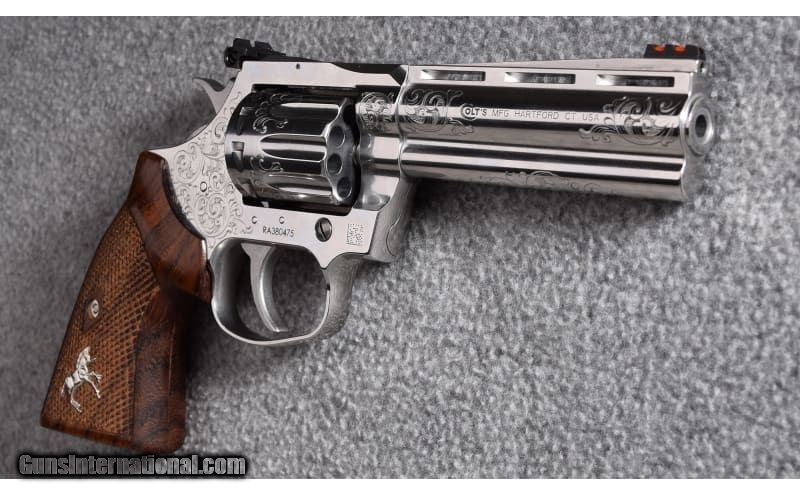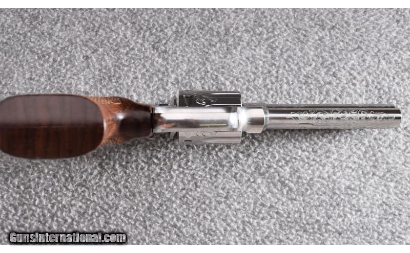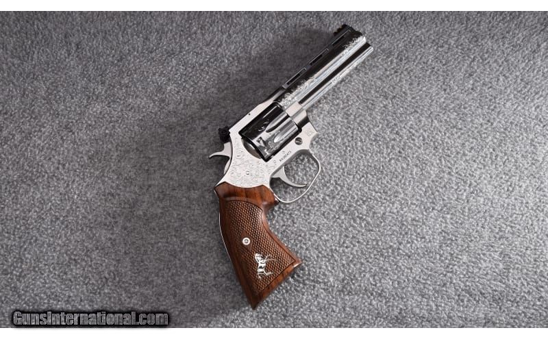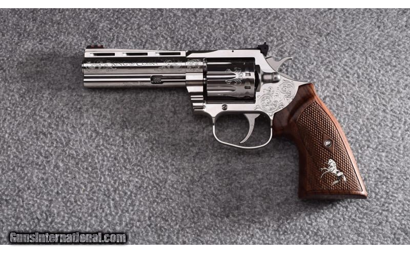 Description: This Colt King Cobra in .22 Long Rifle is in excellent condition. It has detailed scroll engraving and a vent rib style barrel. The wood grips show the classic Colt "prancing pony" emblem. NO box. .22 Long Rifle SOLD Metal Condition: Excellent Wood Condition: Excellent Bore Condition: Excellent Barrels: 3.5 Triggers: Factory DA / SA Butt Pad: Checkered Wood Grips With Colt Prancing Pony Emblem Weight: 36 Oz Sights: Fiber Optic Red Front - U Notch Rear Adjustable Item Location: Wheeling |