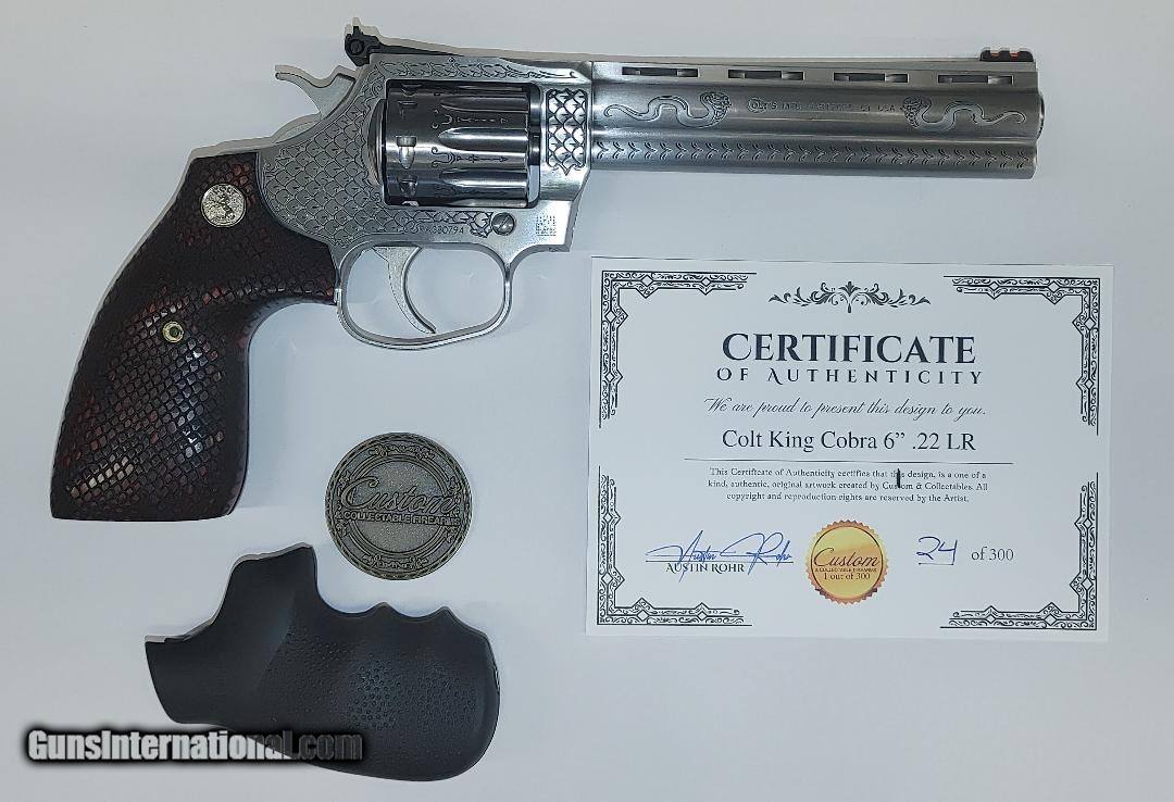 Description: Guns Listing ID: 500793 THIS IS A BRAND NEW FIREARM THAT HAS BEEN SPECIALITY ENGRAVED. Colt‚‚s Manufacturing, Colt King Cobra, Double Action/Single Action, Revolver, 22 LR, 6\" Barrel, Stainless Steel, Silver, Black Grips, 10 Rounds SPECIAL ENGRAVED BY CUSTOM & COLLECTABLE FIREARMS 6\" Barrel Heavy-Duty Frame Double Action/Single Action Product Description The King is back! Following the successful introduction of the Colt Cobra revolver in 2017, and marking Colt‚‚s re-entry into the category they once dominated, snake number two has arrived. Sporting a heavy-duty frame, 6-inch barrel, and brushed stainless steel construction, the King Cobra secures a new place in the legendary heritage that makes Colt double-action revolvers some of the hottest collectible firearms tod SOLD Manufacturer: COLT Model: KING COBRA Caliber Info: .22 LR Condition: Used - Non-Certified Barrels: 6 BARREL Action: SINGLE/DOUBLE ACTION Finish: STAINLESS Weight: 1.6 lbs |