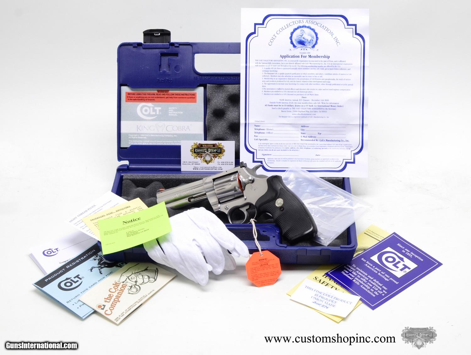 Description: Colt King Cobra .357 Mag. 4 Inch Satin Stainless Steel. AVAILABLE FOR PURCHASE AT OURSITE. CUSTOMSHOPINC Like New Condition, In Blue Hard Case With Colt Paperwork, Heavy Mil Plastic Storage Bag, Handling Gloves And Bonus Colt Collectors Association Letter. Medium Frame Double Action Revolver. Based On The Venerable Trooper. Outstanding Example Of A Highly Sought-After Colt Snake! SPECIFICATIONS