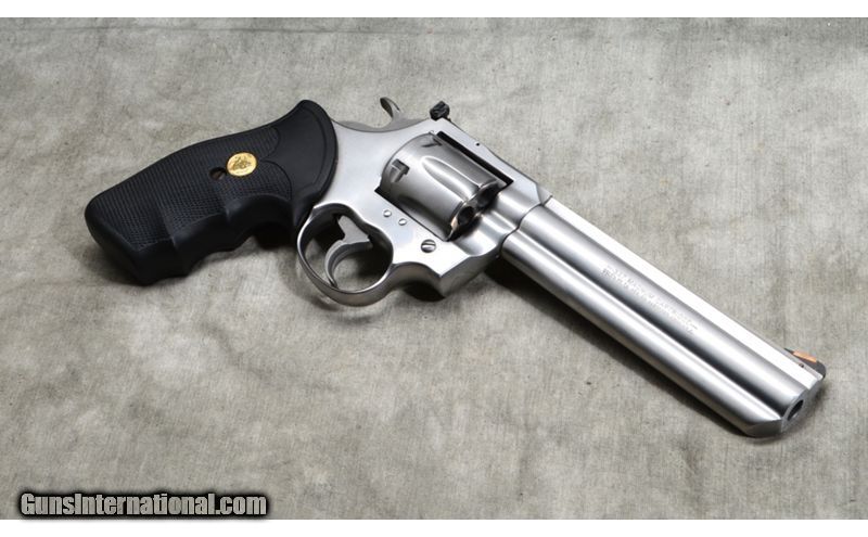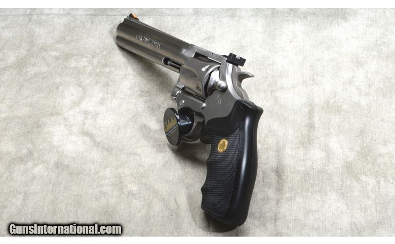 Description: Make a great walk about holster gun for anyone who hunts, hikes, or fishes. .357 Magnum SOLD Chambers: 6 shot revolver. Metal Condition: Very good. Light turn line and firing residue on the cylinder face. Wood Condition: Excellent. Bore Condition: Bright and shiny. Barrels: 6-inch satin stainless steel Triggers: Grooved single/double action trigger. Butt Pad: Finger groove combat style rubber grips. Sights: Serrated ramp with red insert front sight, and adjustable notch rear sight. Item Location: Rogers |