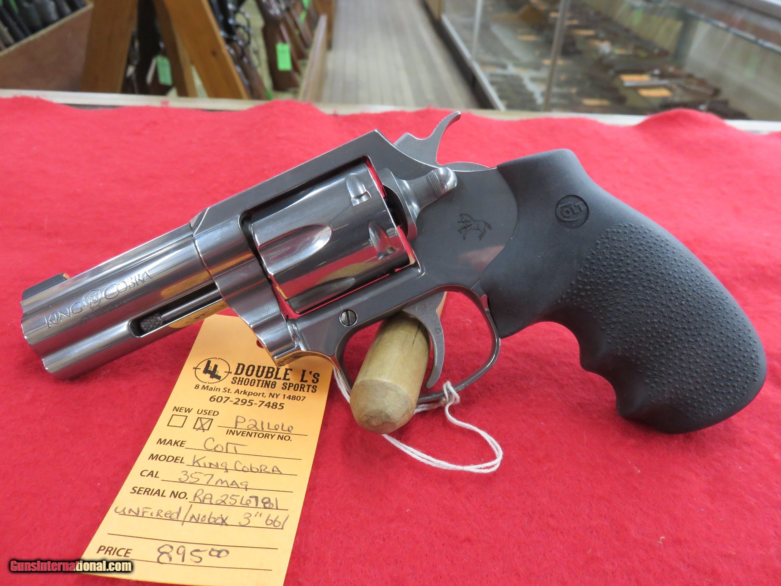 Description: Colt King Cobra, 357 Mag, 3" barrel, stainless, black rubber (colt) grips, as new condition, no box, $895.00 + $50.00 shipping SOLD |