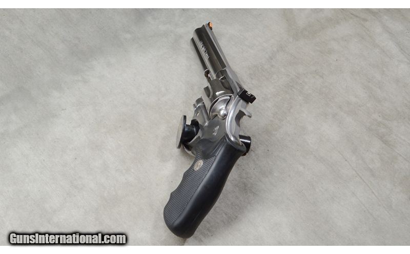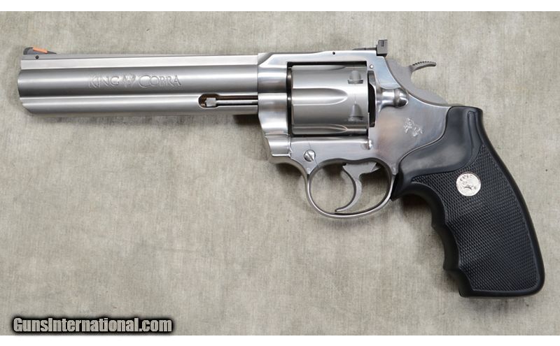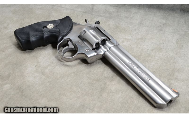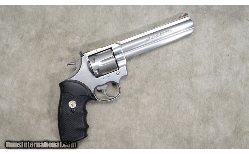 Description: This stainless steel revolver is in excellent condition. It appears unfired and handling marks are limited to a light turn line. It has rubber combat grips. Manufacture date is 1994. .357 Mag SOLD Chambers: 6 Metal Condition: Excellent. Wood Condition: Excellent. Bore Condition: Shiny and bright. Barrels: 6-inch Triggers: Factory double and single action trigger. Butt Pad: Rubber fingergroove grips with Colt medallions. Weight: 45 oz. Sights: Red insert ramp and white outline notch adjustable. Item Location: Rogers |