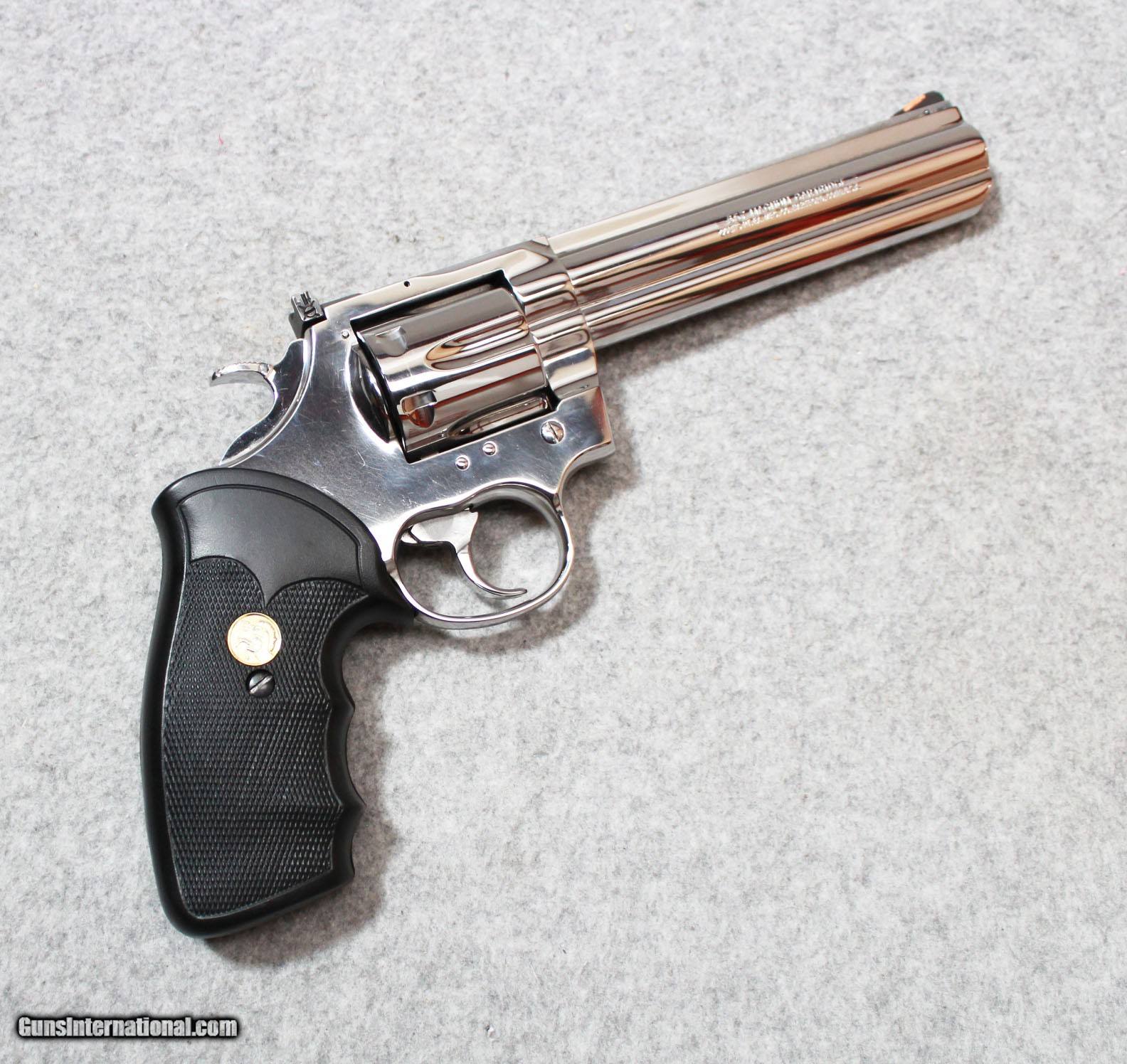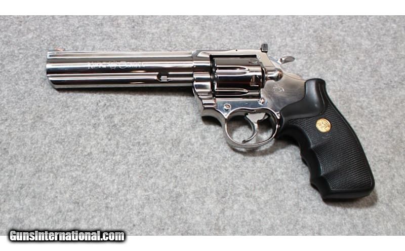 Description: Colt King Cobra double action revolver, chambered in .357 Magnum. It has a 6" barrel with solid rib and full lug. The front sight is a black blade with an orange insert, and the rear sight is a black adjustable u-notch with white outline. The black factory rubber grips have finger grooves and Colt medallion inlays. Includes factory hard case, and manual. Free shipping to any Bass Pro Shops or Cabela's store. .357 Magnum SOLD Metal Condition: Very Good with Handling Marks Bore Condition: Bright And Clear Barrels: 6 inch Triggers: Double Action Weight: 46 oz. Sights: Front: Black Blade with Orange Insert / Rear: Black Adjustable U-Notch with White Outline Item Location: Allen, TX |