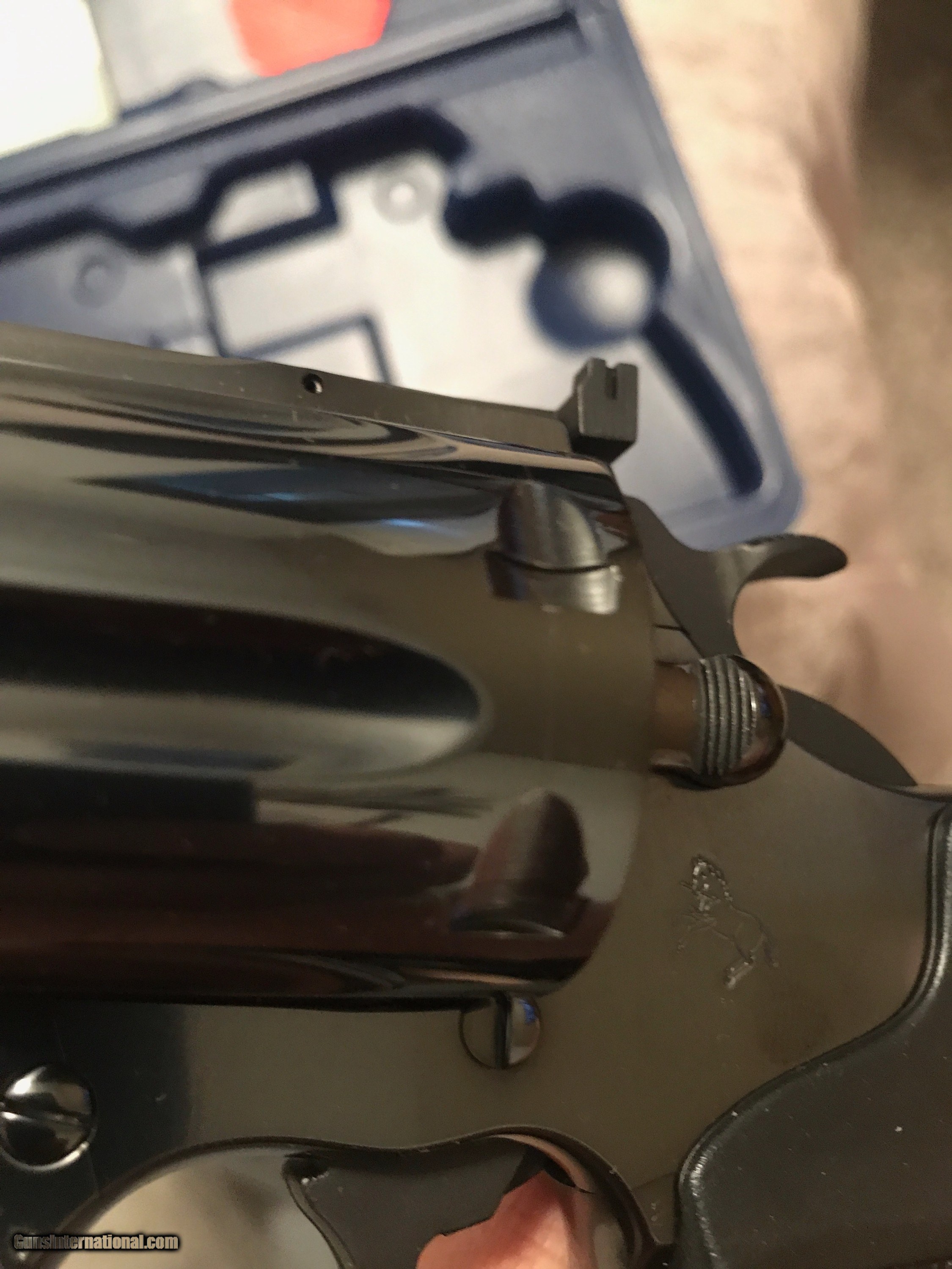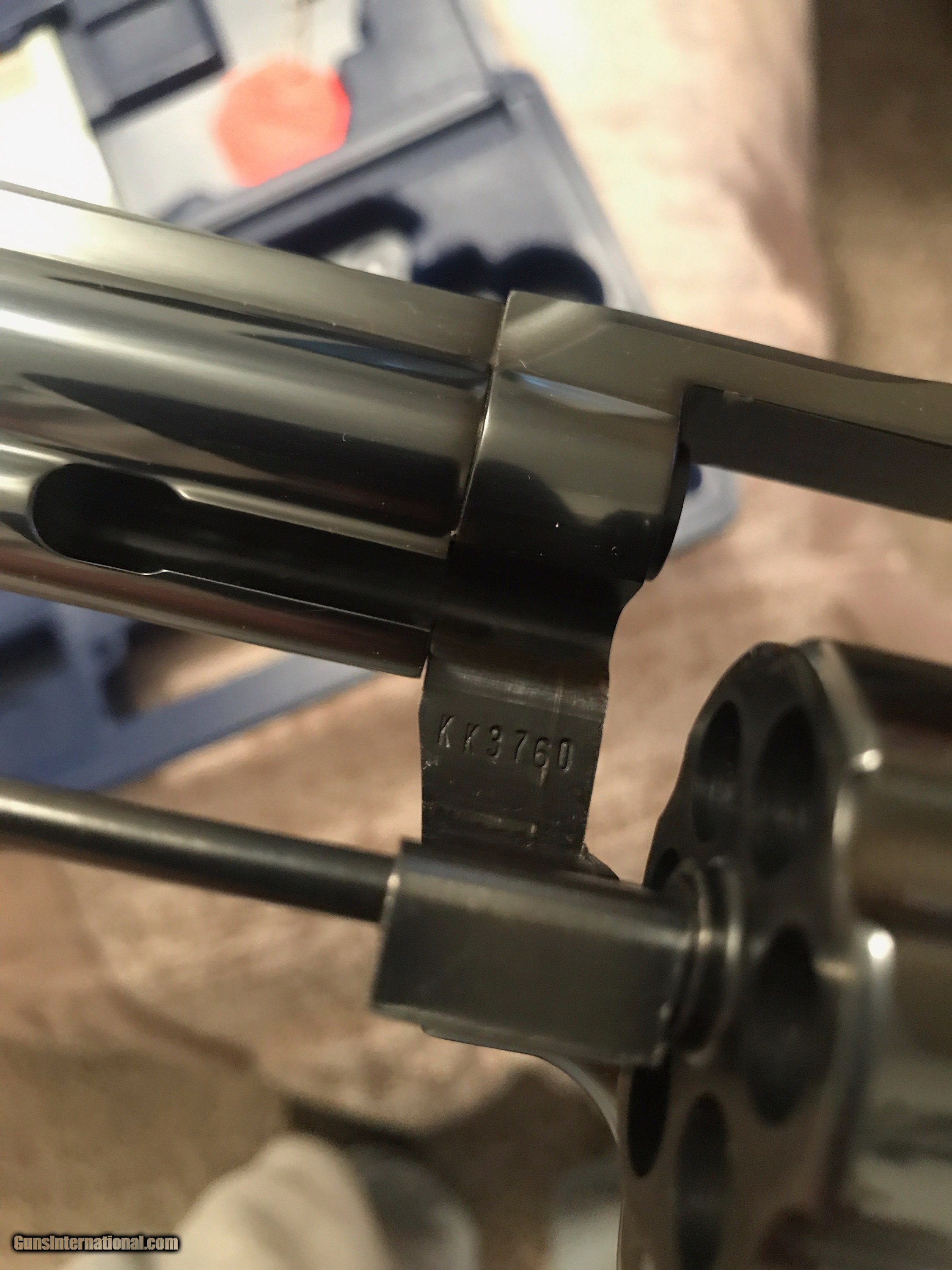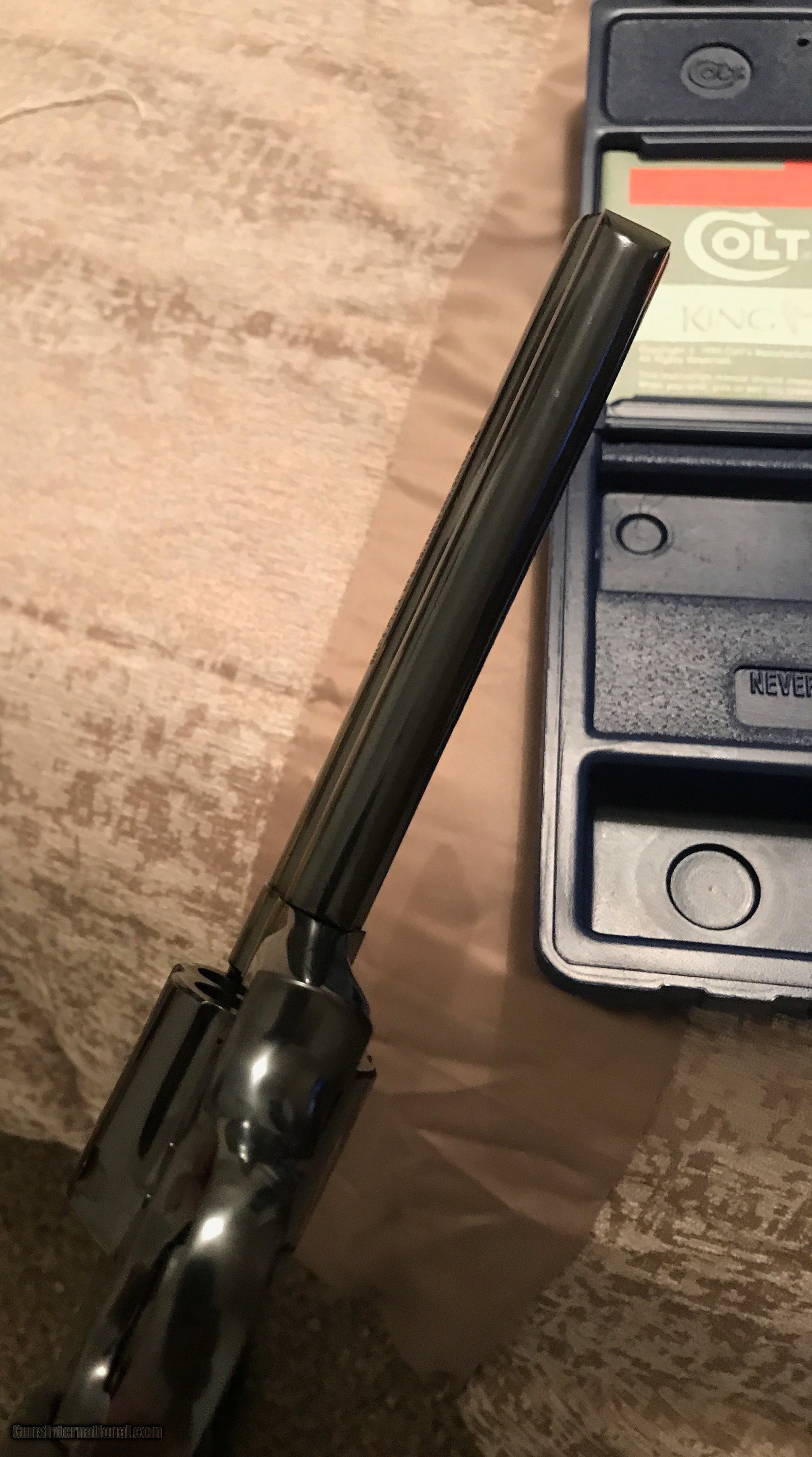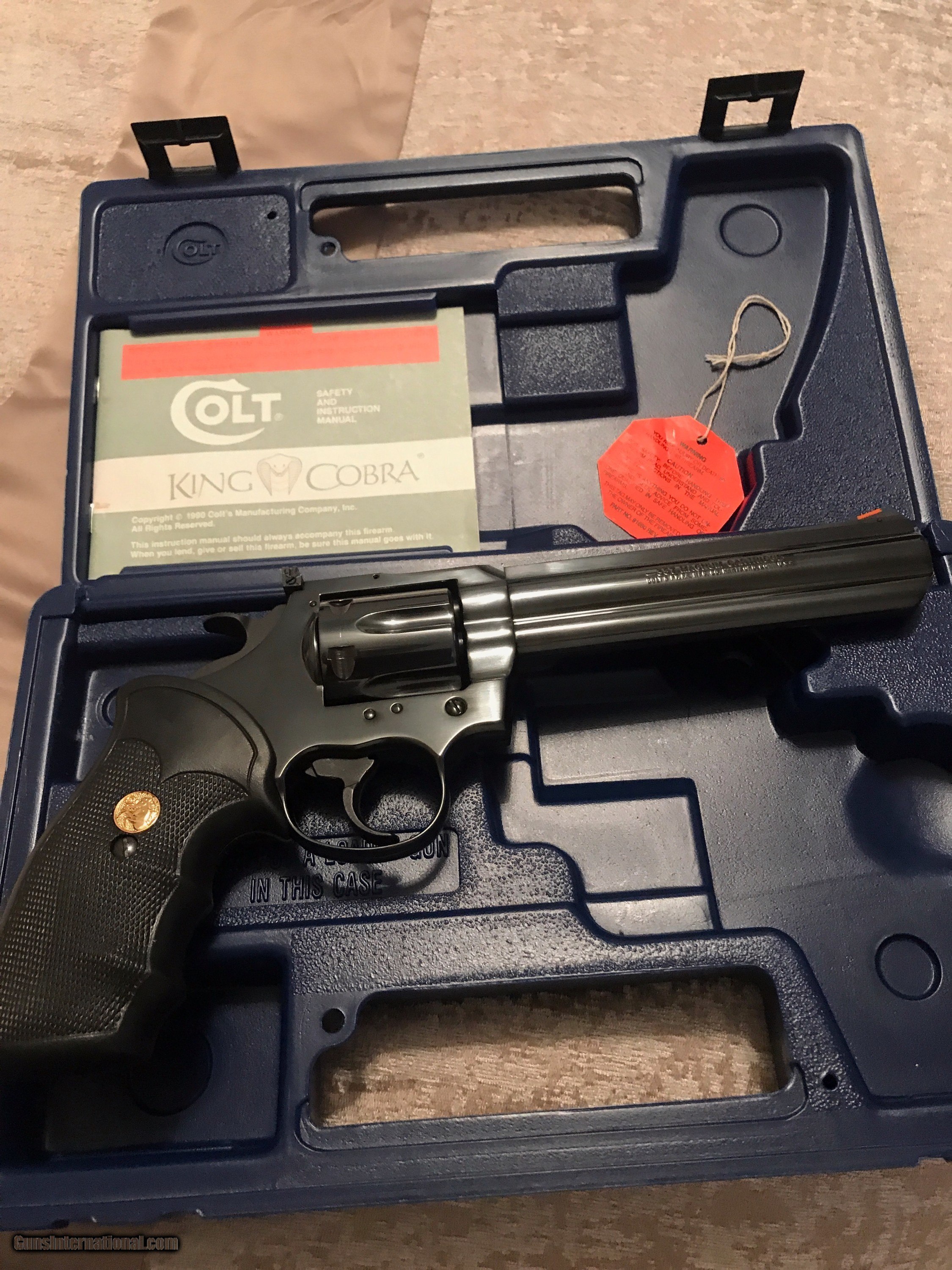 Description: Blue Kings are super rare. One in this condition is nearly unheard of. This gun has been shot but shows little sign of it. Barely a turn ring. 6 inch barrel, white outline rear sight, red ramp front sight, brilliant royal bluing, original box and numbered sleeve. Includes hang tag and booklet. A beautiful gun, worthy of any serious Colt collector. Please email with questions. Price includes shipping. SOLD Manufacturer: Colt Model: King Cobra Caliber Info: .357 magnum Condition: used Metal Condition: excellent Wood Condition: n/a Bore Condition: excellent Action: double Rib: yes Finish: blue Sights: target Item Location: 37075 |