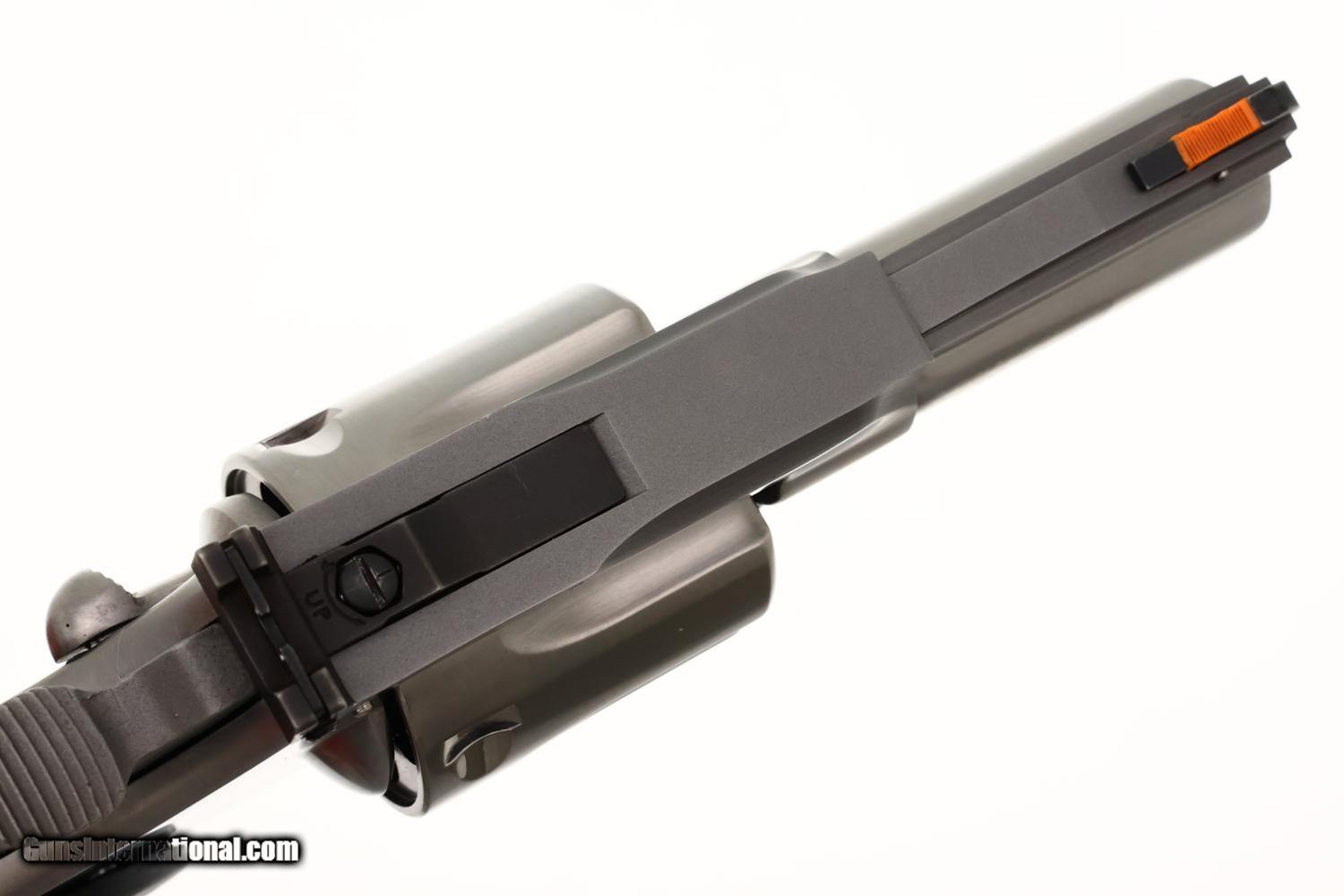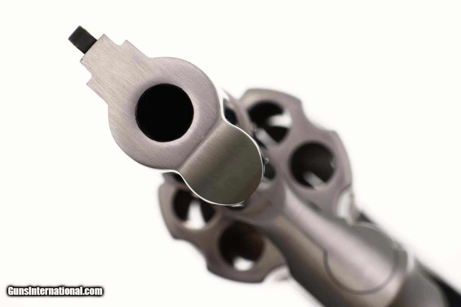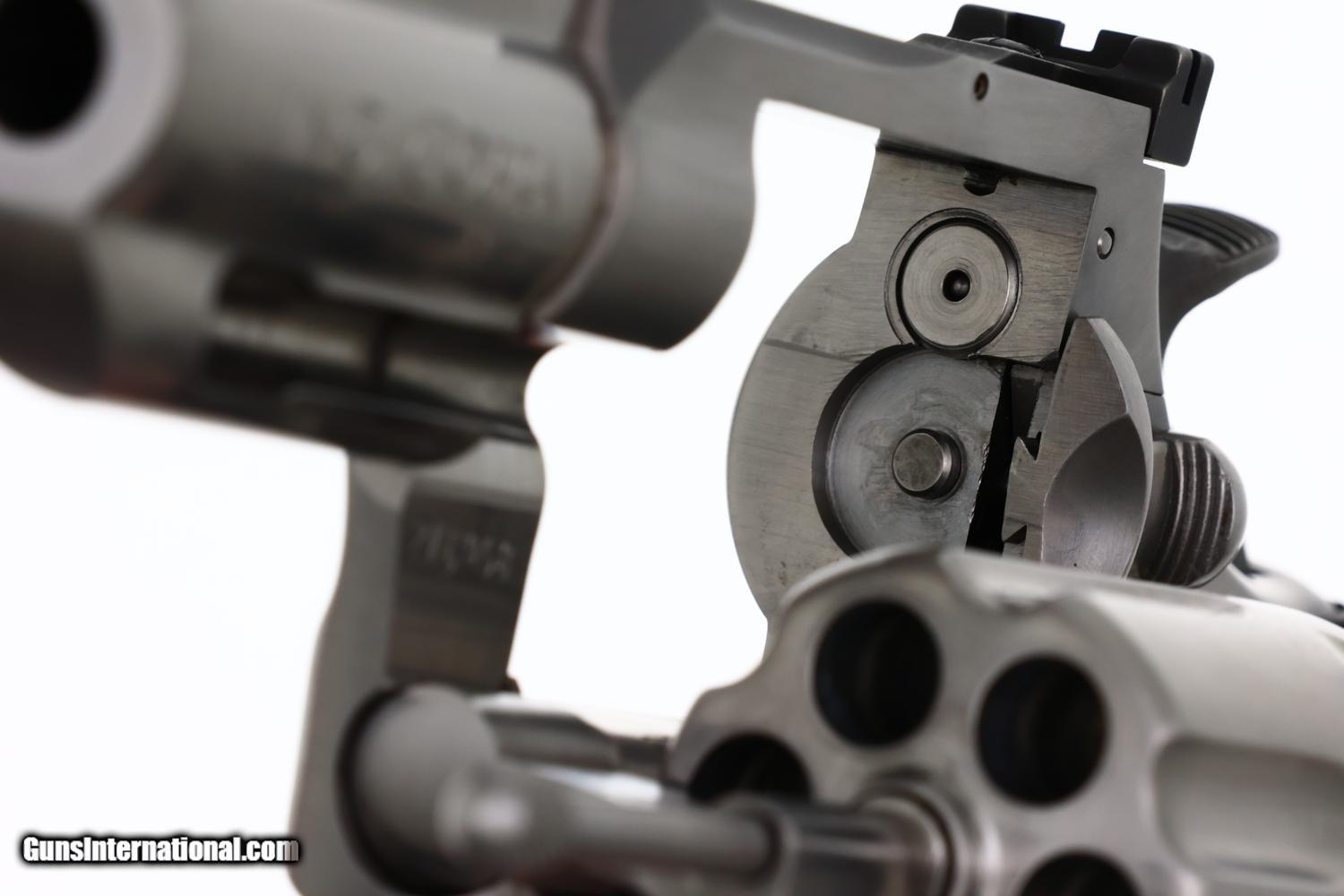 Excellent, near new, with faint sharp edge wear on the front and rear sight. Cylinder ring barely visible. Comparable condition neoprene grips. Mirror bore. Correct manual mechanics. EXC literature. Generally G box with oil staining of Styrofoam inserts, sleeve with moderate shelf wear, 3/4 end flaps missing, taped repairs as imaged.