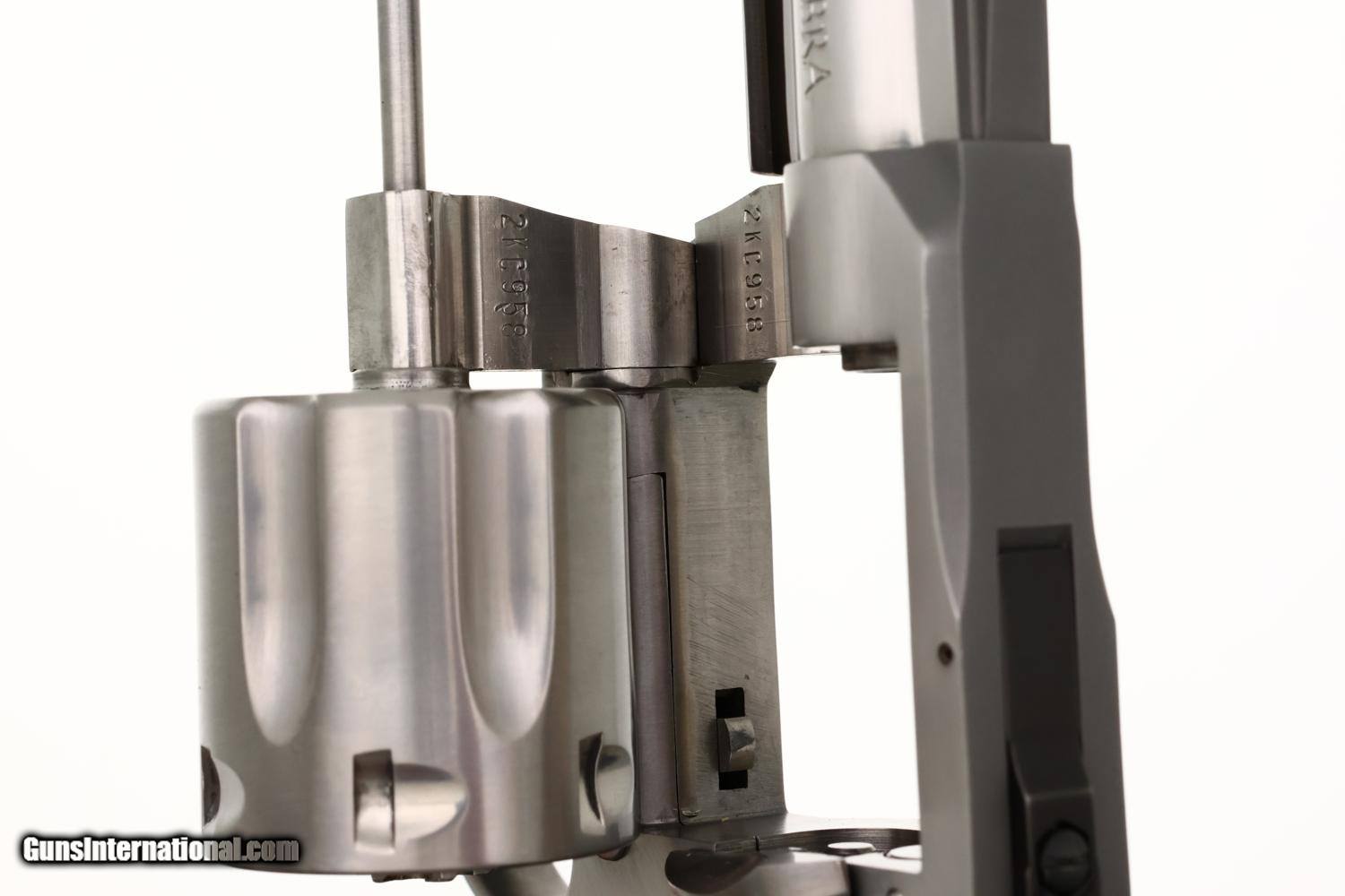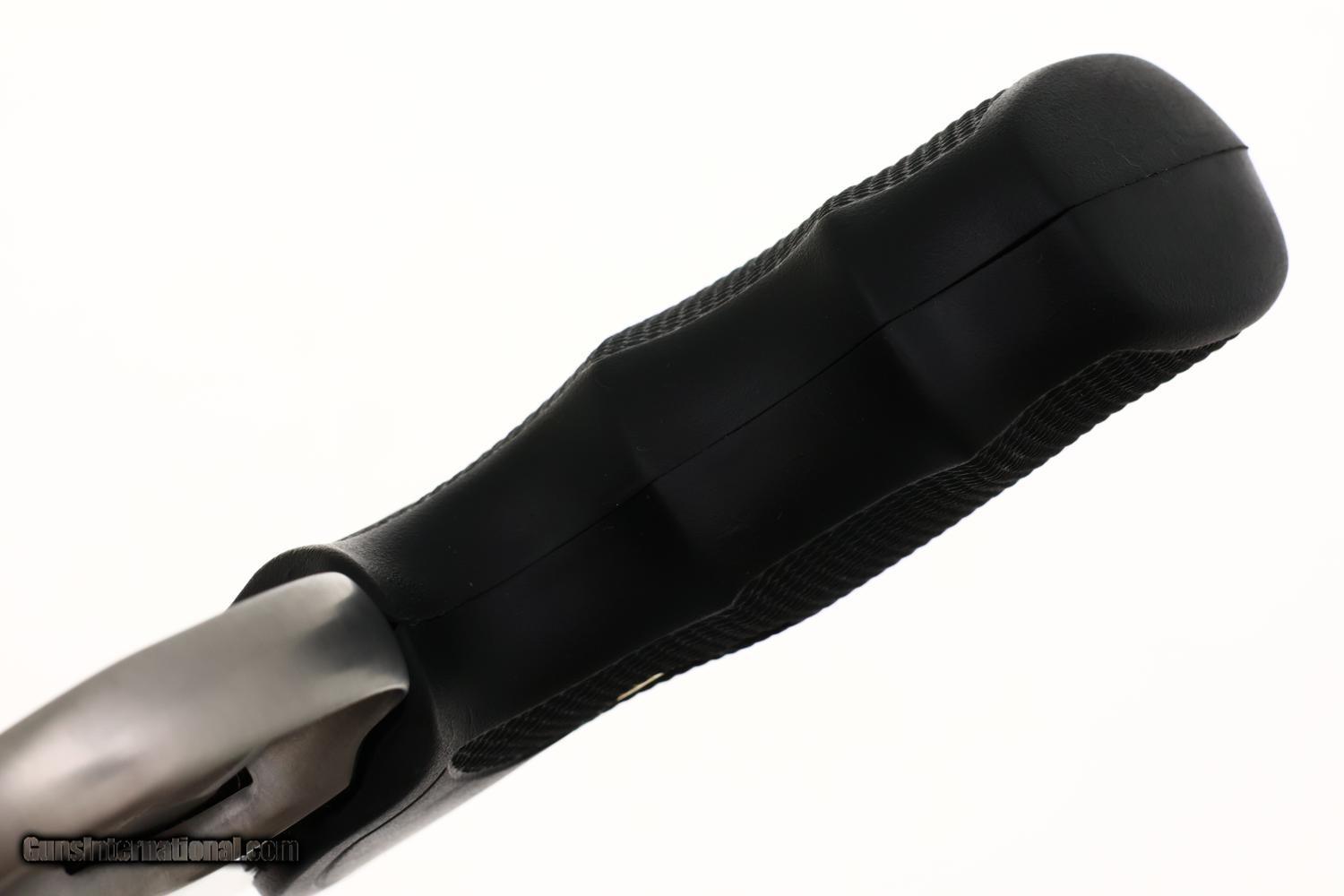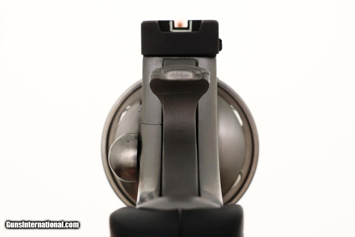 Excellent, near new, with faint sharp edge wear on the front and rear sight. Cylinder ring barely visible. Comparable condition neoprene grips. Mirror bore. Correct manual mechanics. EXC literature. Generally G box with oil staining of Styrofoam inserts, sleeve with moderate shelf wear, 3/4 end flaps missing, taped repairs as imaged.