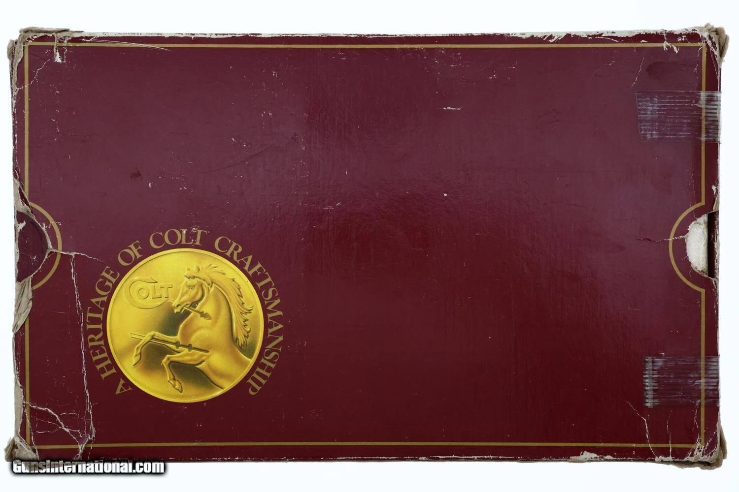 Standard configuration Colt King Cobra Stainless Steel revolver, made 1989, with 2.5" barrel, cal. .357 Magnum, SN: 2KC958, with orange/red ramp front sight and fully adjustable rear sight. The serial number "2KC958" is marked on the frame and crane while the left side of the barrel displays "KING COBRA" with a rampant Colt logo on the frame. The right side of the barrel is marked ".357 MAGNUM CARTRIDGE" with manufacturer address. Fitted with black rubber grips with gold Colt medallions. Complete with original factory box with yellow label showing model AA3020 (KING COBRA), matching serial number 2KC958, barrel length, finish and caliber to include instruction manuals and warranty information. Despite its outward similarity to the Colt Python, the King Cobra design is based upon an earlier Colt model, the venerable Trooper MK V, improved with the addition of a heavier-duty barrel, full barrel length ejection rod protection shroud, and a thicker solid rib on top of the barrel.